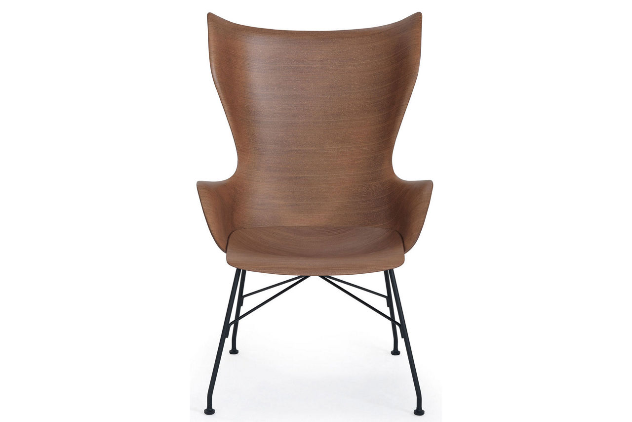 The Smart Wood collection is the outcome of Kartell's unremitting research into the possibility of giving three dimensional form to a material which so far has always been two dimensional. Using patented technology, the wood is worked with a mold designed to bring the curvature of the panel to the very edges, creating a seat with sinuous roundness, K/Wood is a royal style armchair complemented by the matching S/wood footrest with the same finishings.