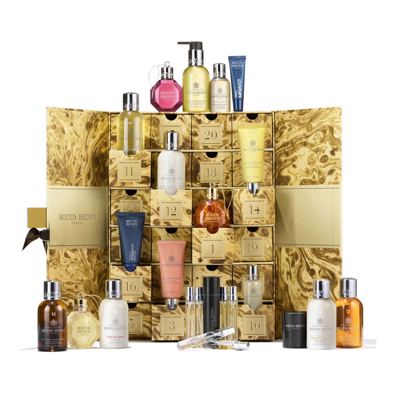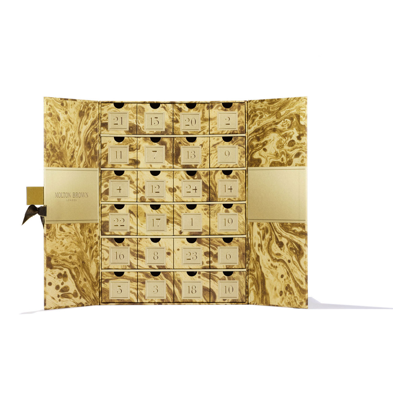 Description: Open the door to a new scented luxury each day of December with this Advent Calendar, decorated by marble artist Natascha Maksimovic and finished with a branded plaque and ribbon.