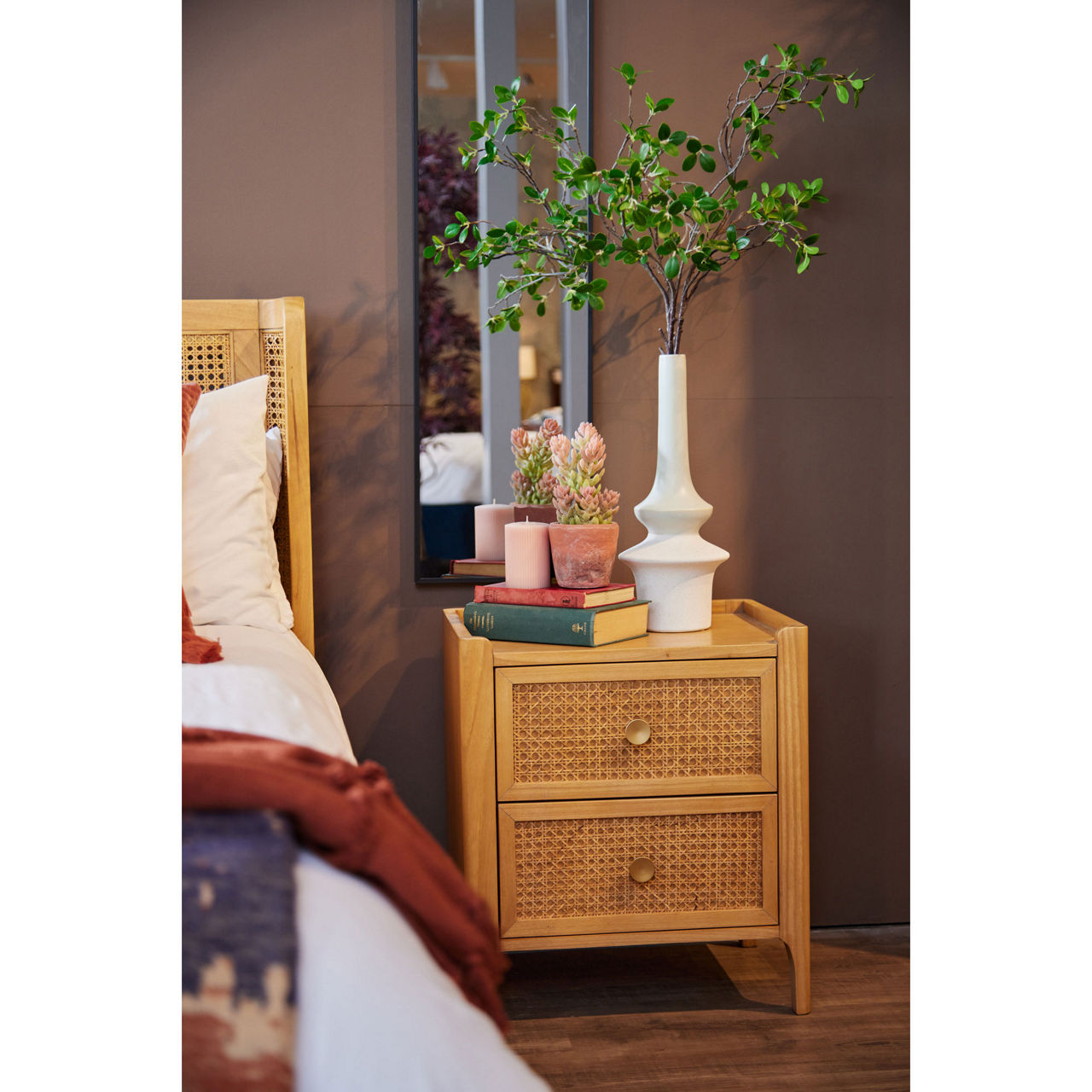 The Kawali bedroom collection is a gorgeous light mindi wood (white cedar) bedroom collection with a retro feel. The rattan-style effect across the range combined with gold accents creates a light and refreshing touch for your bedroom space, evoking a sense of warmth and sophistication. This collection exudes timeless elegance and offers a perfect blend of functionality and style to elevate your bedroom decor.