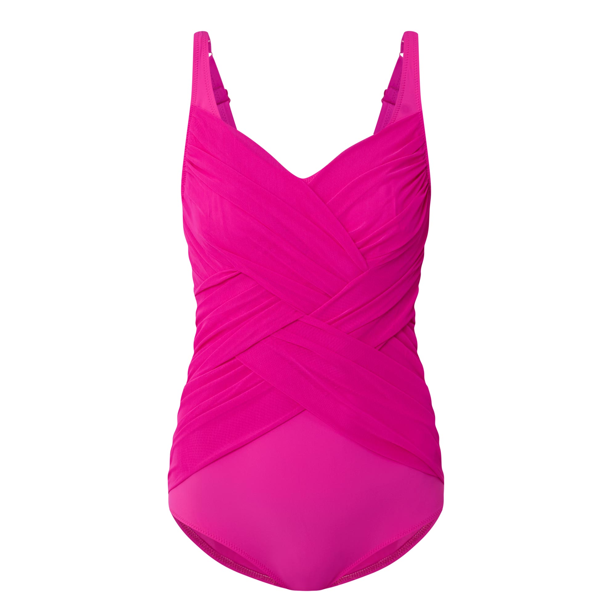 • One-piece, soft V-neckline, adjustable shoulder straps, under wired bust, gathered sections at the front, delicate tonal tulle detailing, medium coverage, slimming effect