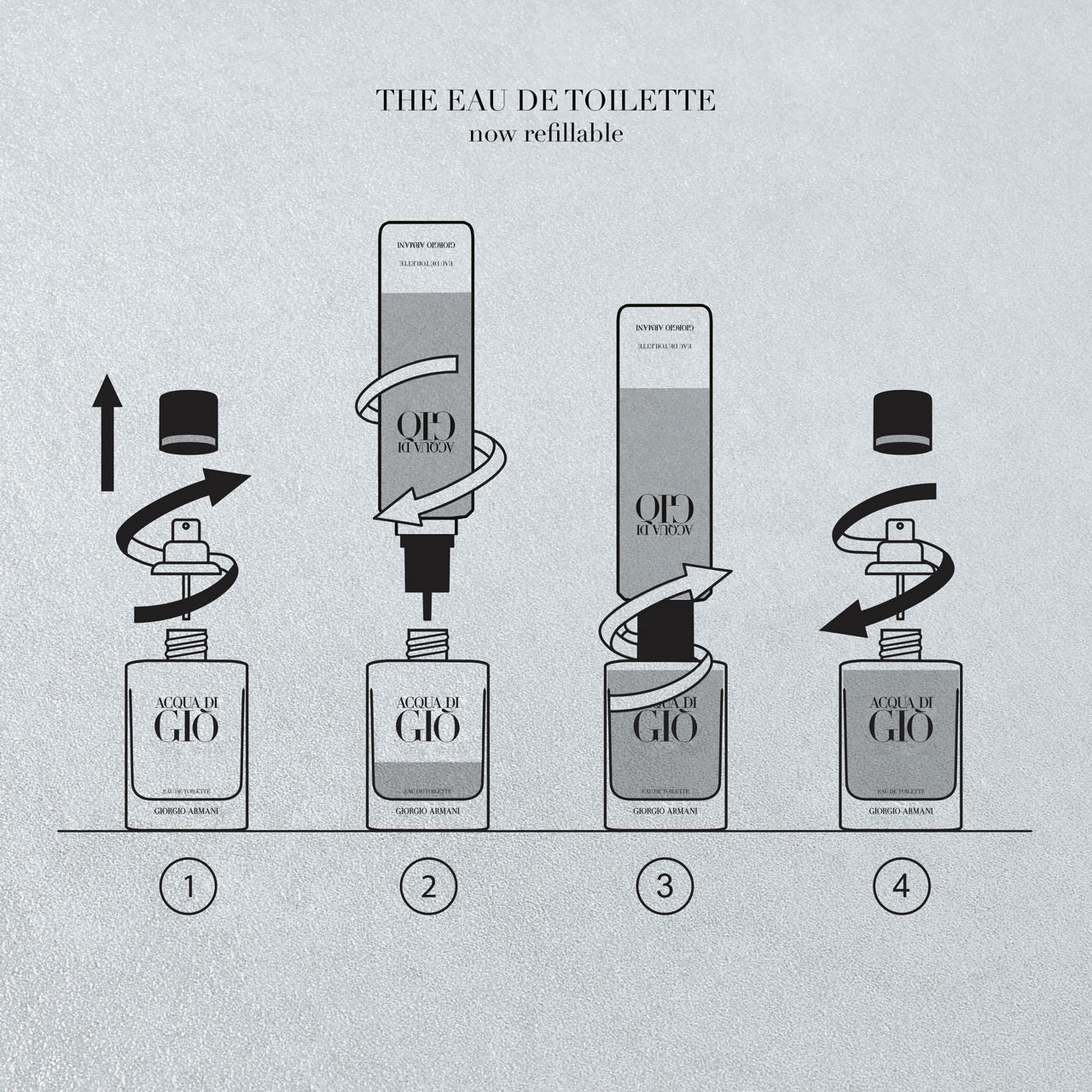 How To Use: Unscrew any format of the Acqua Di Giò Eau de Toilette and refill with this 150ml bottle. Apply on pulse point: wrist, inner elbow and neck.