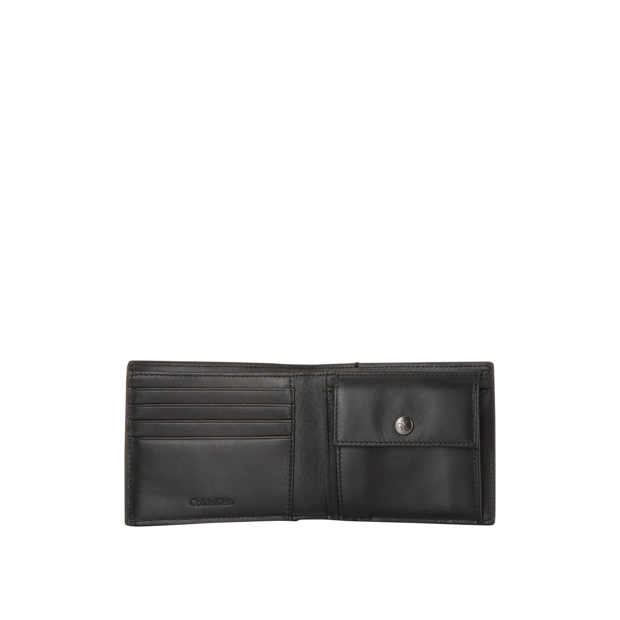 - Billfold design, smooth finish, logo detail, internal card slots, coin compartment, snap button