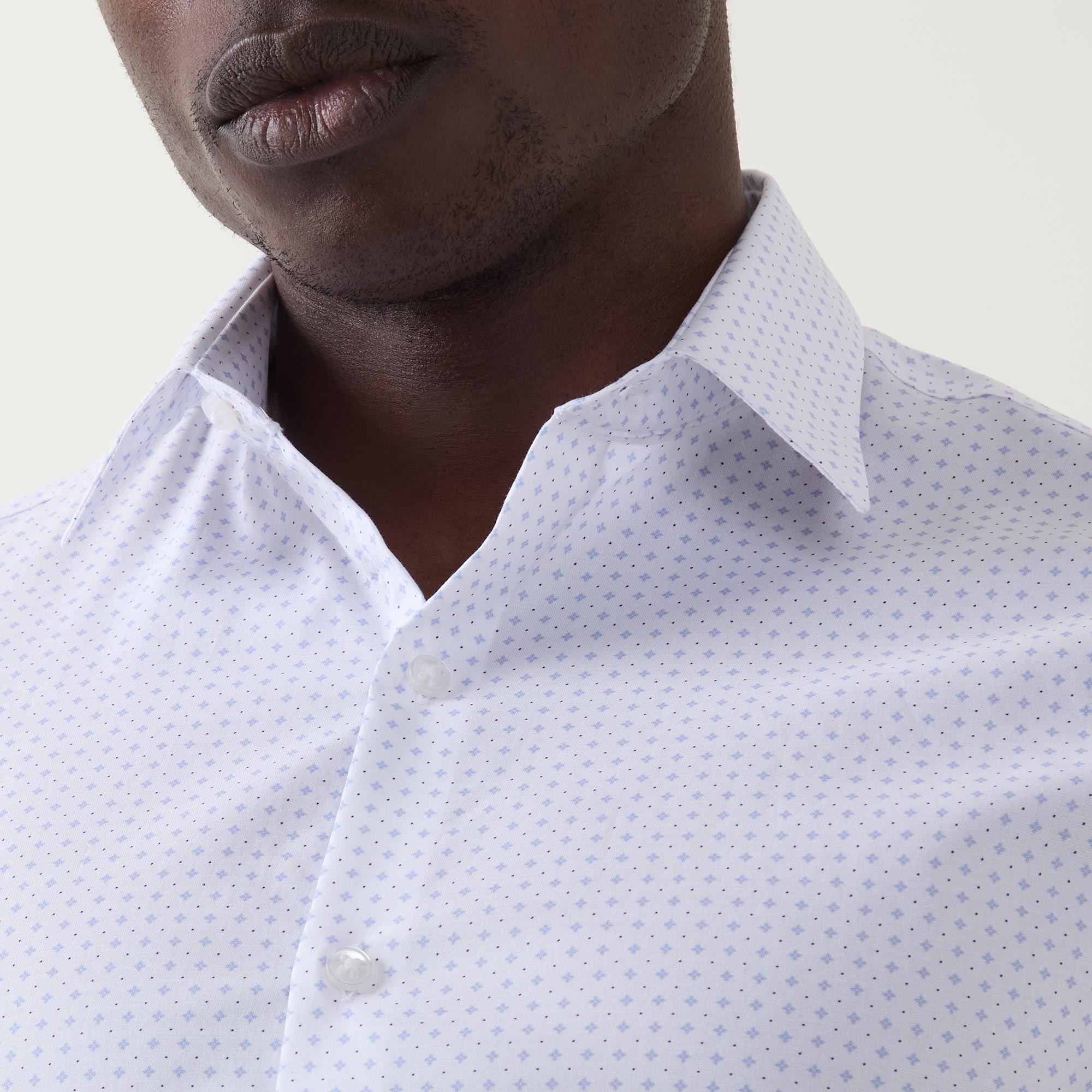 - Collared neckline, button fastening, curved hemline, long sleeves, single-cuff, geometric print, logo details