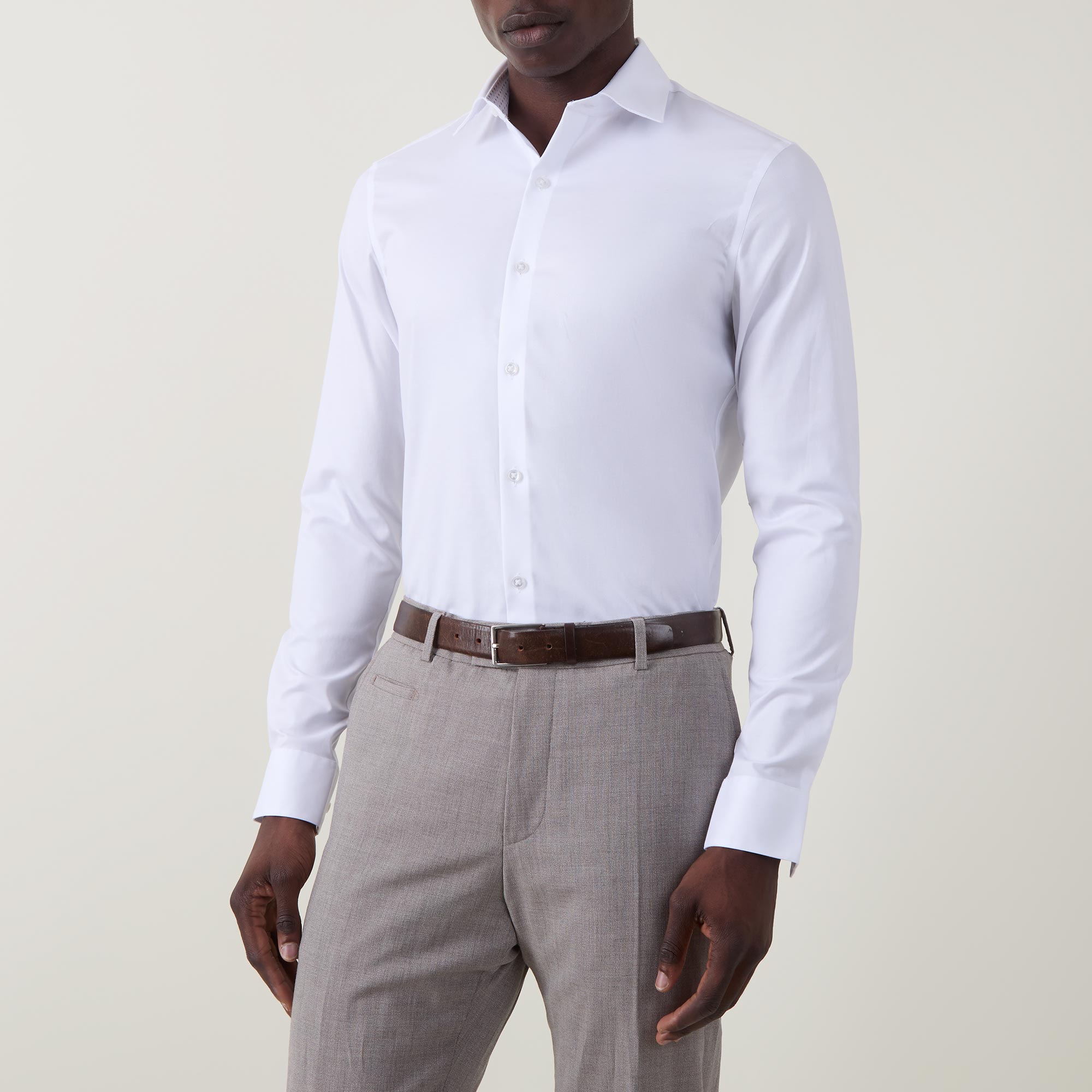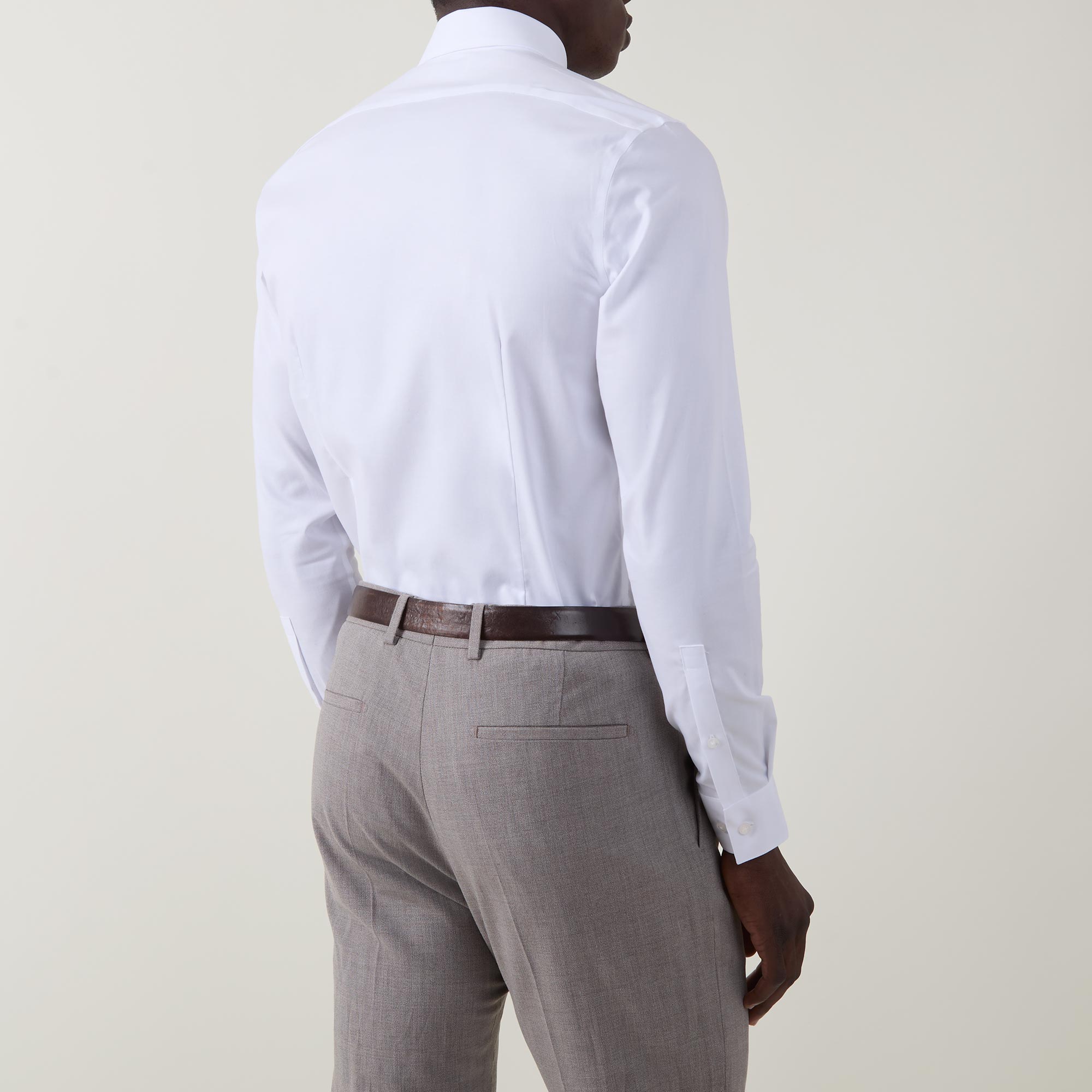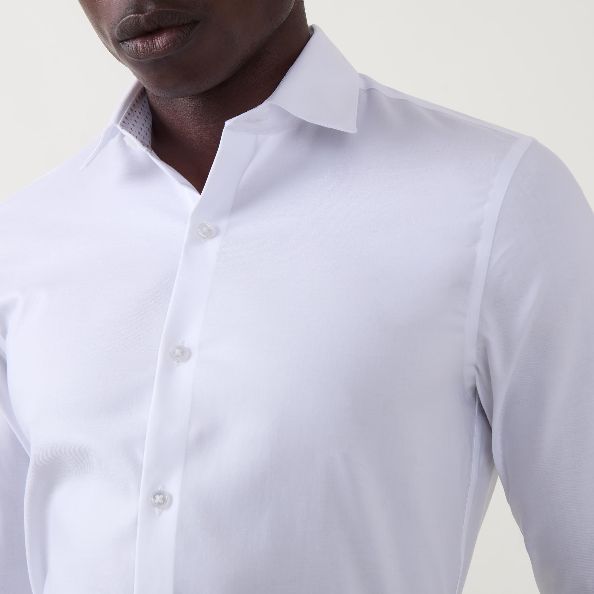 - Italian spread collar, long sleeves, buttoned cuffs, front button placket, curved hem, stretch twill fabric, tonal stitching
