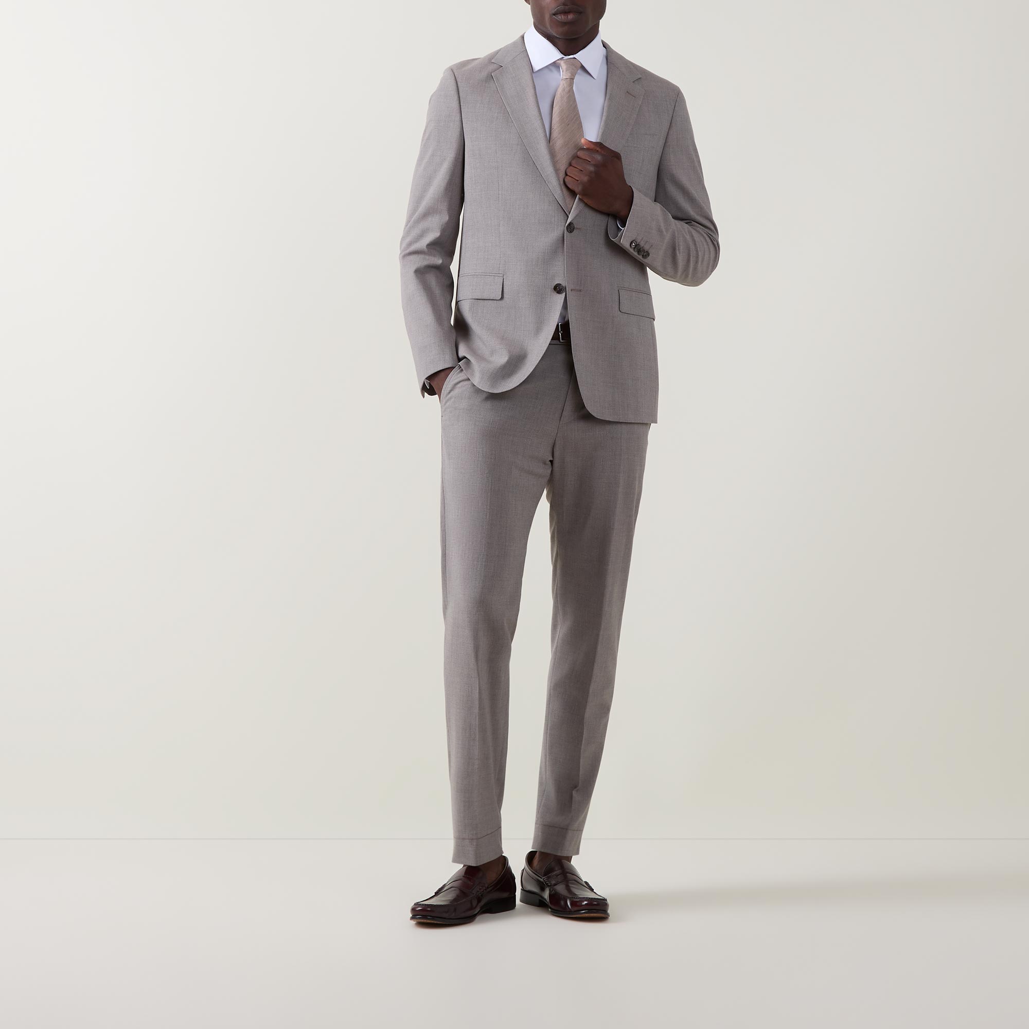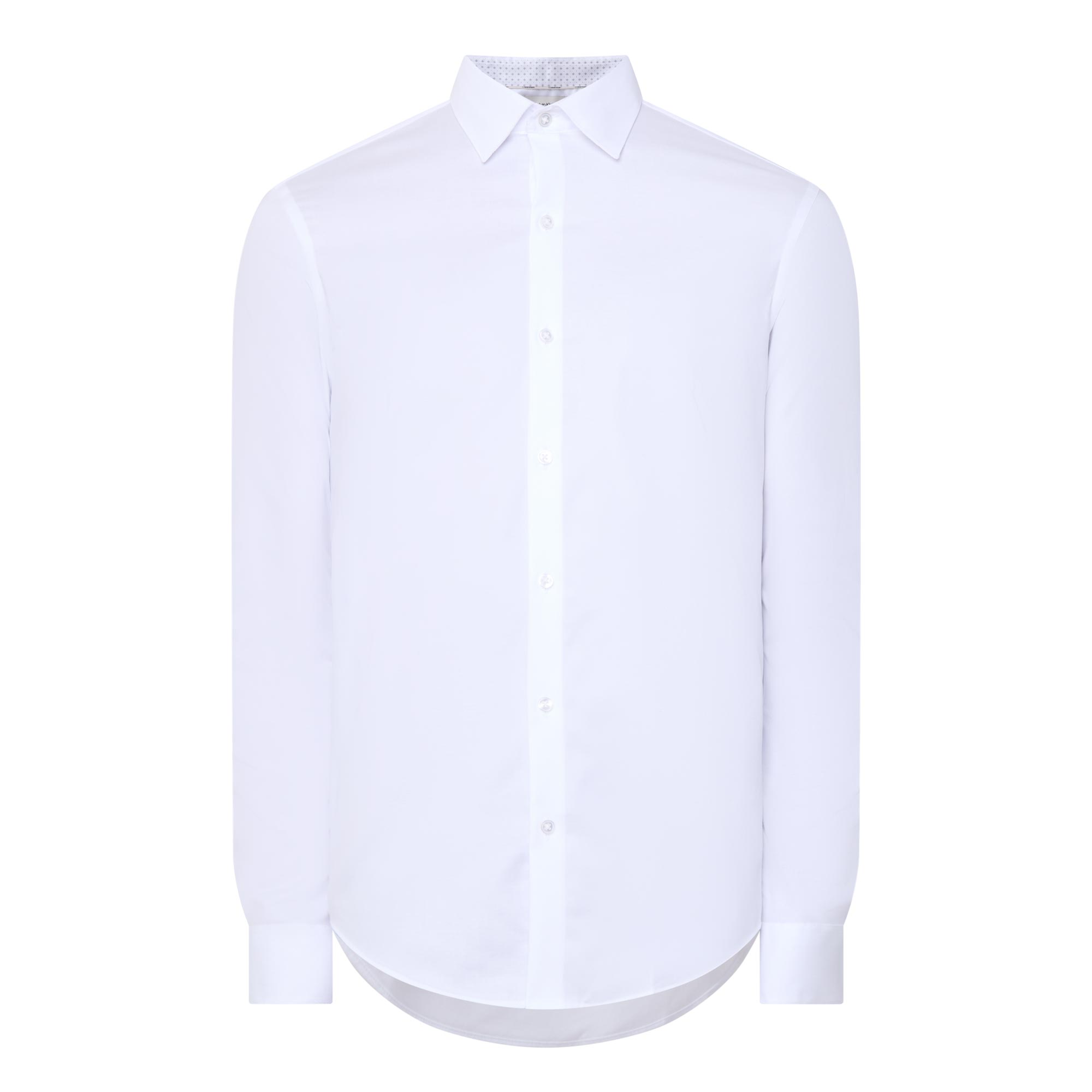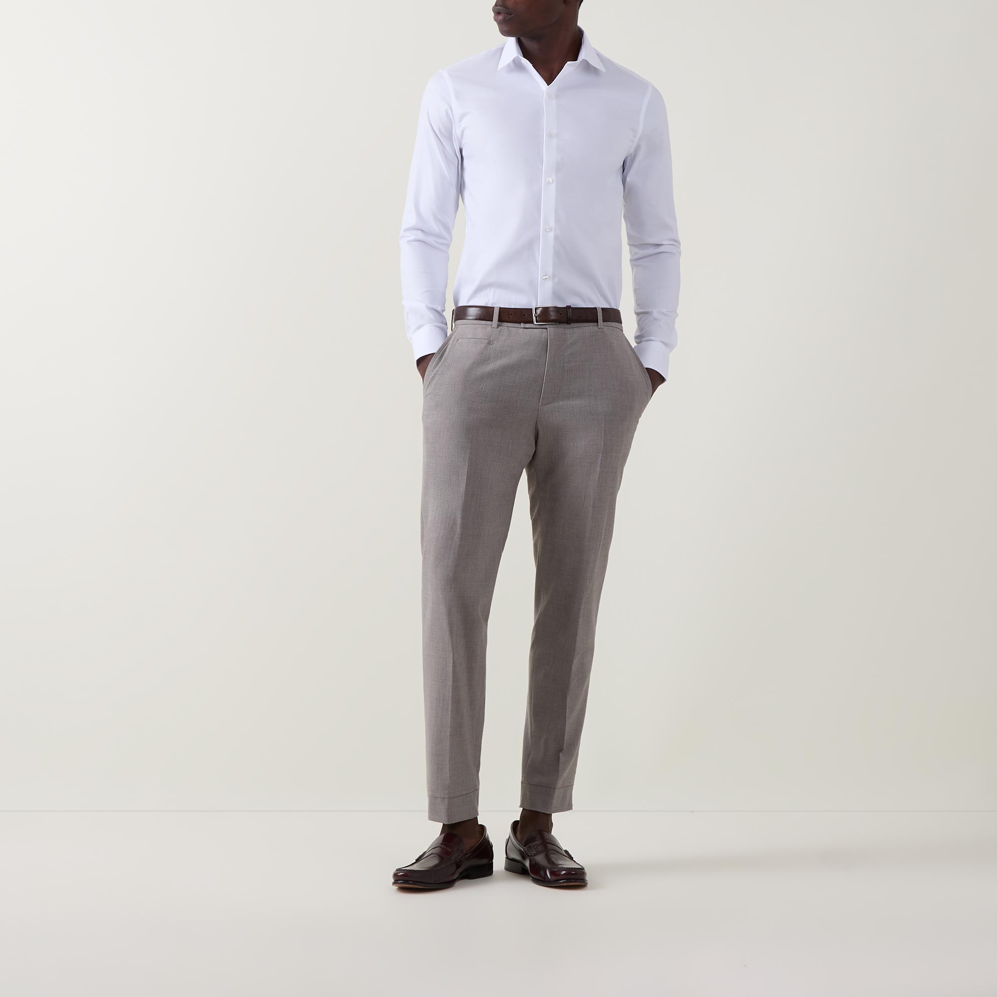 - Italian spread collar, long sleeves, buttoned cuffs, front button placket, curved hem, stretch twill fabric, tonal stitching