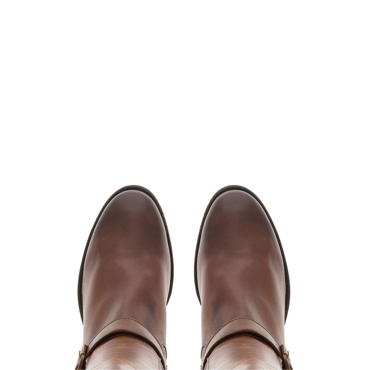 With sublime finishing touches including a polished silver buckle and an exposed leather gusset, Carl Scarpa’s Arque Tan Leather Knee High Boots are to die for.