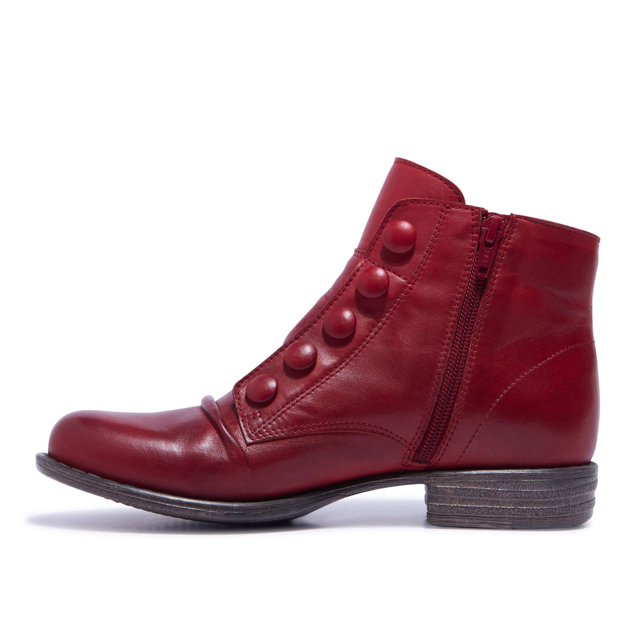 - Leather finish, decorative covered button detail, round toe, functional side zip fastening, brand logo detail