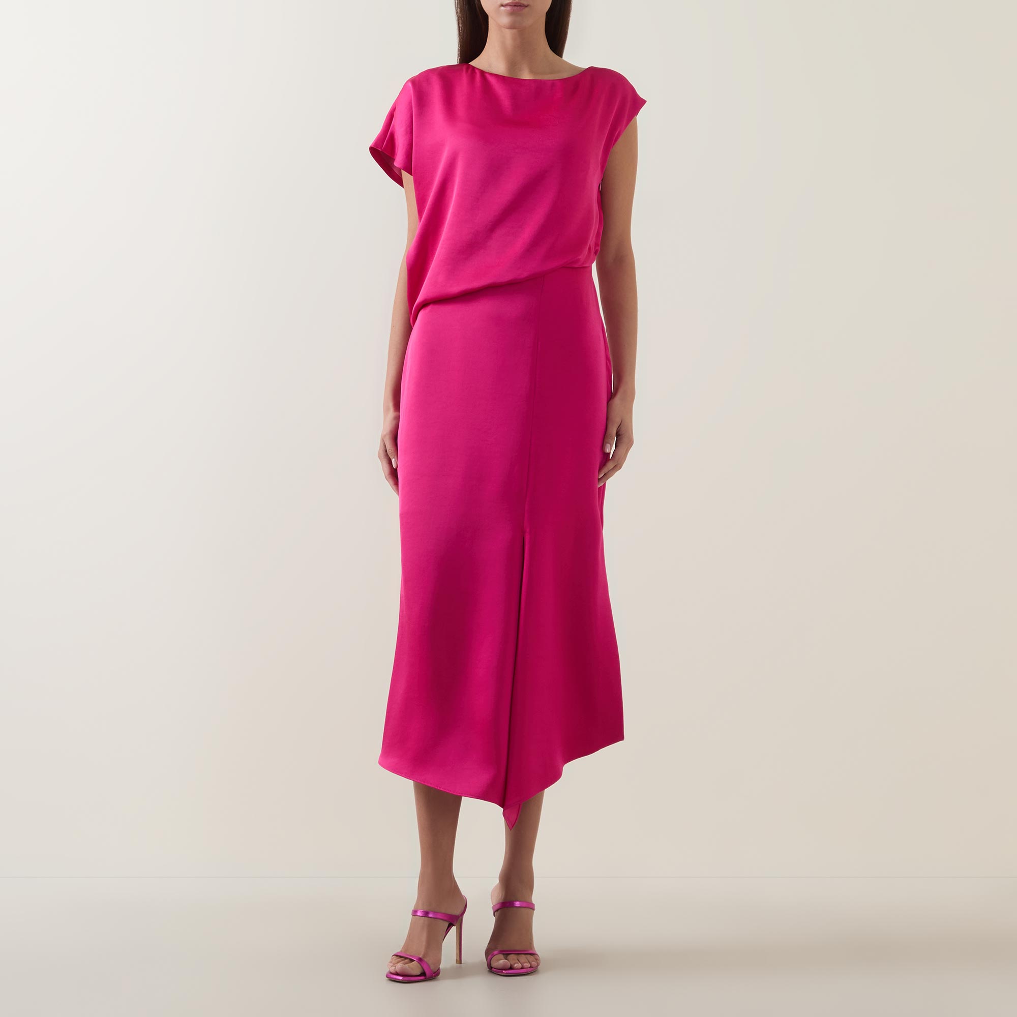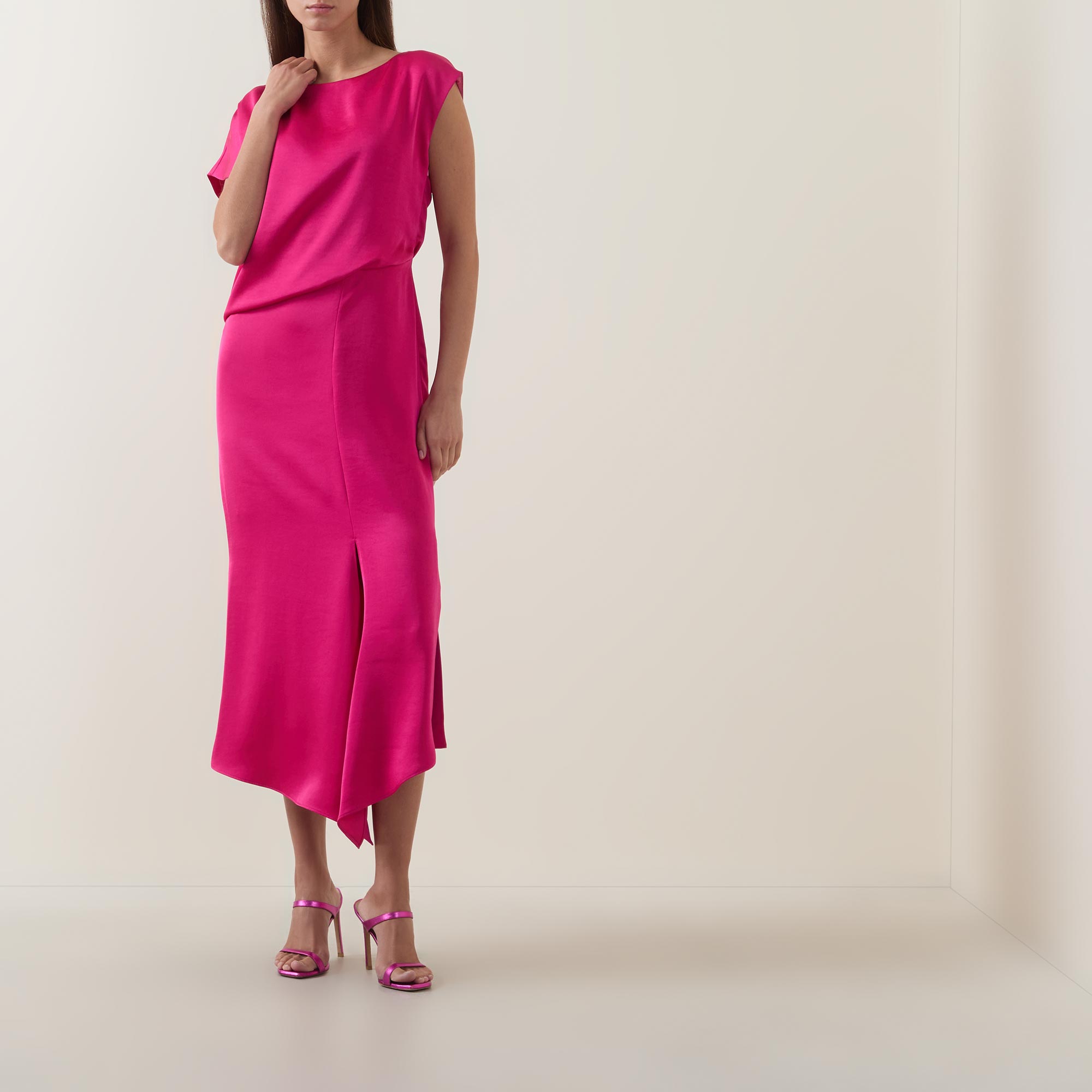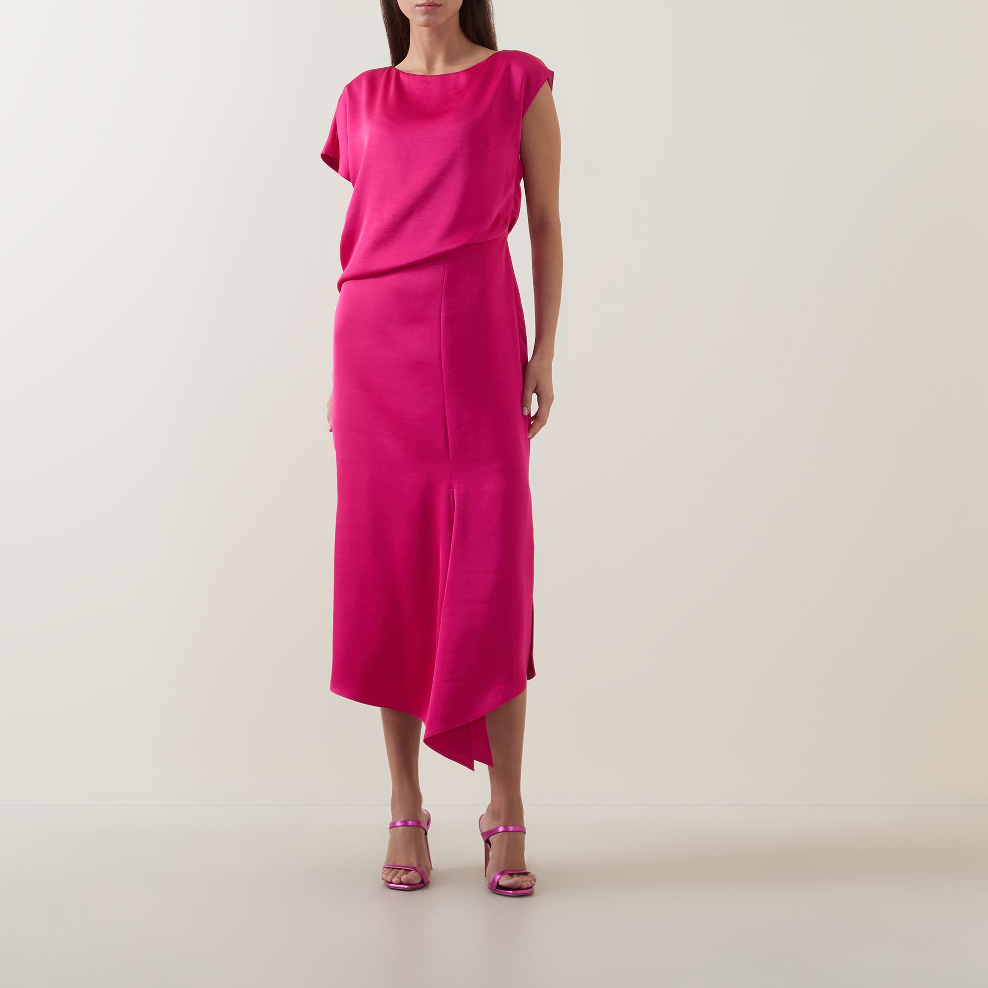 • Boat neckline, cap sleeves, draped bodice, fitted through the waist, flared skirt, asymmetric hem, side split, tonal stitching, smooth finish, midi length