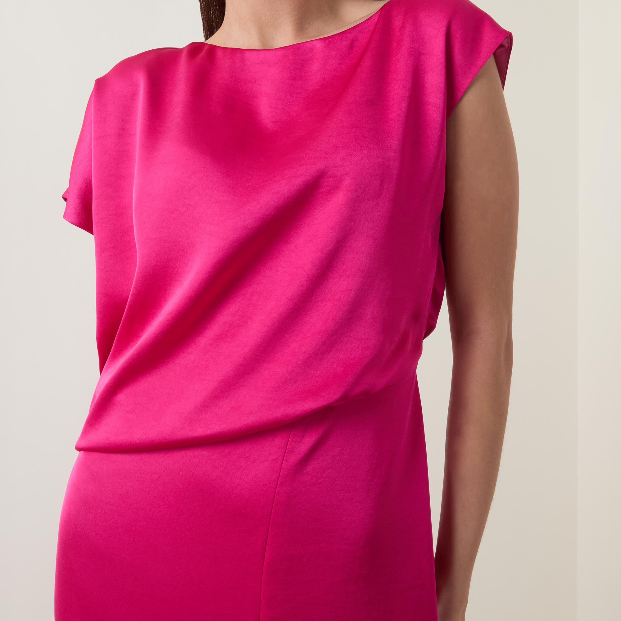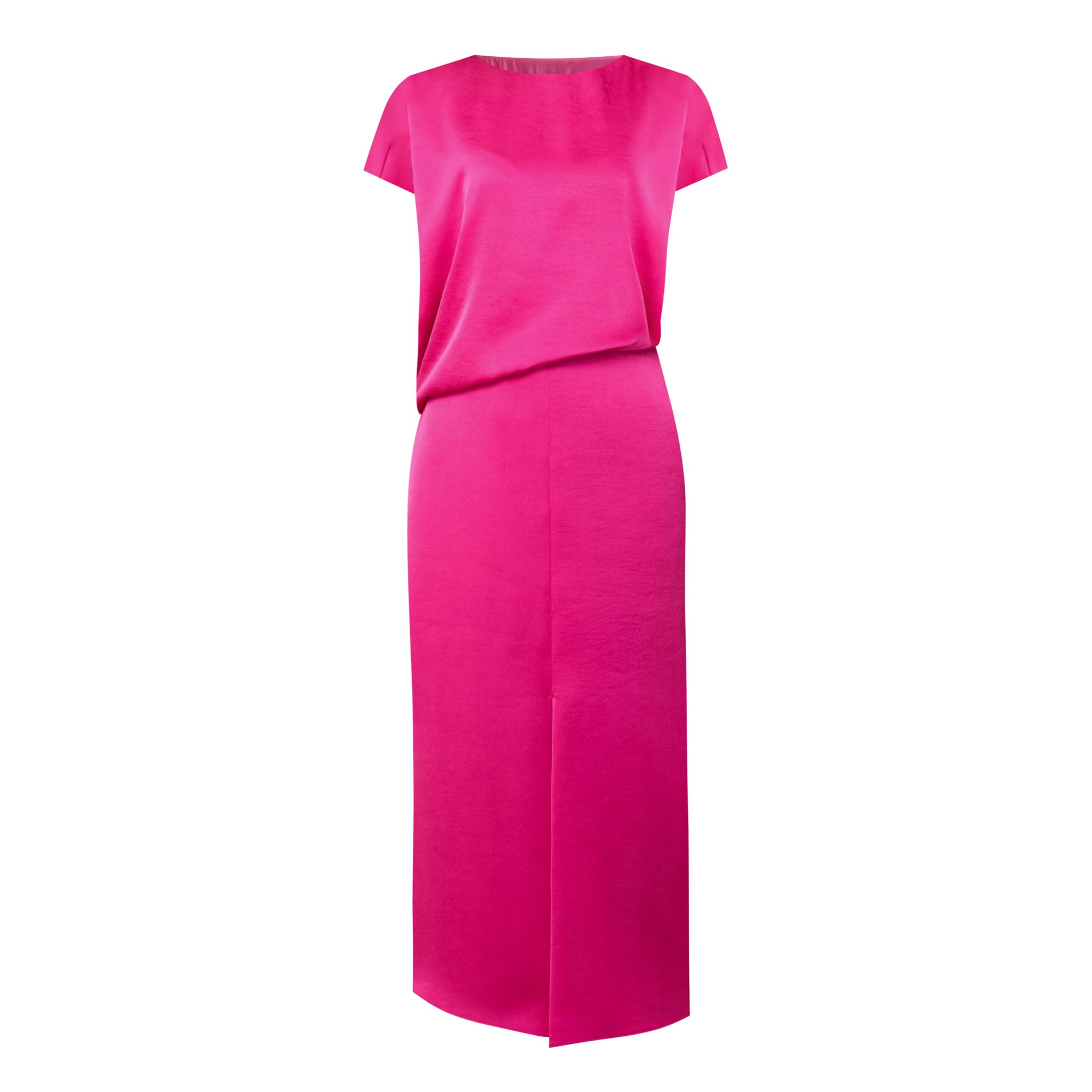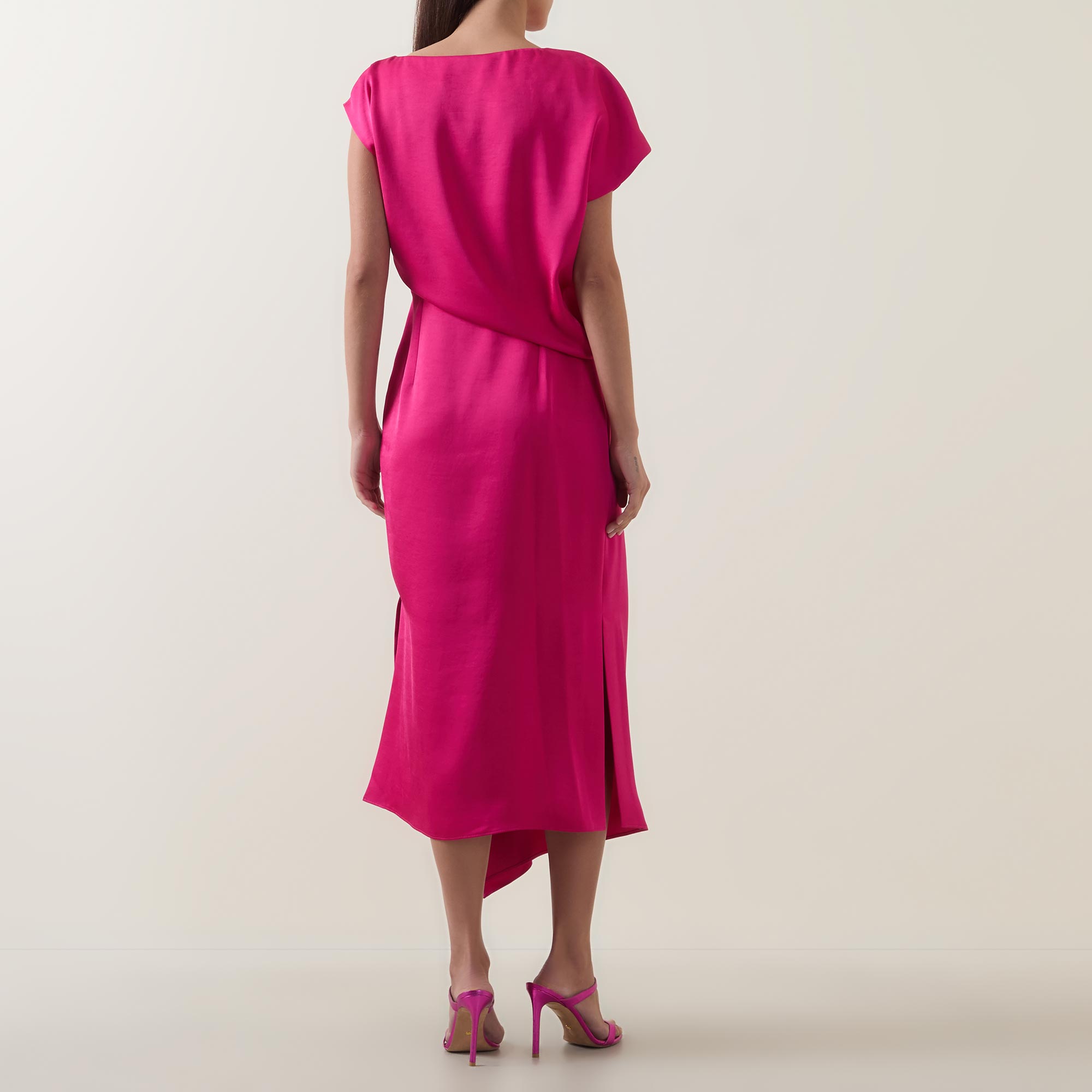 • Boat neckline, cap sleeves, draped bodice, fitted through the waist, flared skirt, asymmetric hem, side split, tonal stitching, smooth finish, midi length