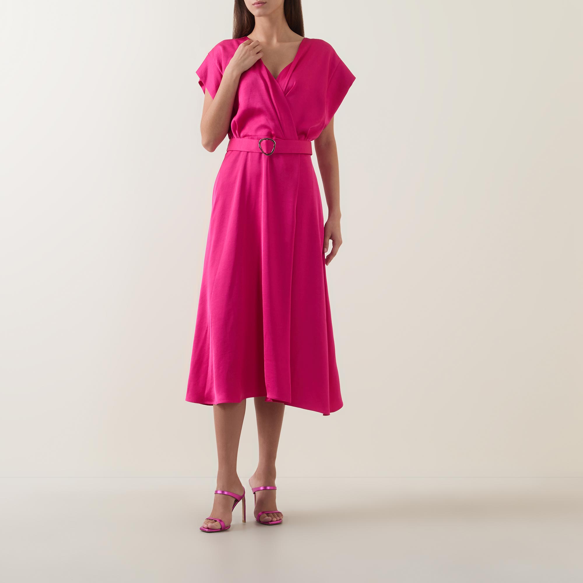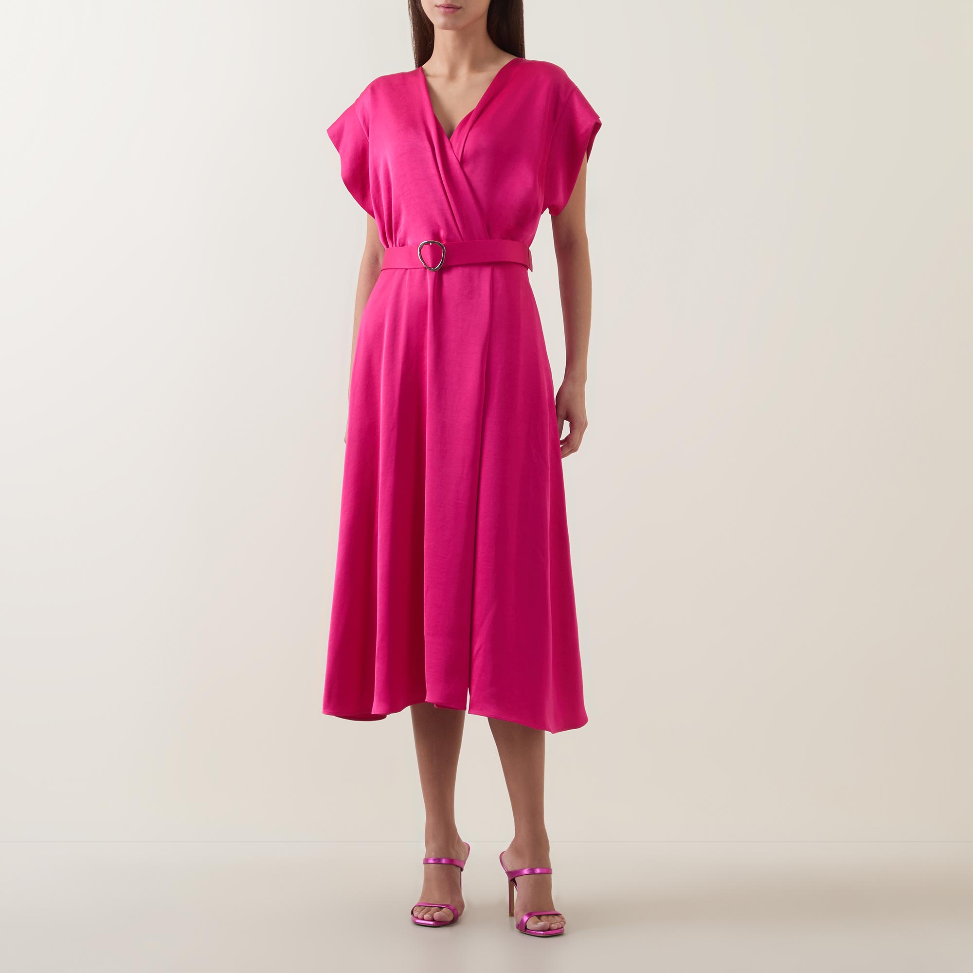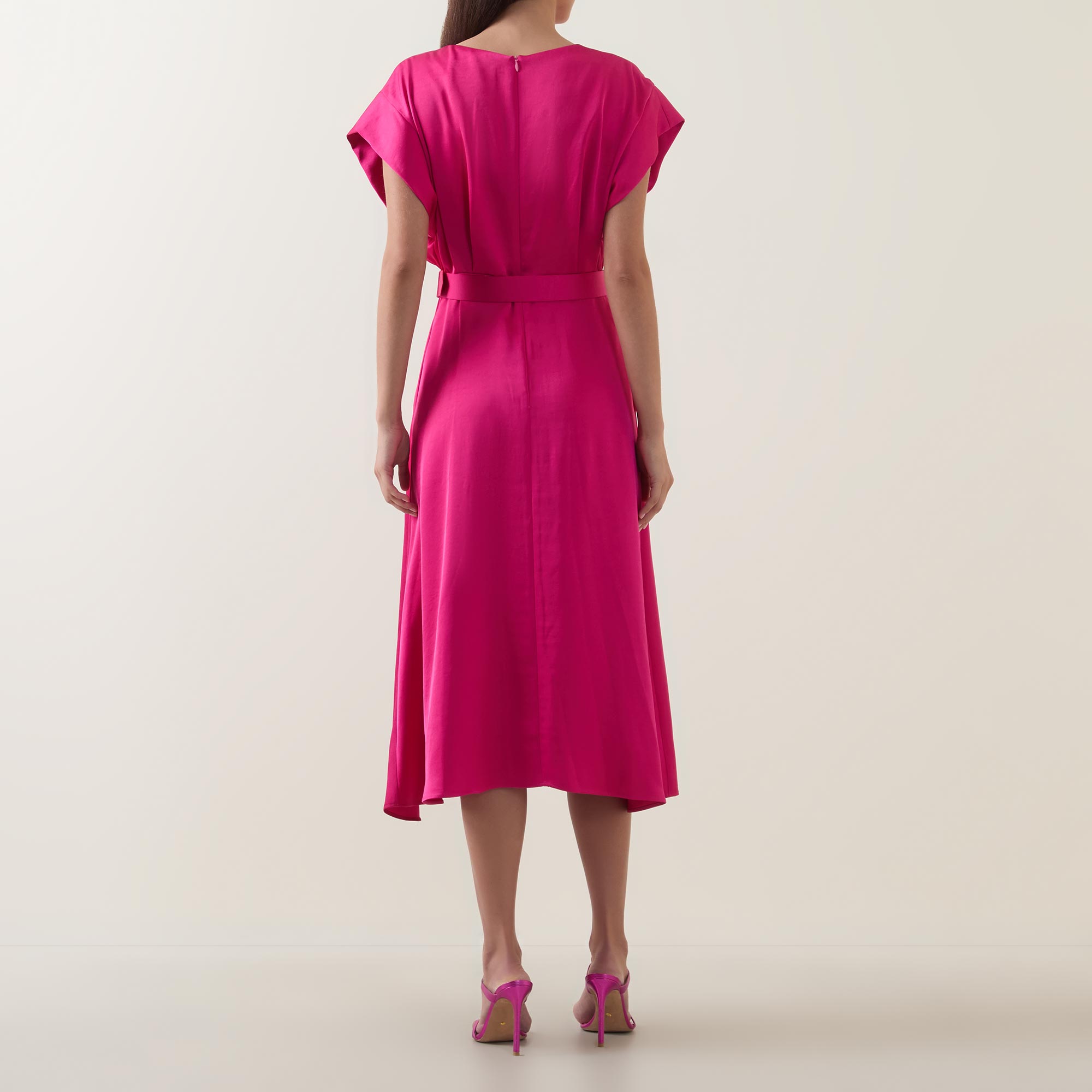- V-neckline, wrap-style bodice, short sleeves, rear concealed zip fastening, matching belt closure, flared skirt, satin finish, midi length