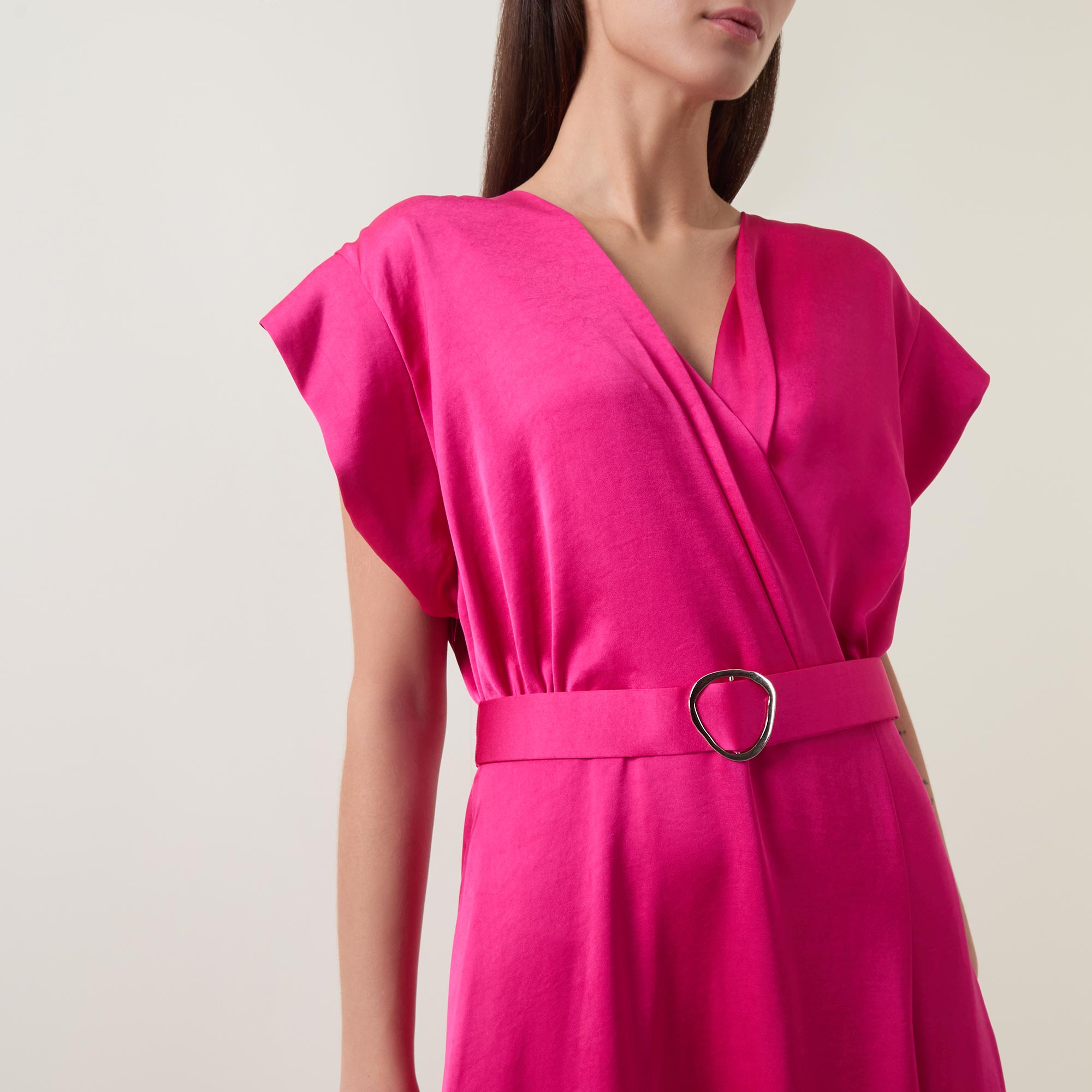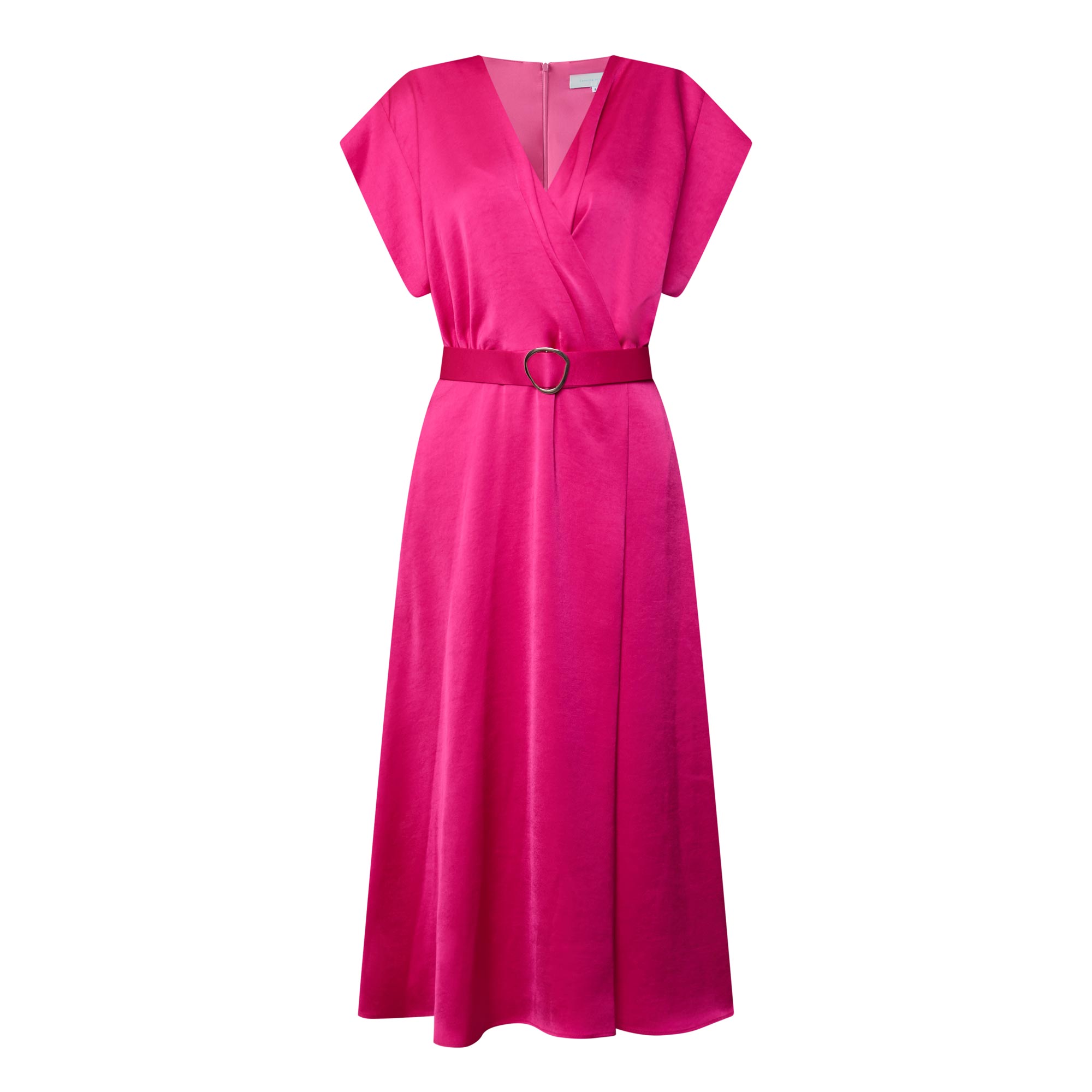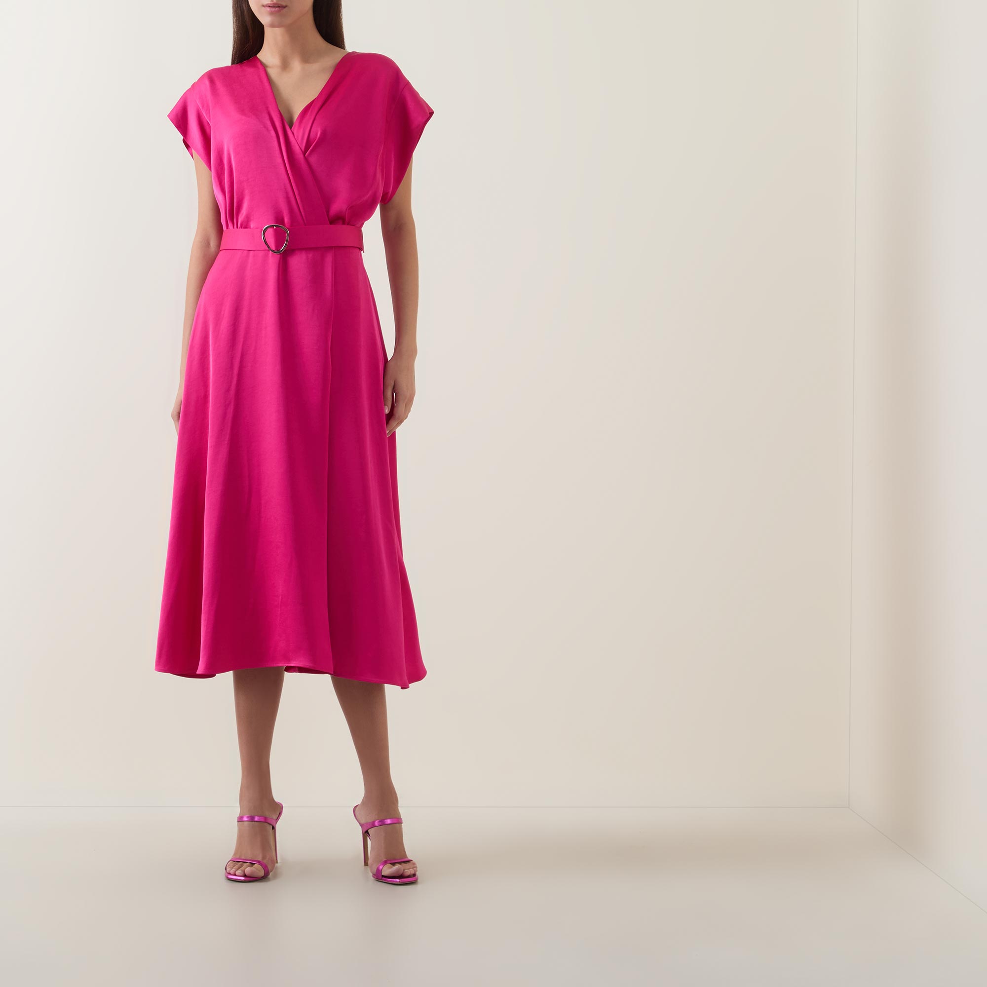 - V-neckline, wrap-style bodice, short sleeves, rear concealed zip fastening, matching belt closure, flared skirt, satin finish, midi length