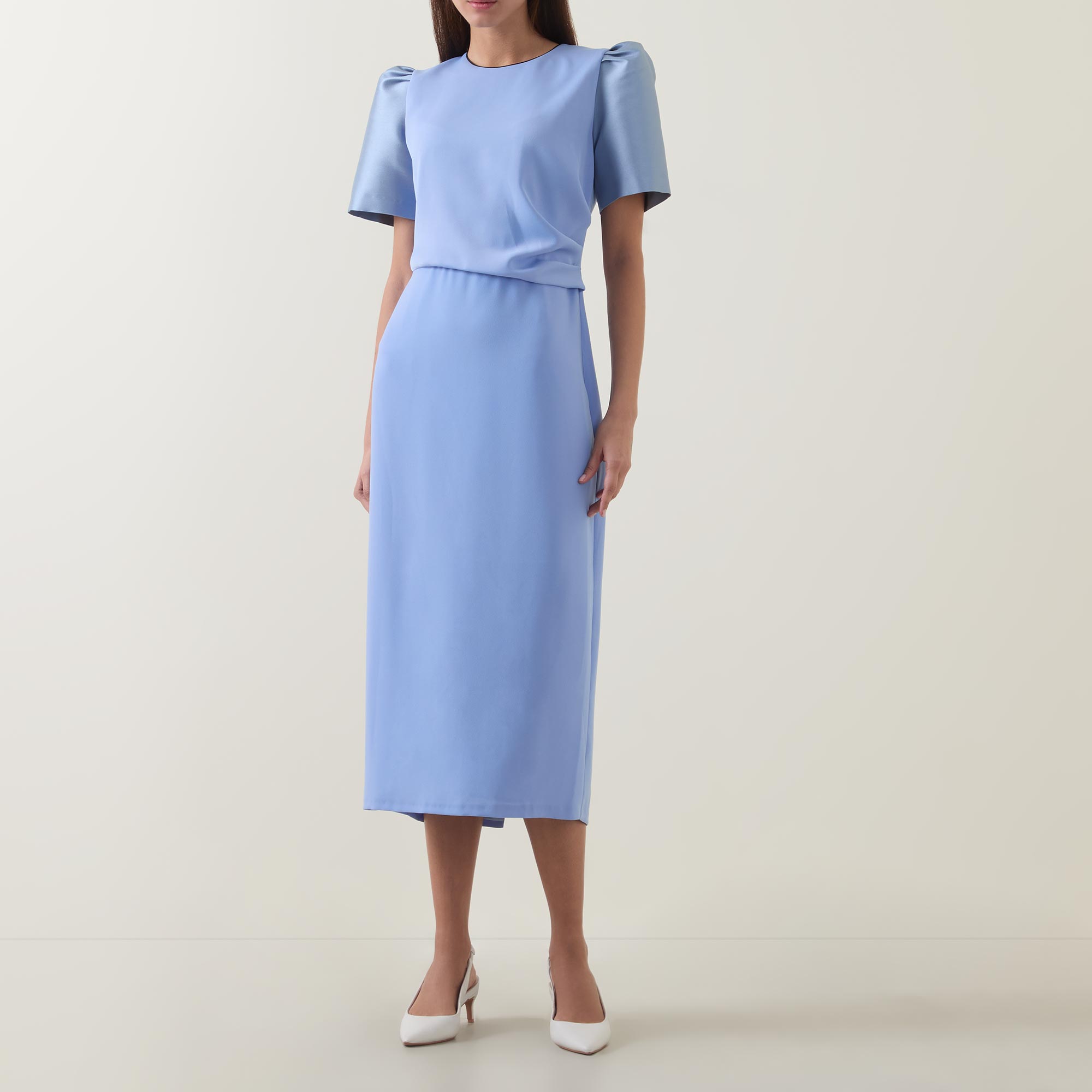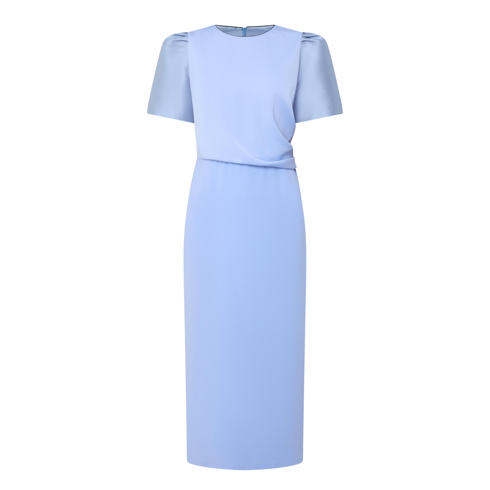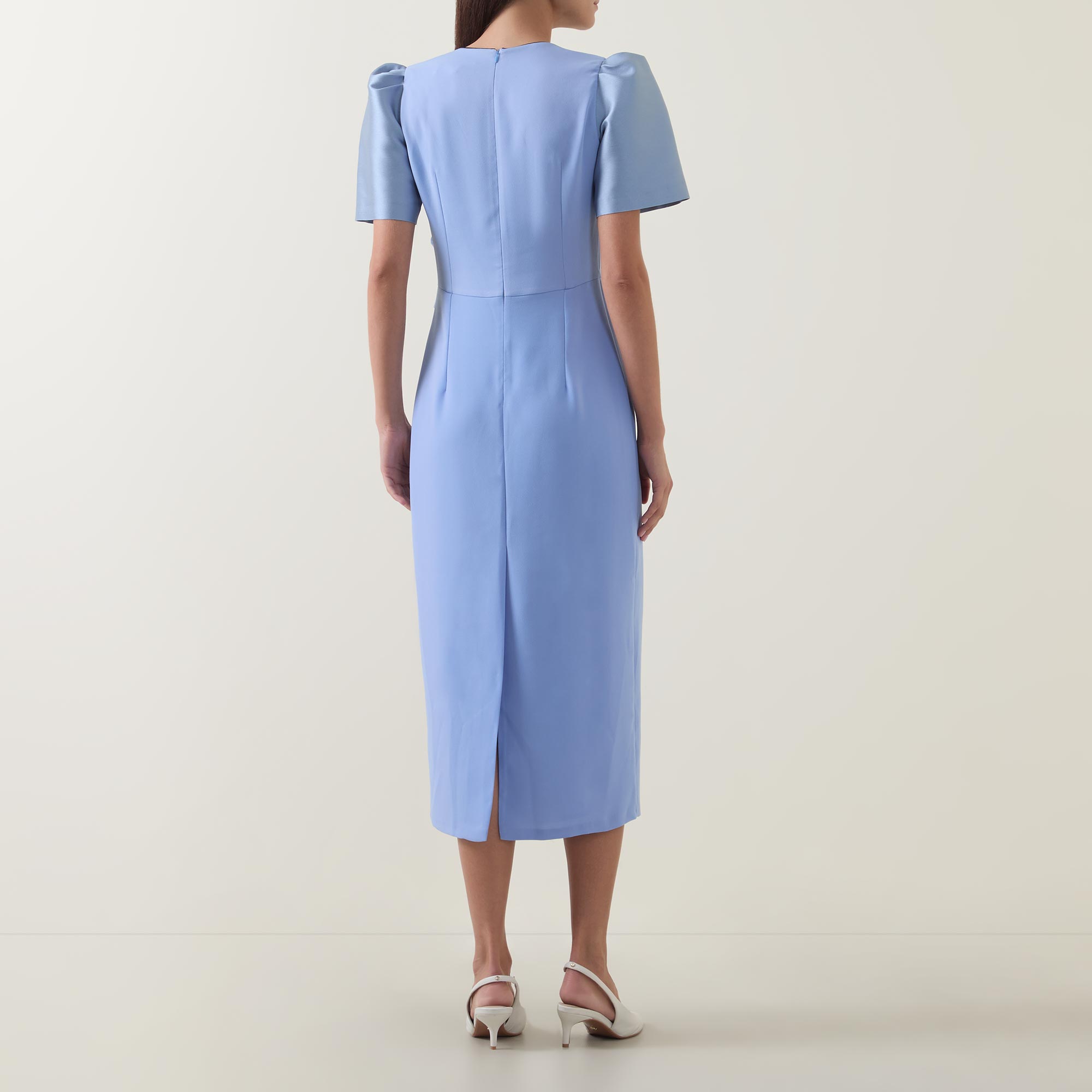 - Round neckline, puff shoulders, short sleeves, rear concealed zip fastening, draped bodice with gathered detailing, fitted through the hips, straight hem, rear vent, two-tone design, midi length