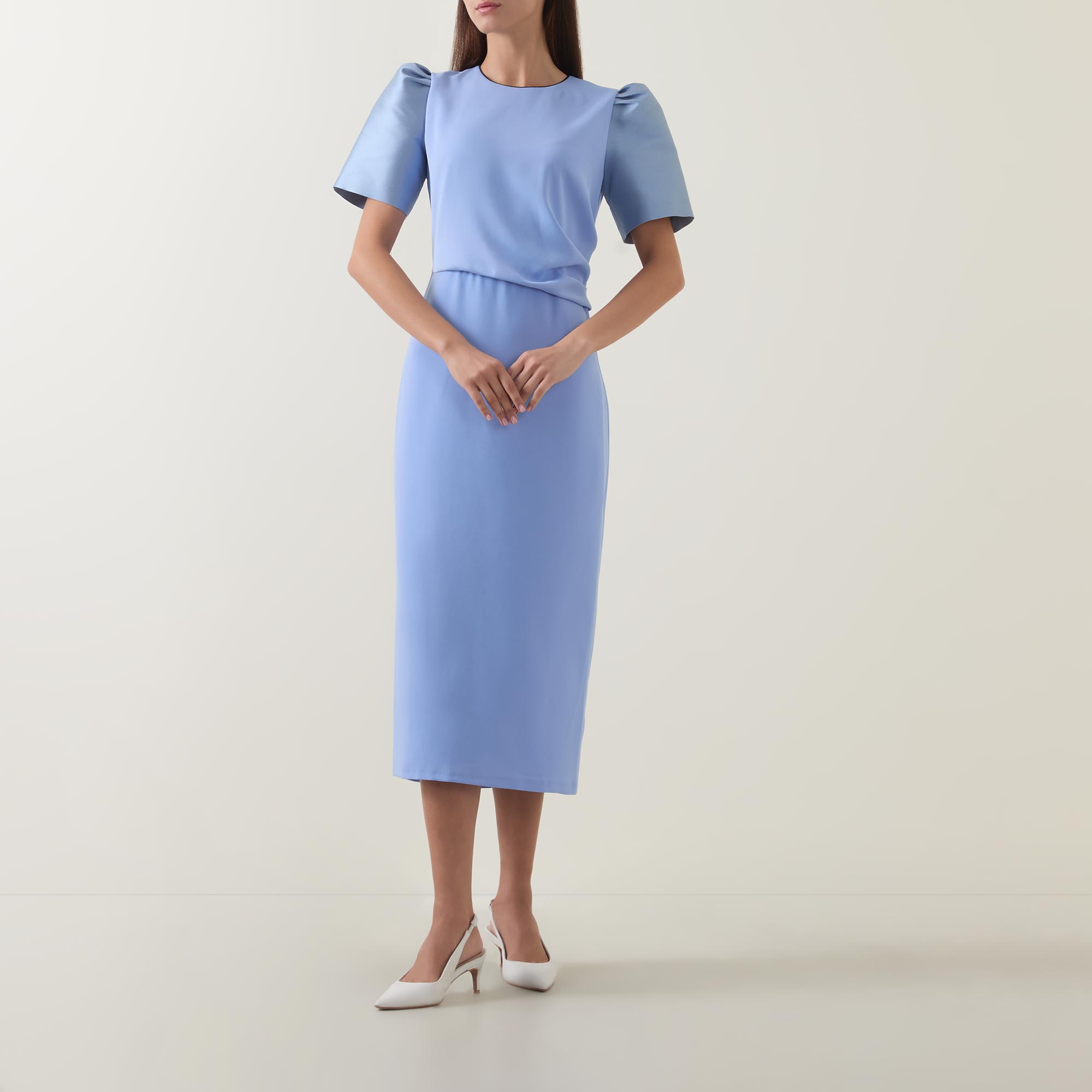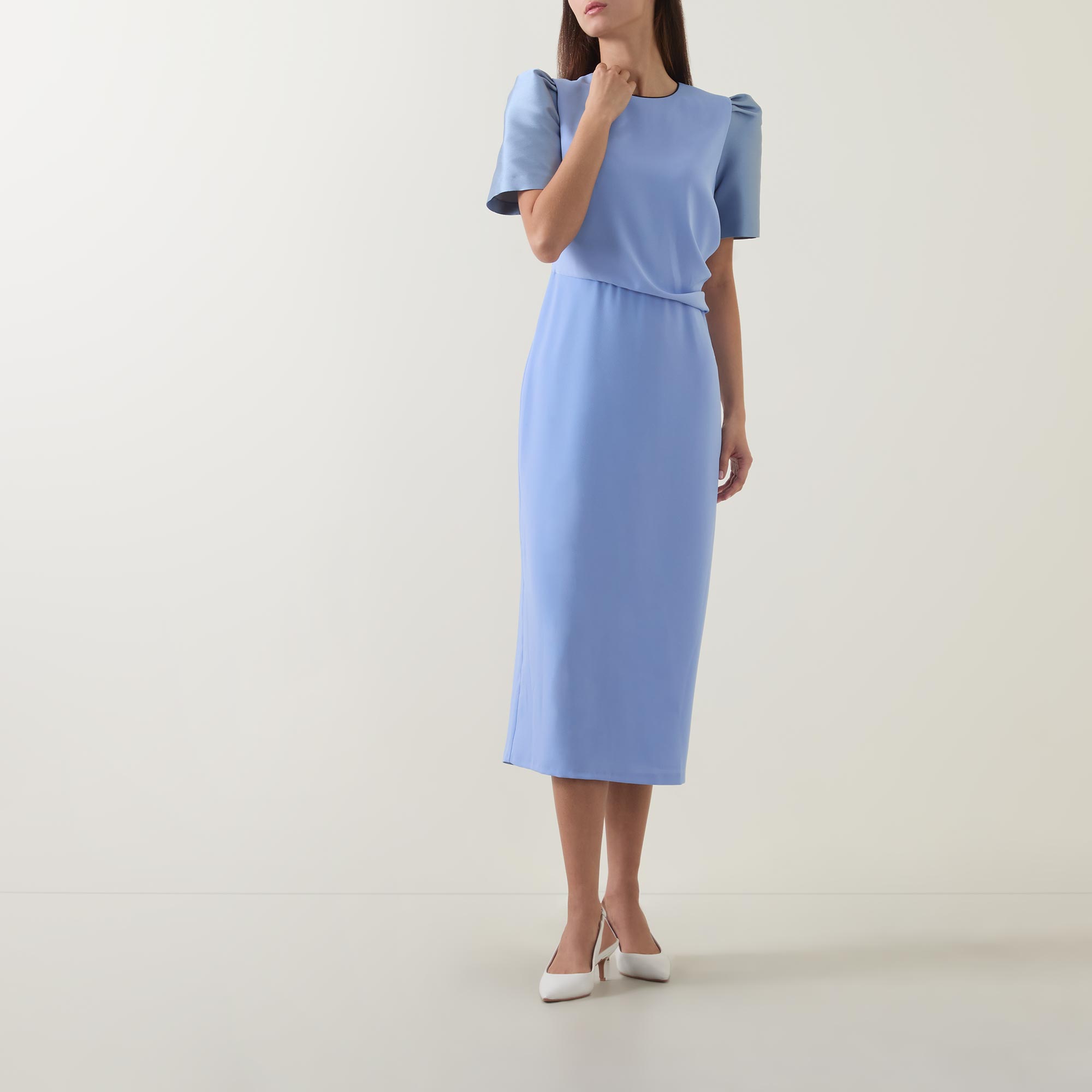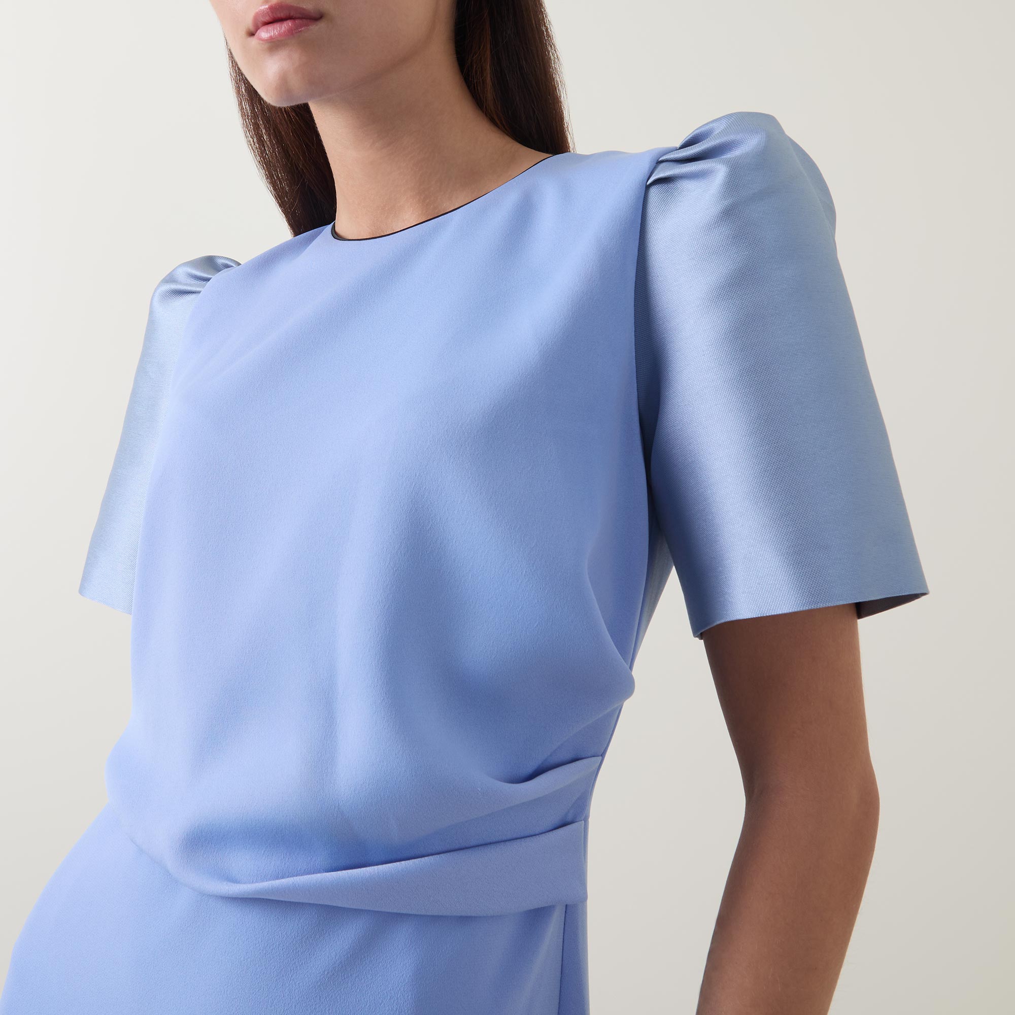 - Round neckline, puff shoulders, short sleeves, rear concealed zip fastening, draped bodice with gathered detailing, fitted through the hips, straight hem, rear vent, two-tone design, midi length