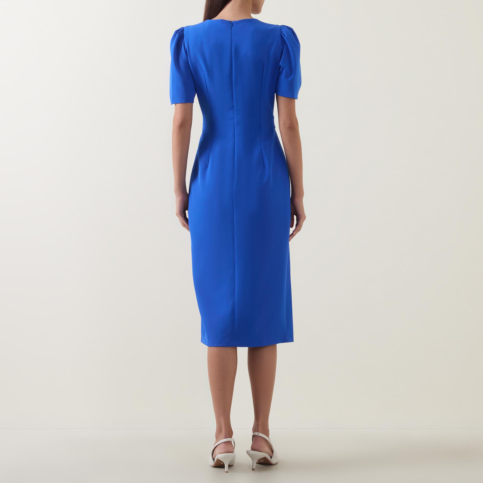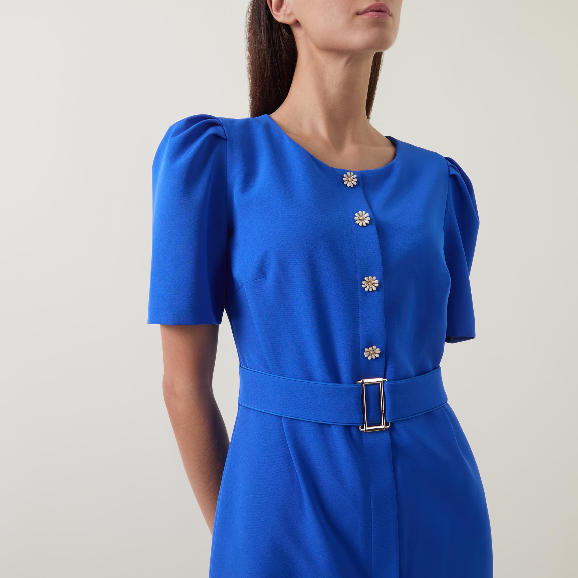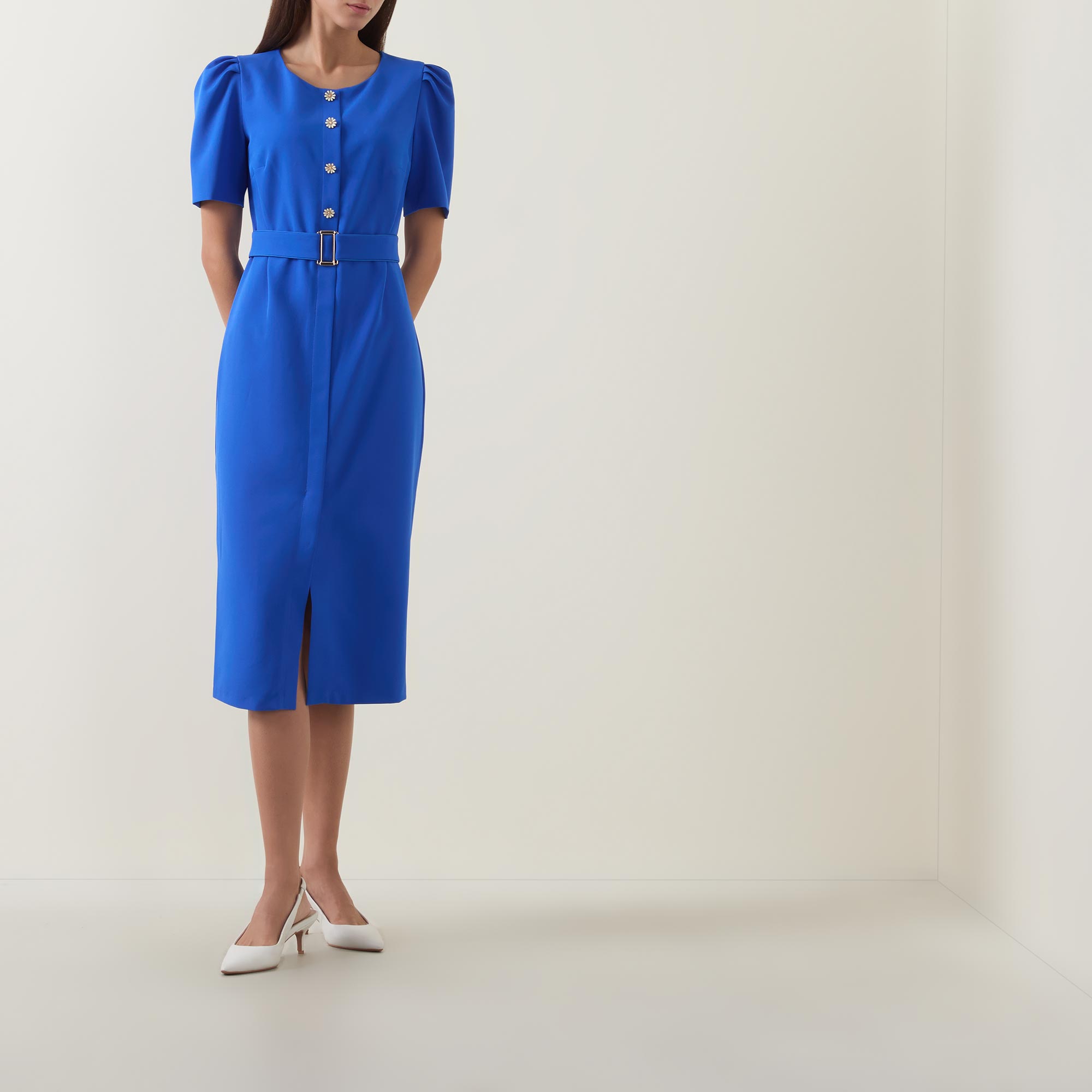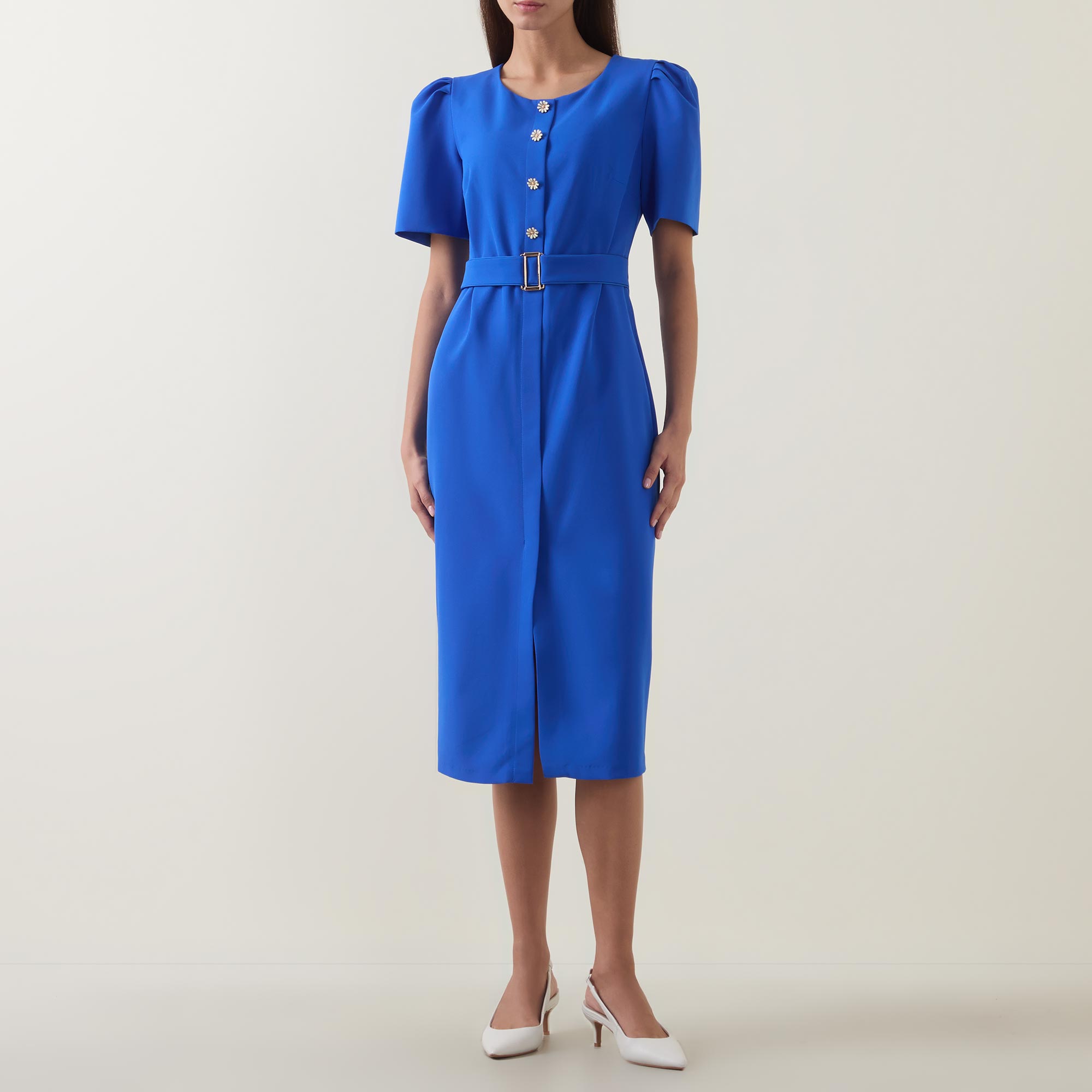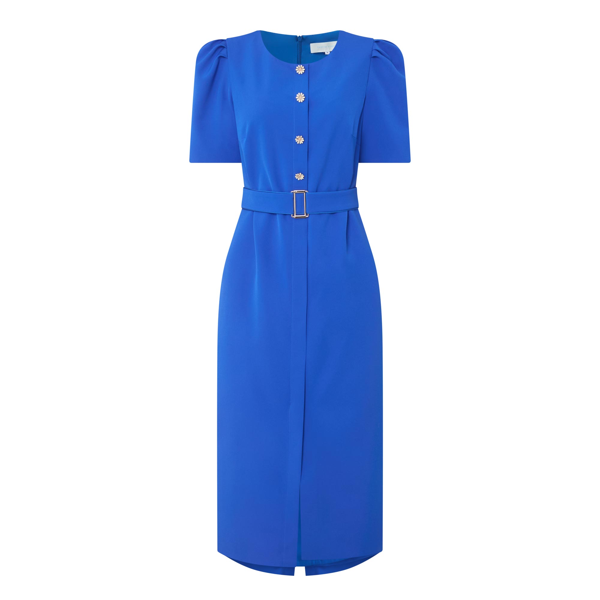 - Round neckline, puff shoulders, short sleeves, front statement button fastening, matching belt, rear concealed zip fastening, fitted through the waist and hips, darting throughout, straight hem, midi length