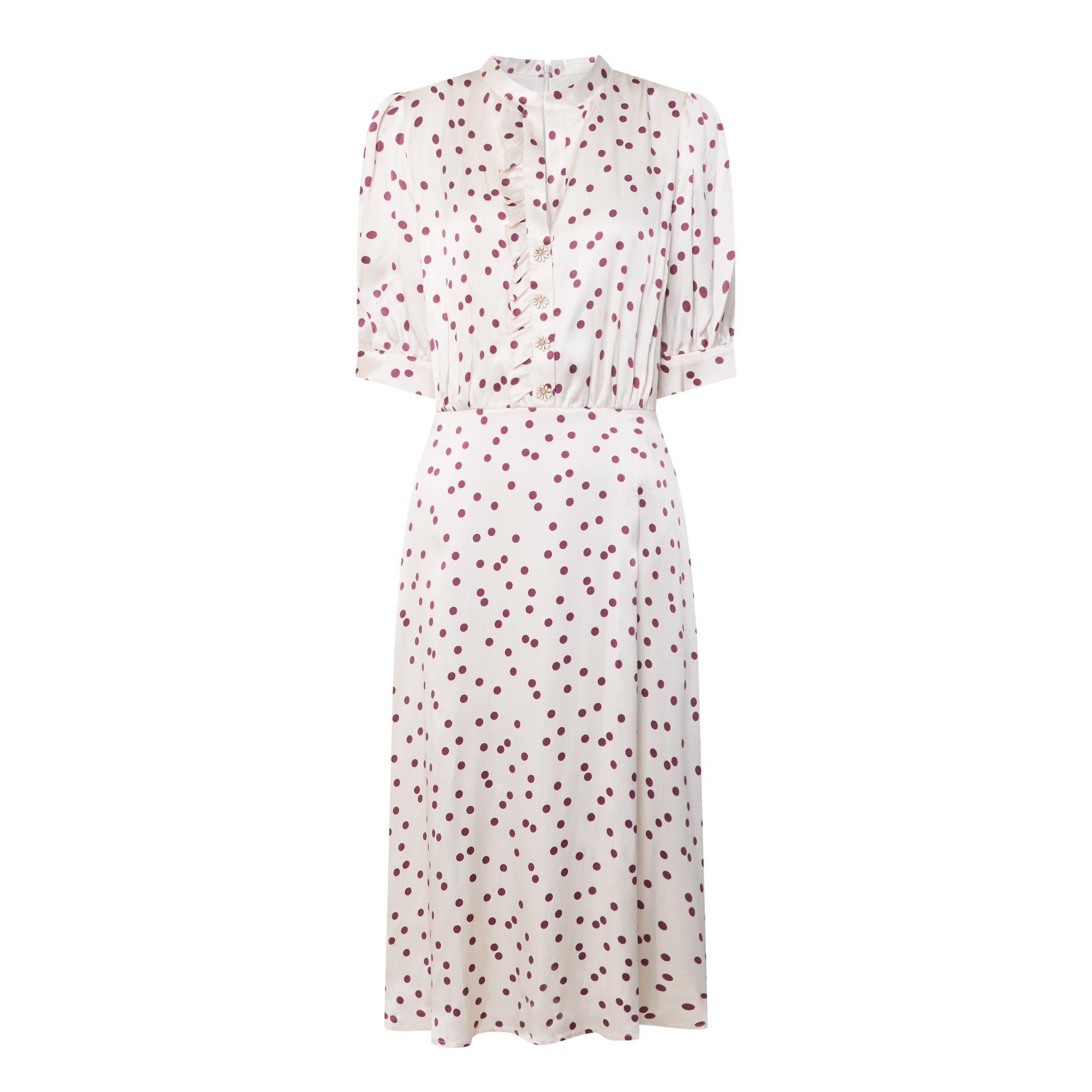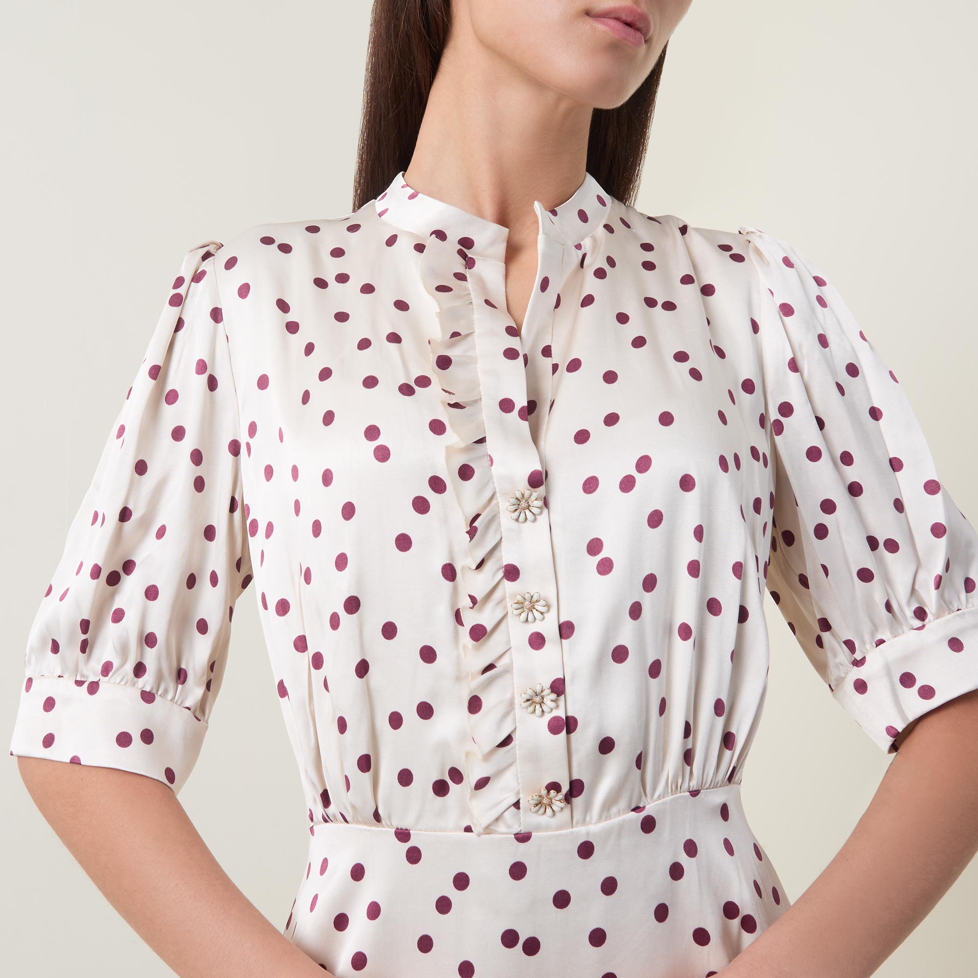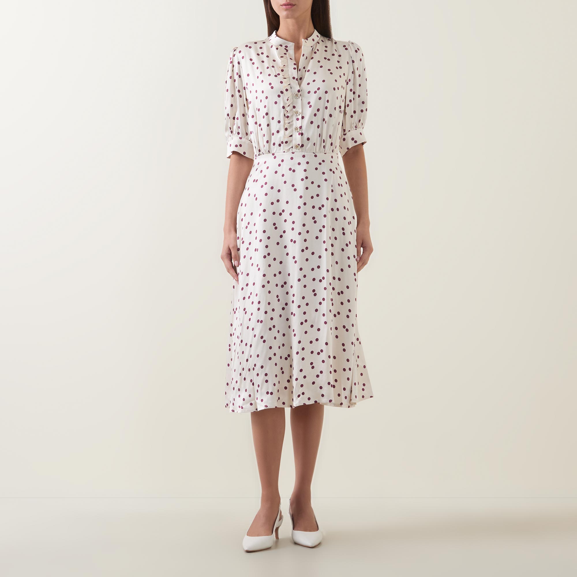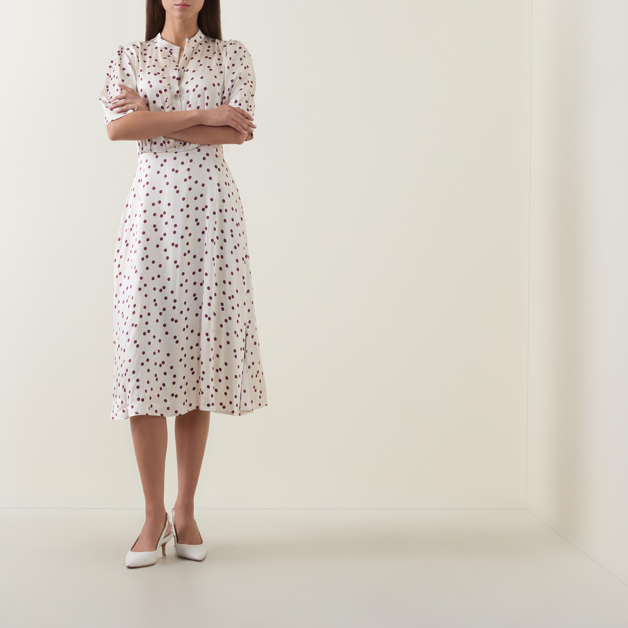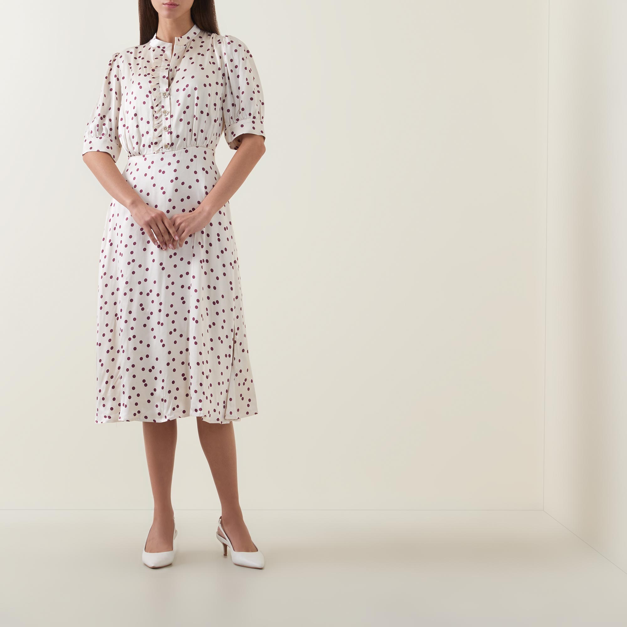 - Stand collar, V-neckline, short sleeves, buttoned cuffs, front half placket, rear smocked detailing, flared skirt, polka dot print, midi length