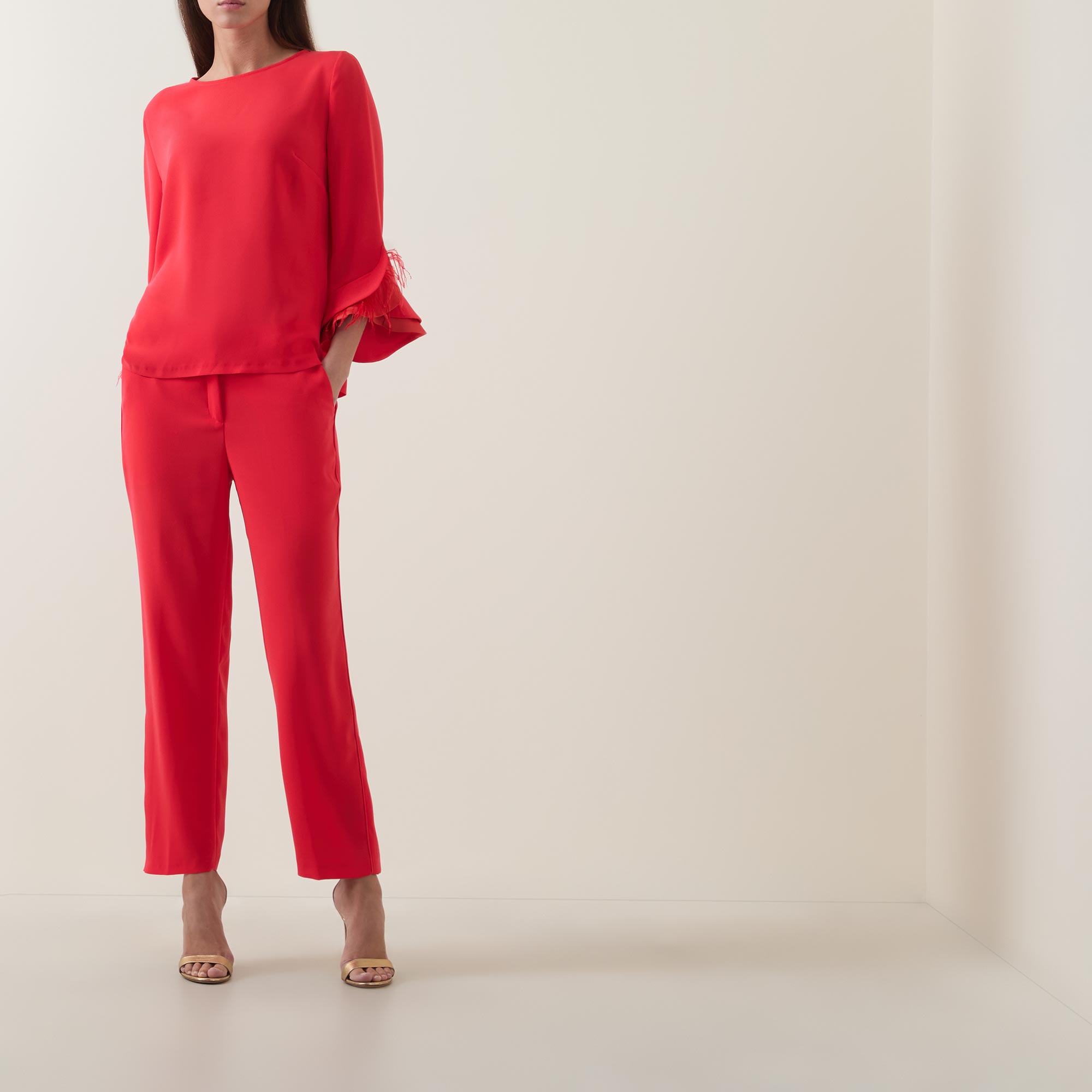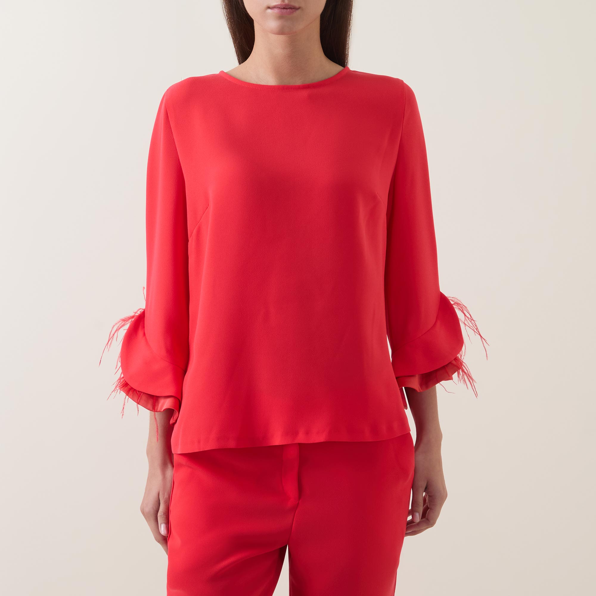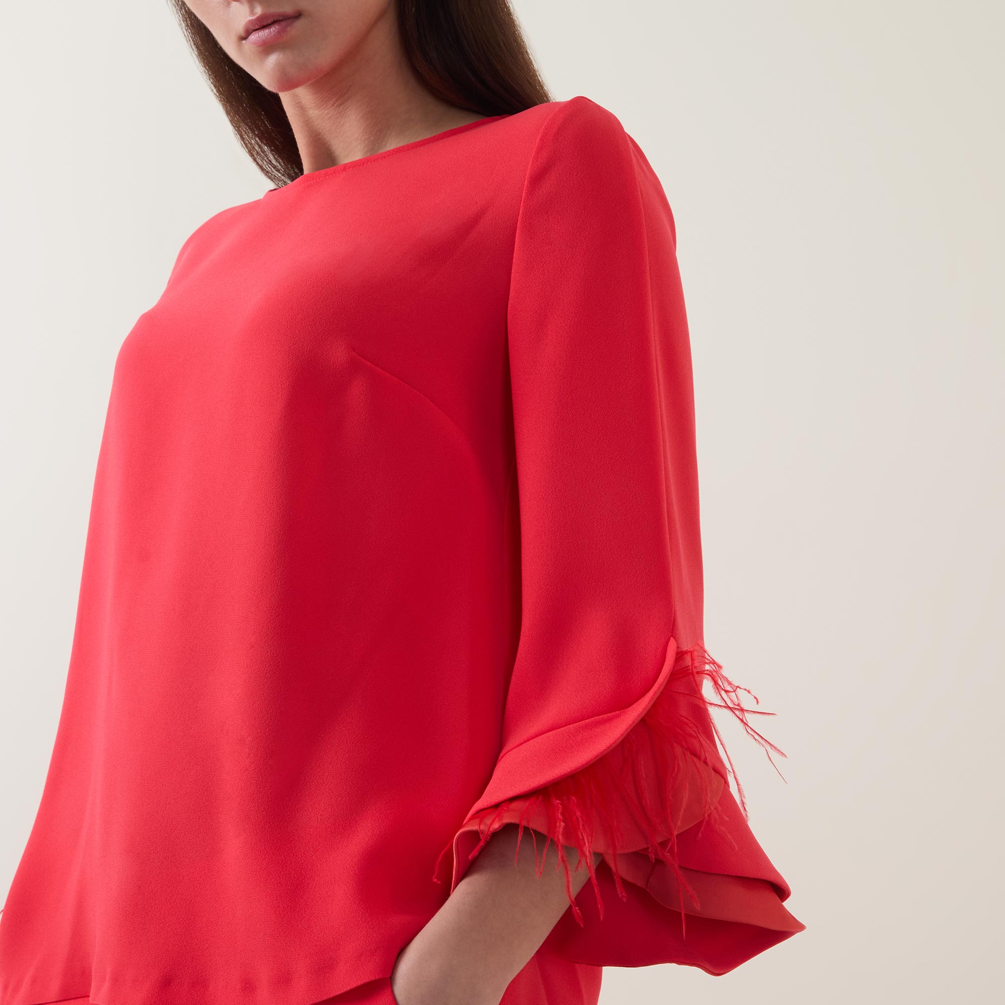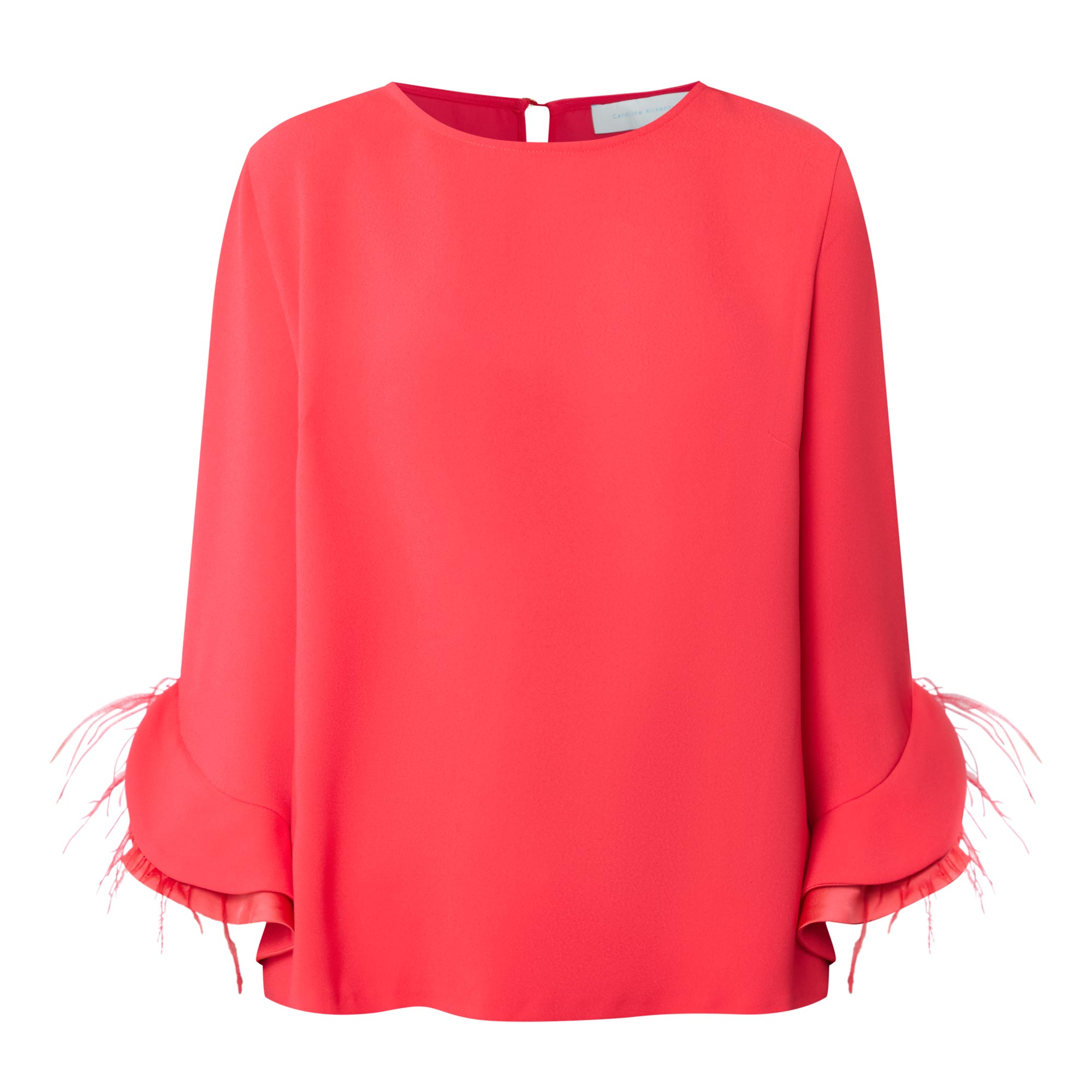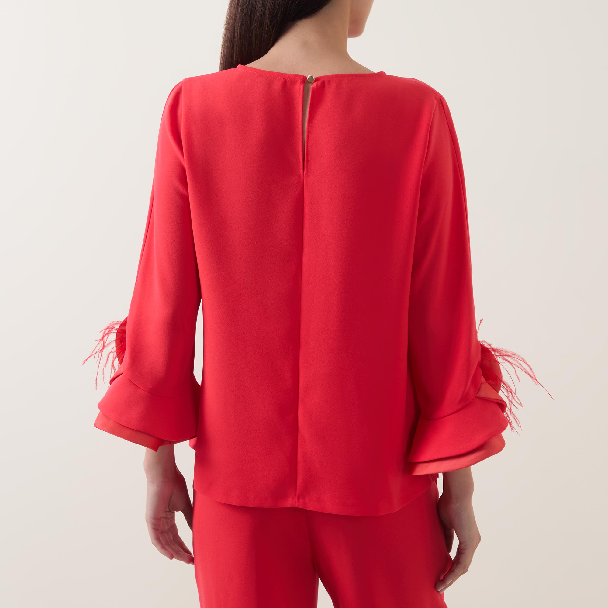 • Round neckline, rear keyhole and button fastening, three-quarter length sleeves, layered flared cuffs with contrast detailing, feather accents, straight hem, tonal stitching, smooth finish