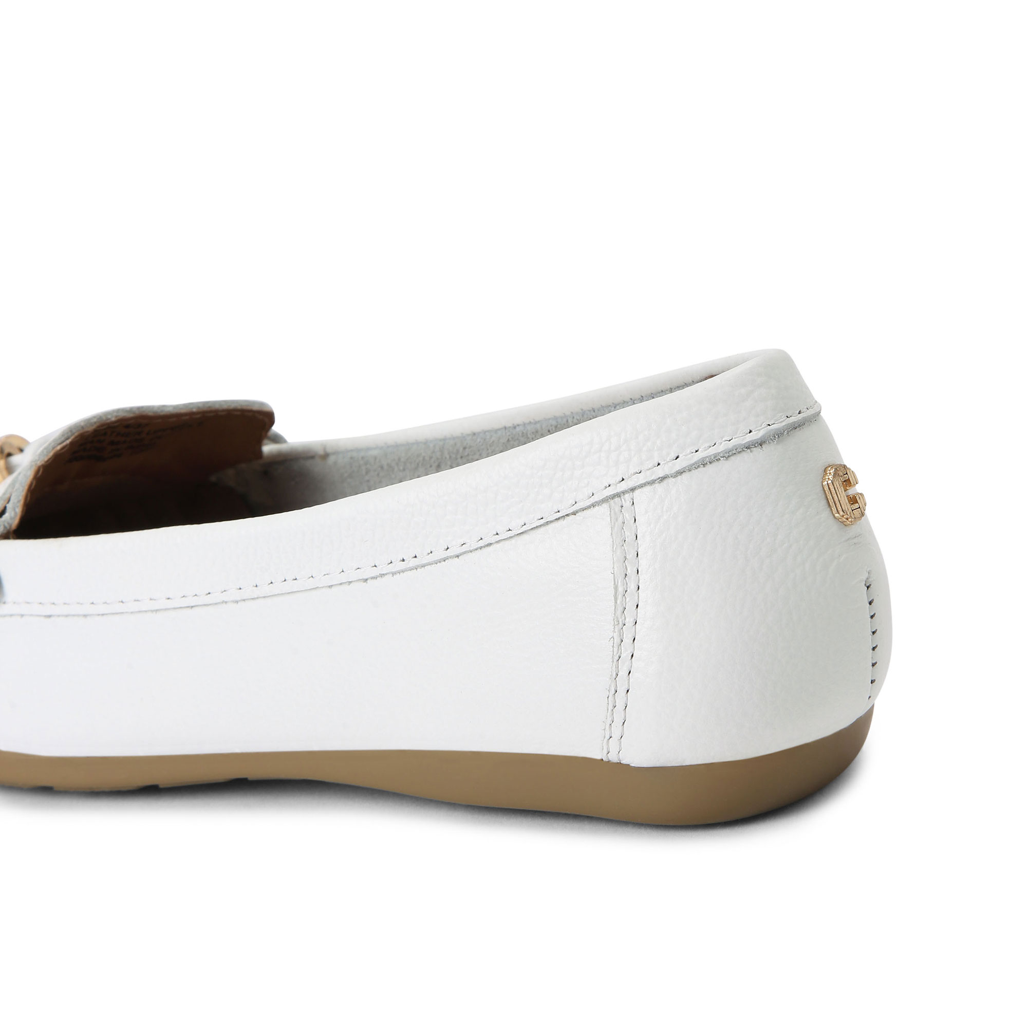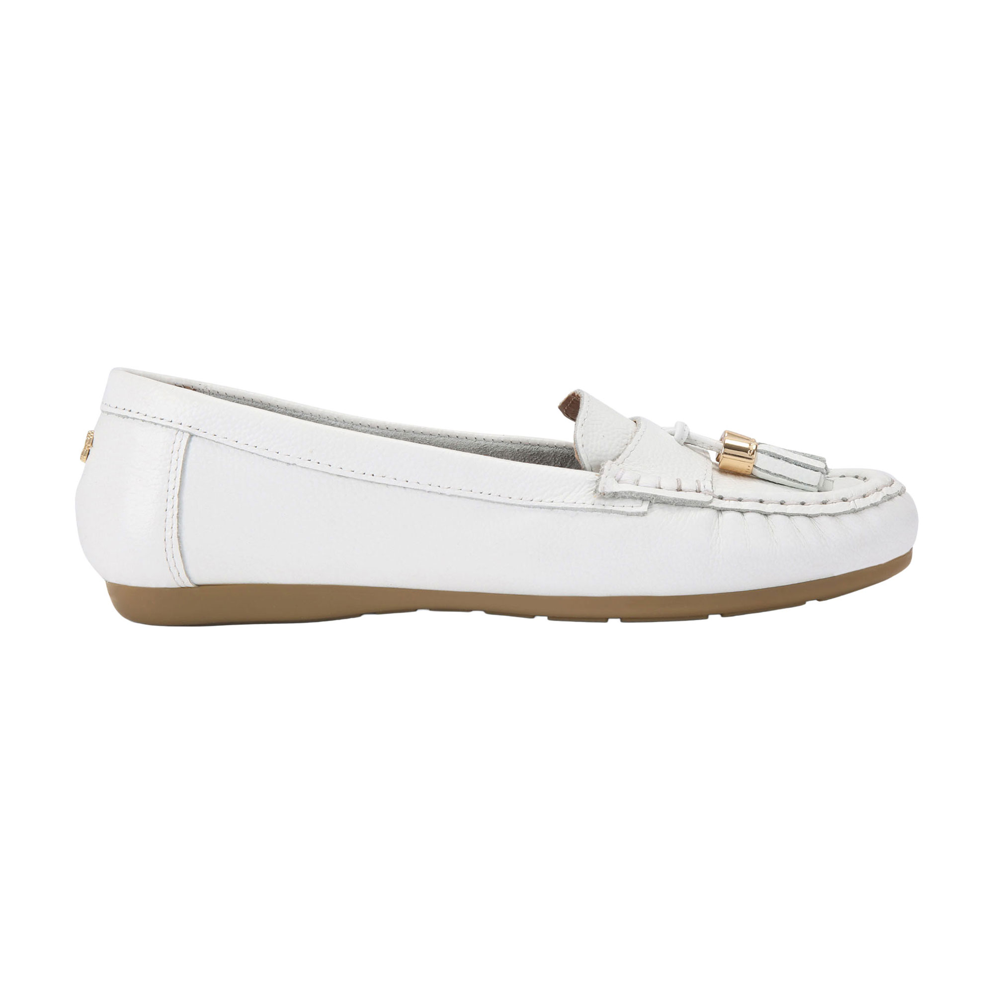 • Flat sole, loafer style, textured leather, two tassel details