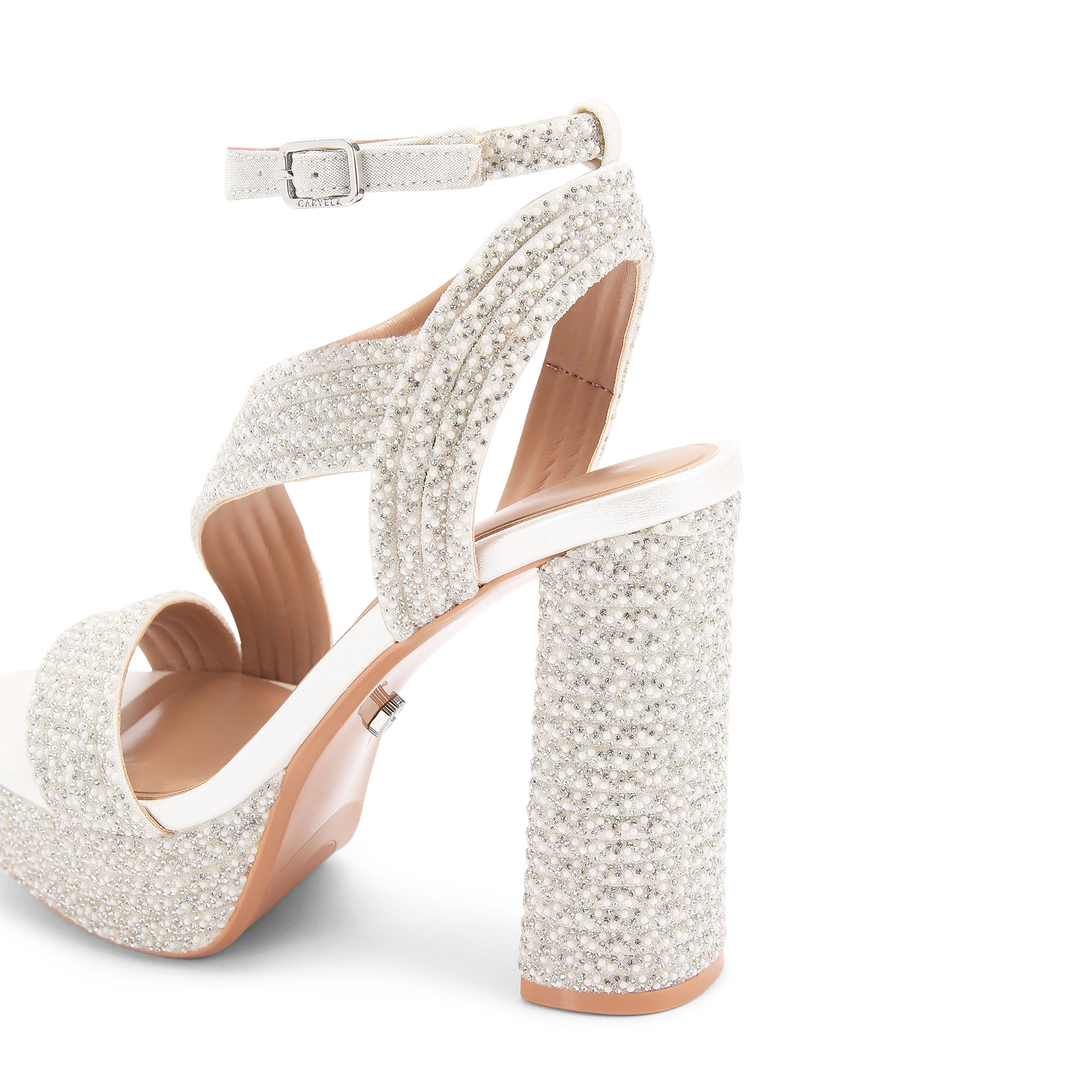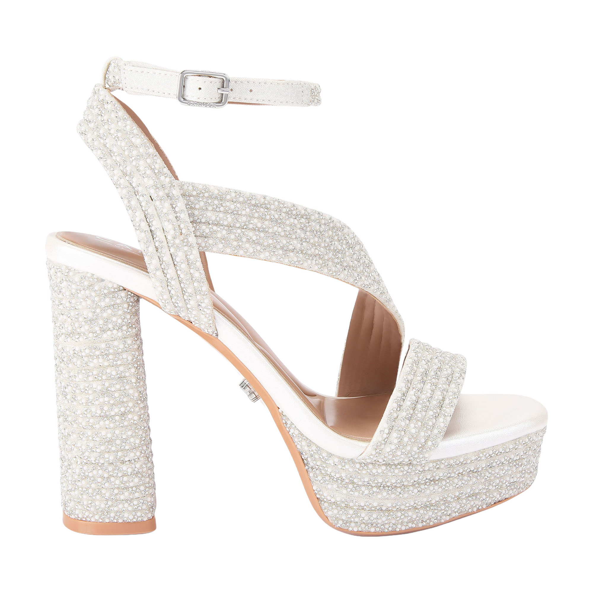 • Platform sole, crystal and faux pearl details, small gunmetal-tone buckle fastening, high heel silhouette