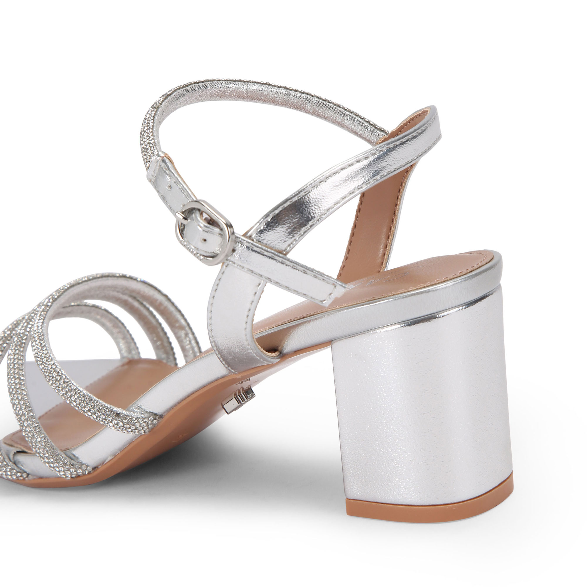 - Block heel, crystal embellished upper straps, ankle strap fastening with small gold-tone buckle fastening