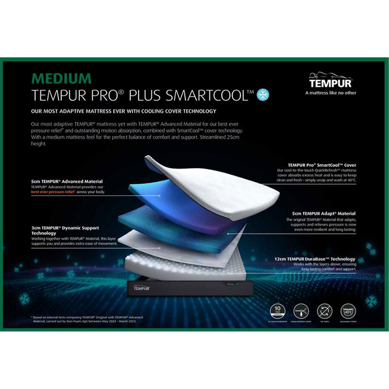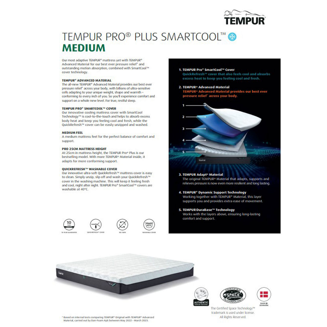 Tempur offers temperature-responsive material born from NASA technology that conforms to the shape of the sleeper. Redistributing pressure for fully supported sleep, these world-famous mattresses are the stuff of dreams. The TEMPUR Pro® Plus SmartCool™ Medium is a medium mattress and at 25cm it has more TEMPUR® material inside, promising unparalleled comfort with the most innovative bedroom technology.