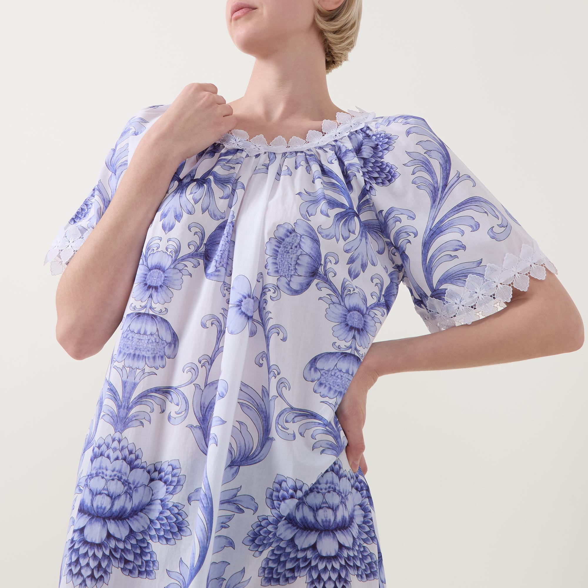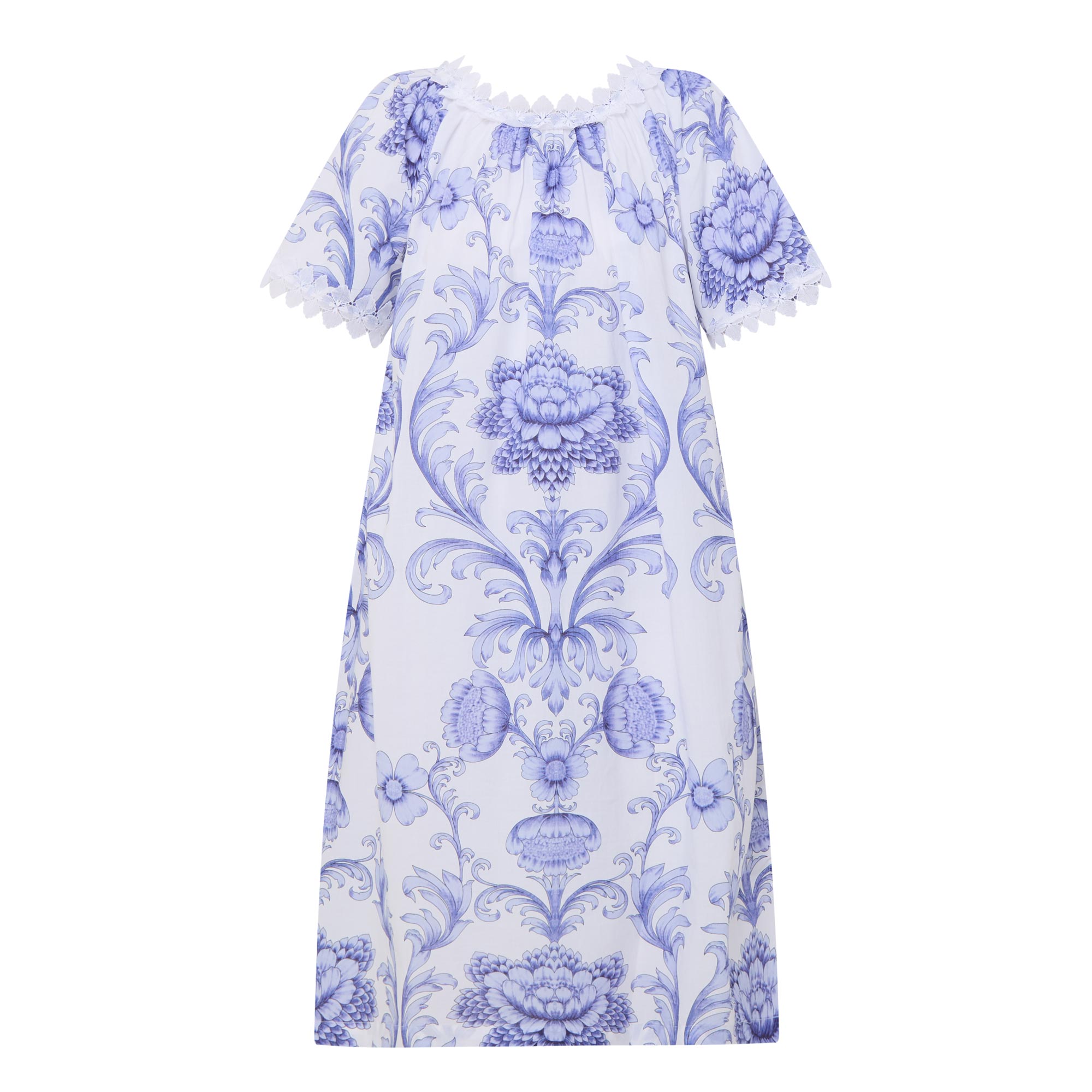 - Round pleated neckline, short sleeves, lace trim detailing, flared hem, Grand Crest print, midi length