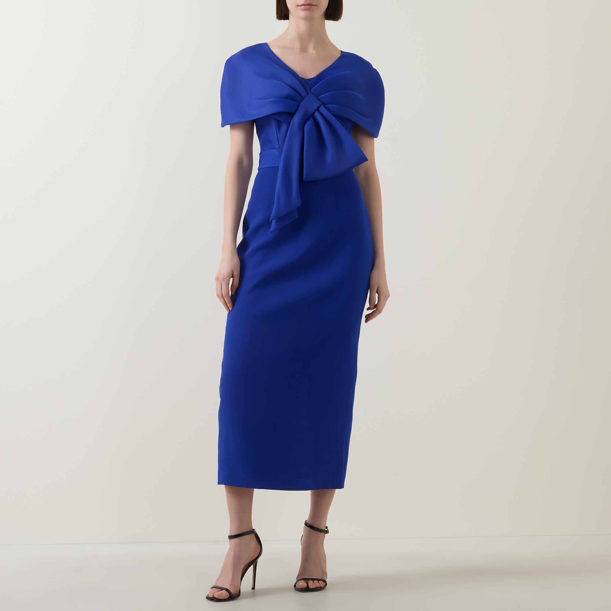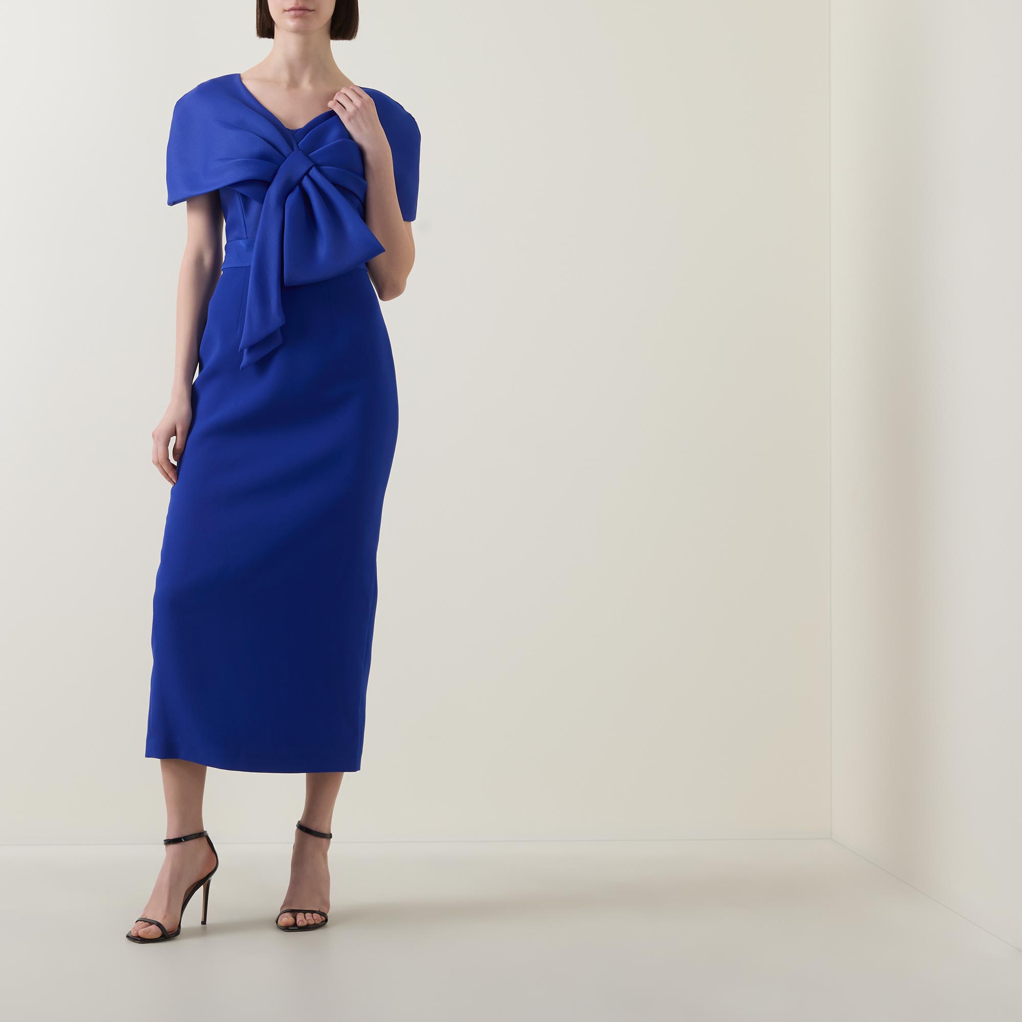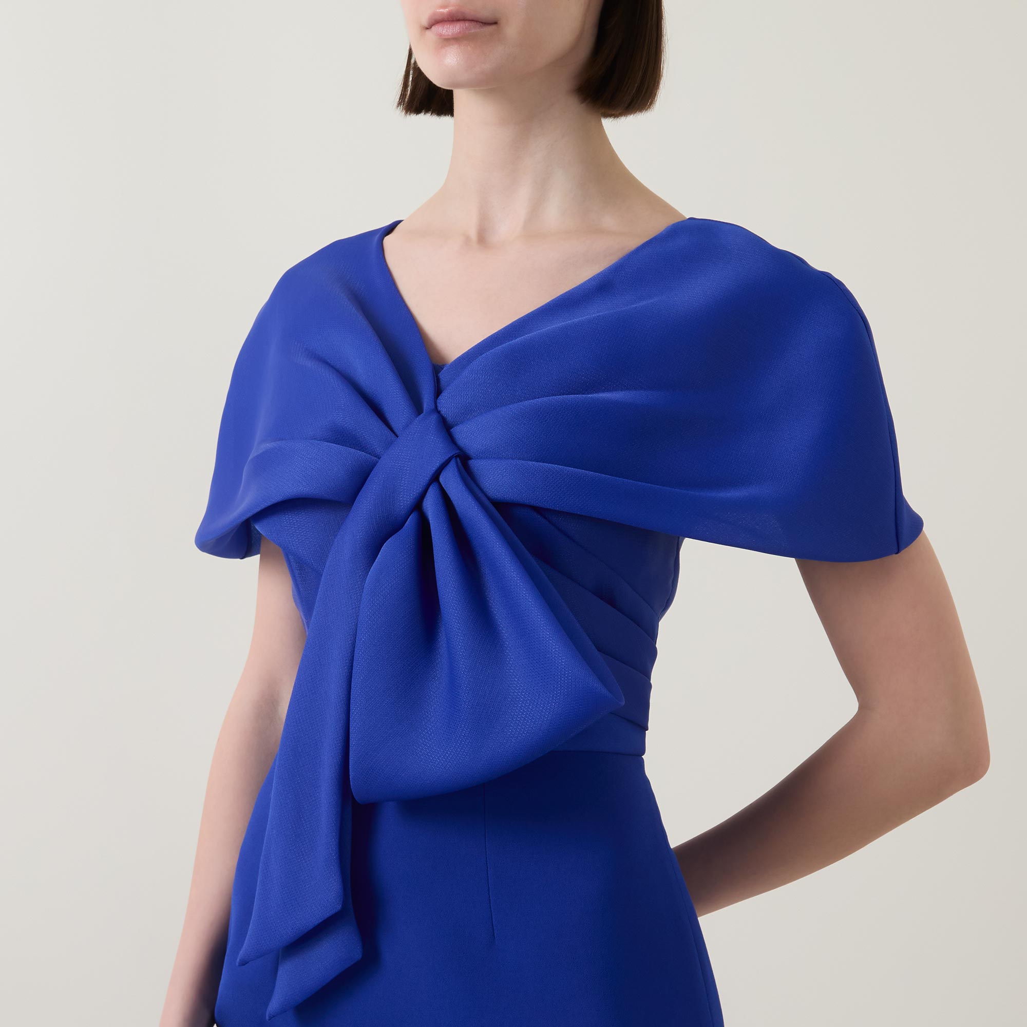 - Bardot neckline, draped details, vent to the back, short sleeves, midi length, zip fastening, detachable cape detail with bow embellishment to the front