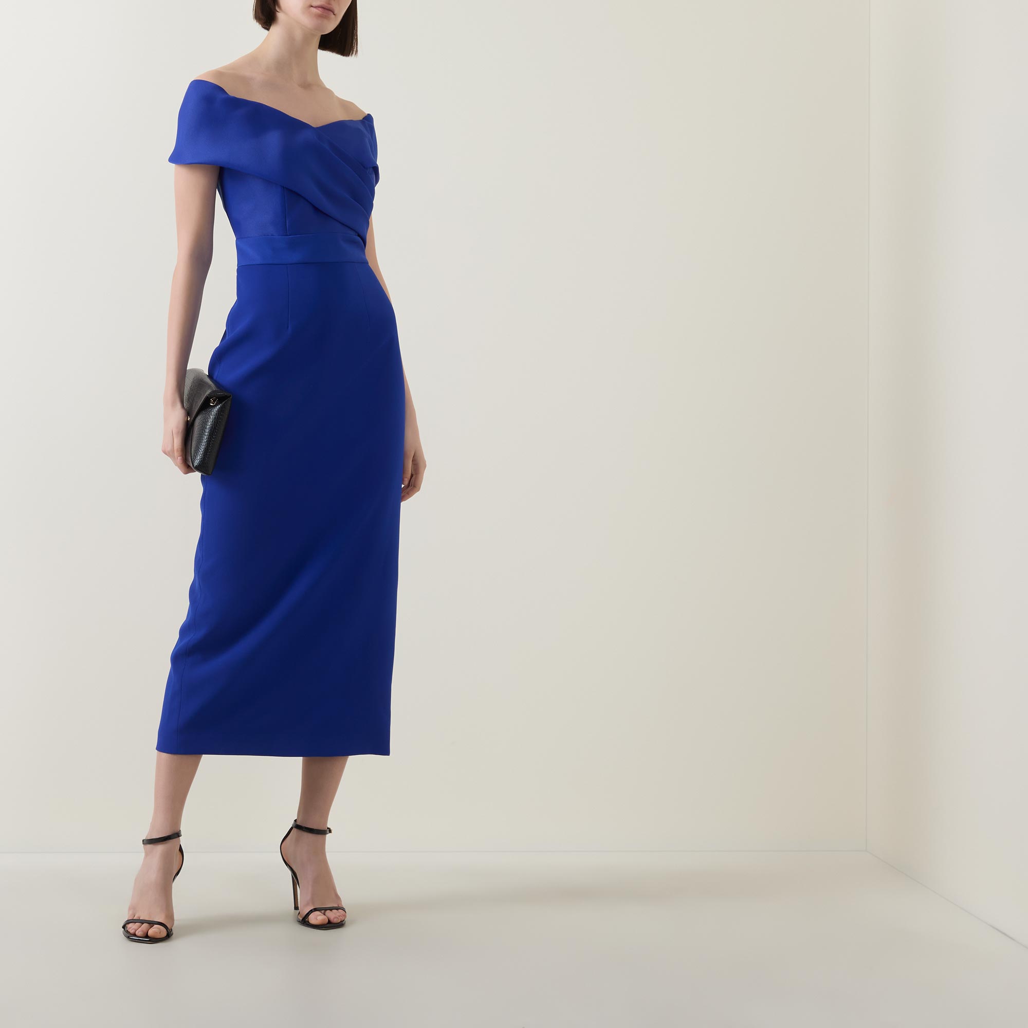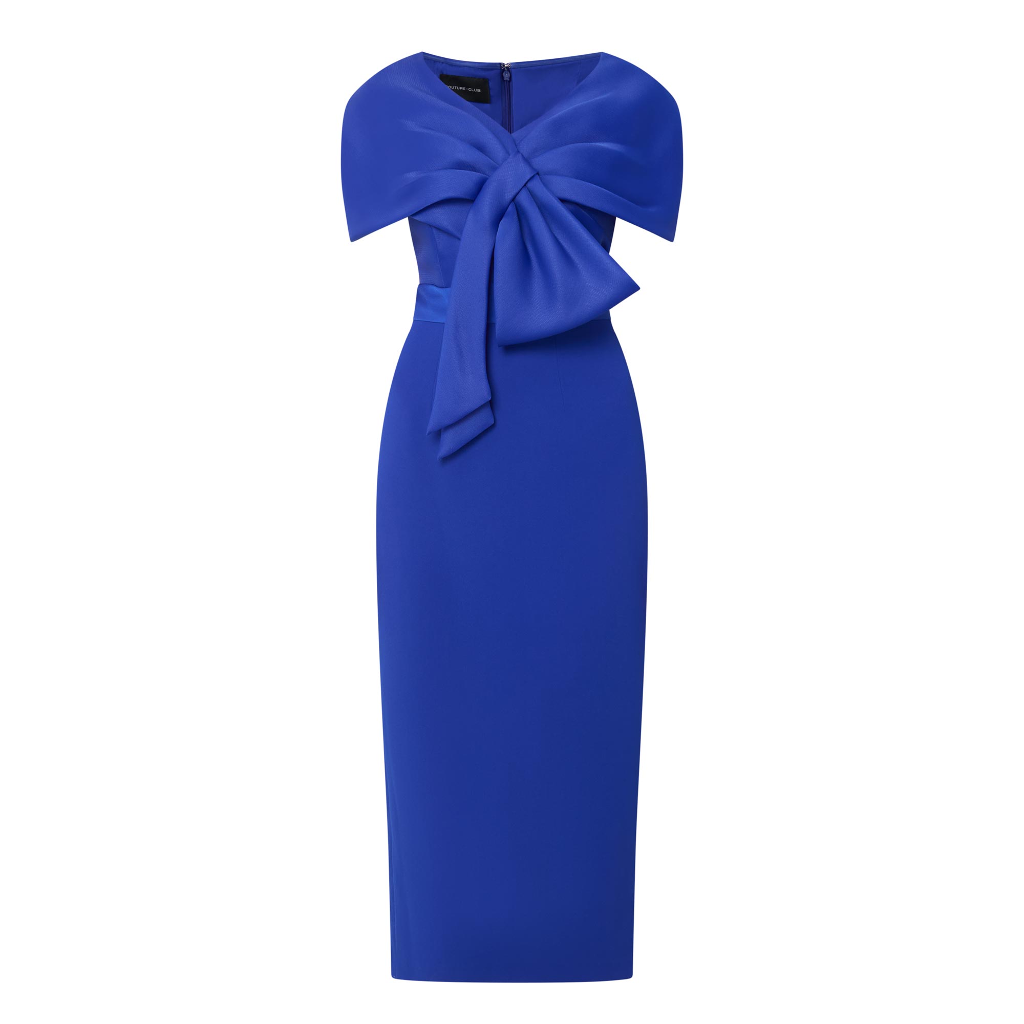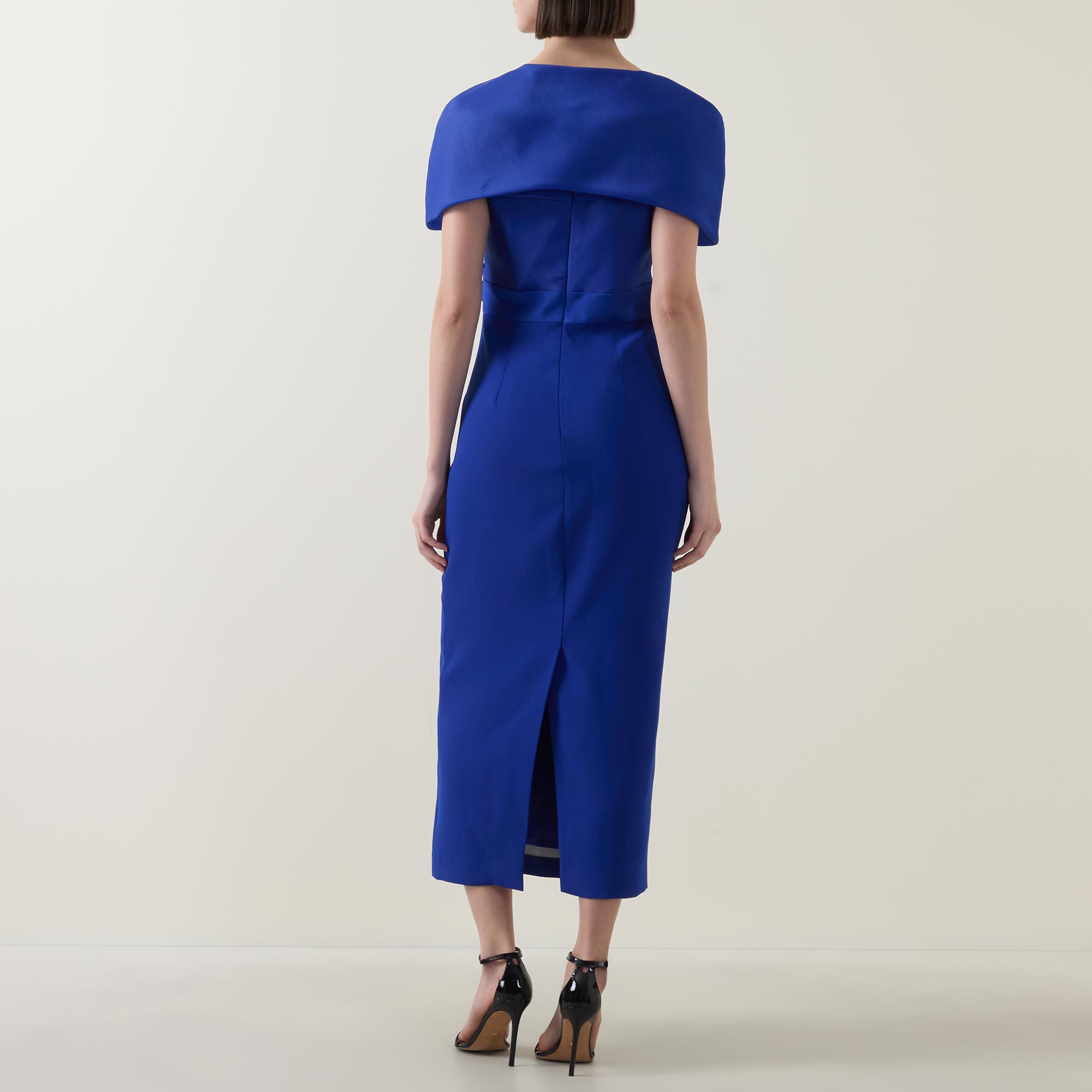 - Bardot neckline, draped details, vent to the back, short sleeves, midi length, zip fastening, detachable cape detail with bow embellishment to the front