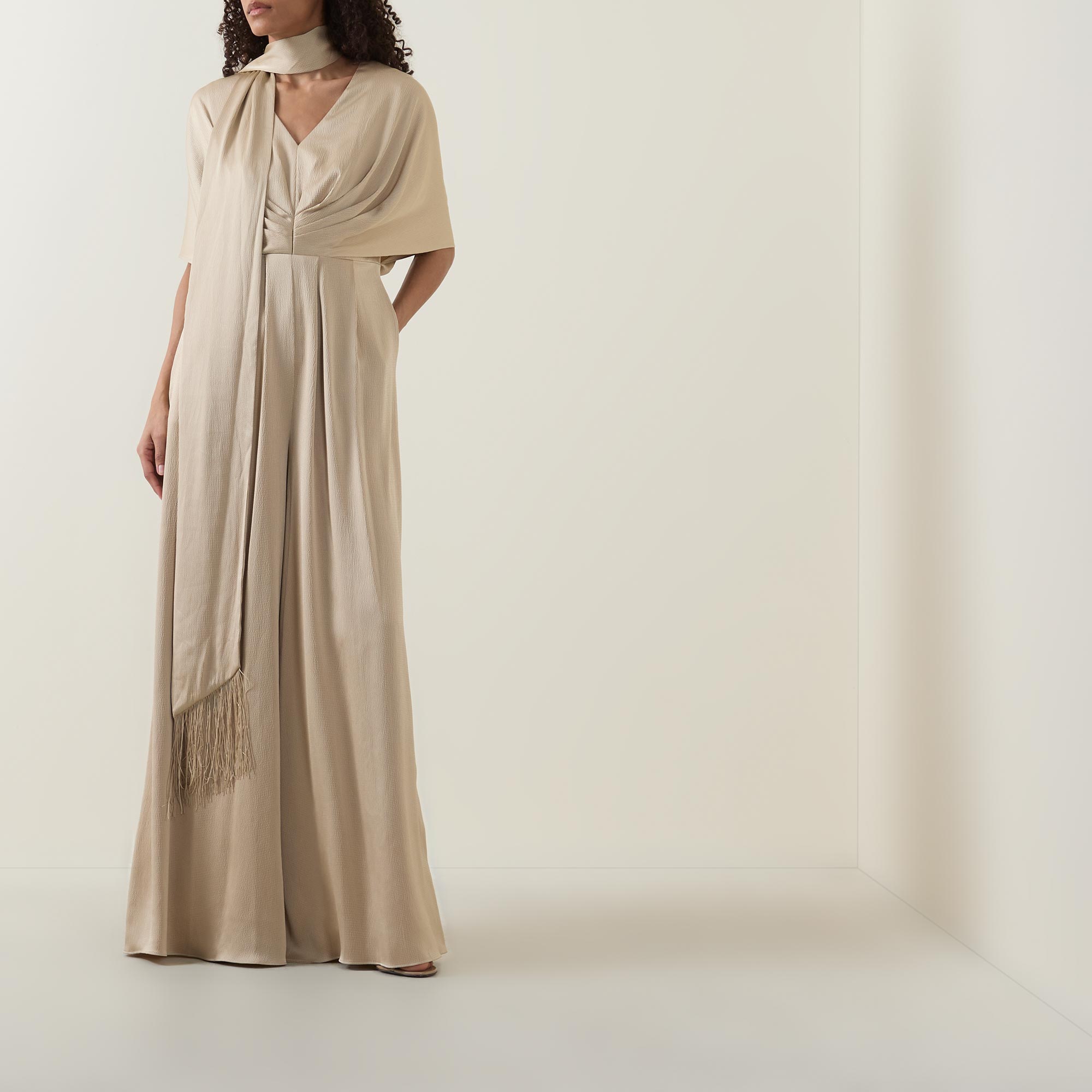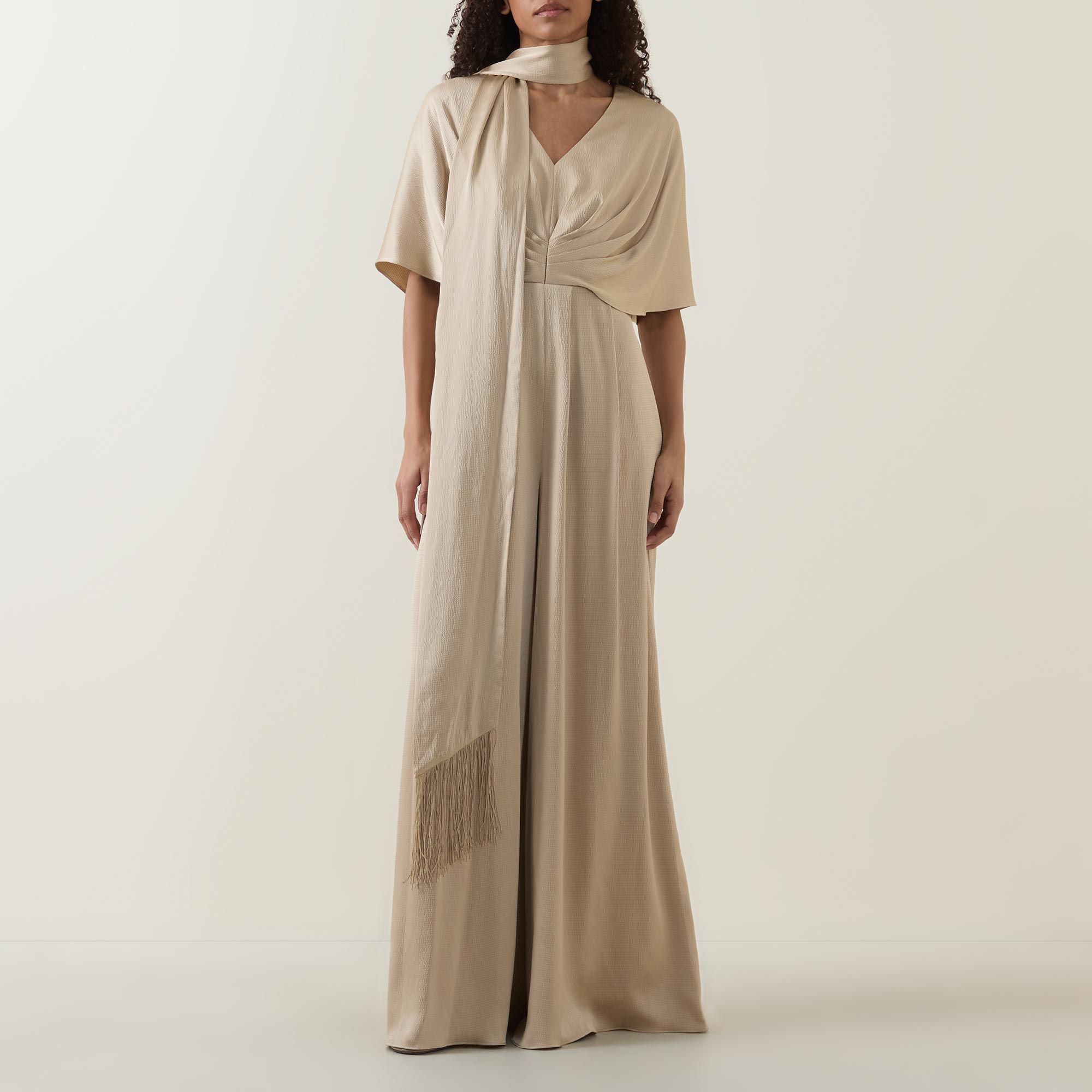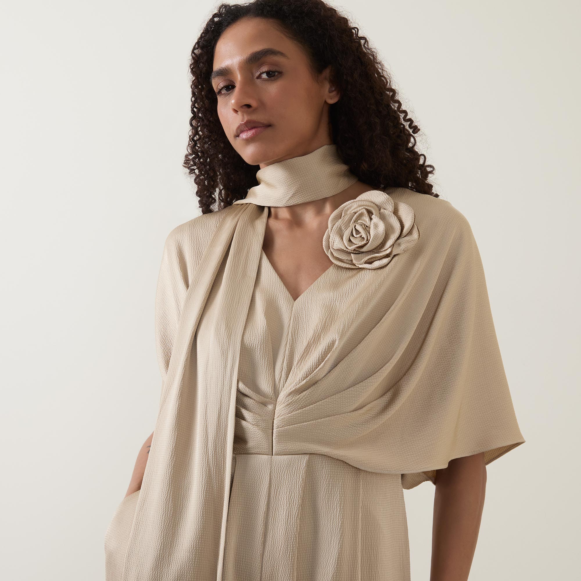 • V-neckline, rear keyhole and button fastening, half length sleeves, large removable floral appliqué, draped bodice, rear concealed zip closure, fitted through the waist, wide leg design, satin finish, includes fringed neck scarf