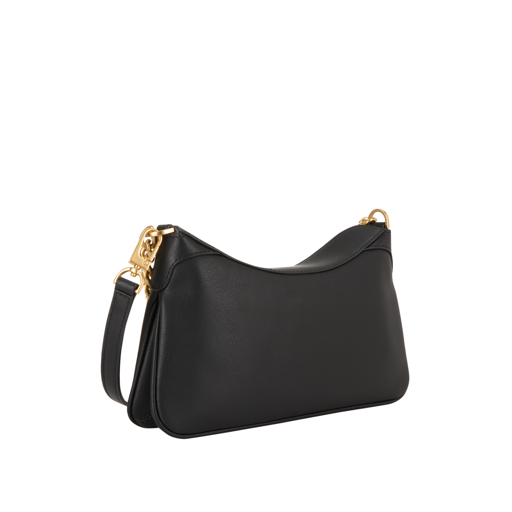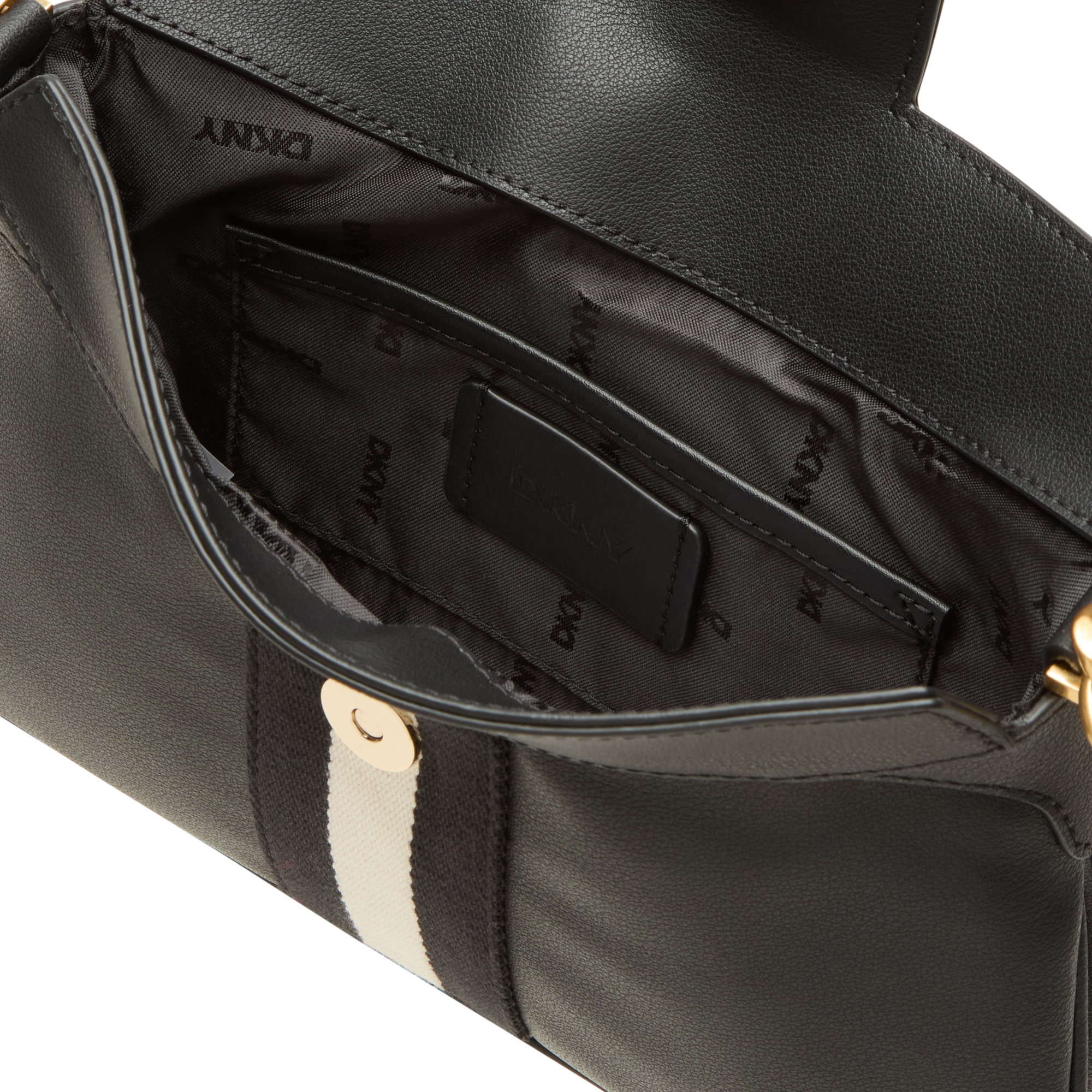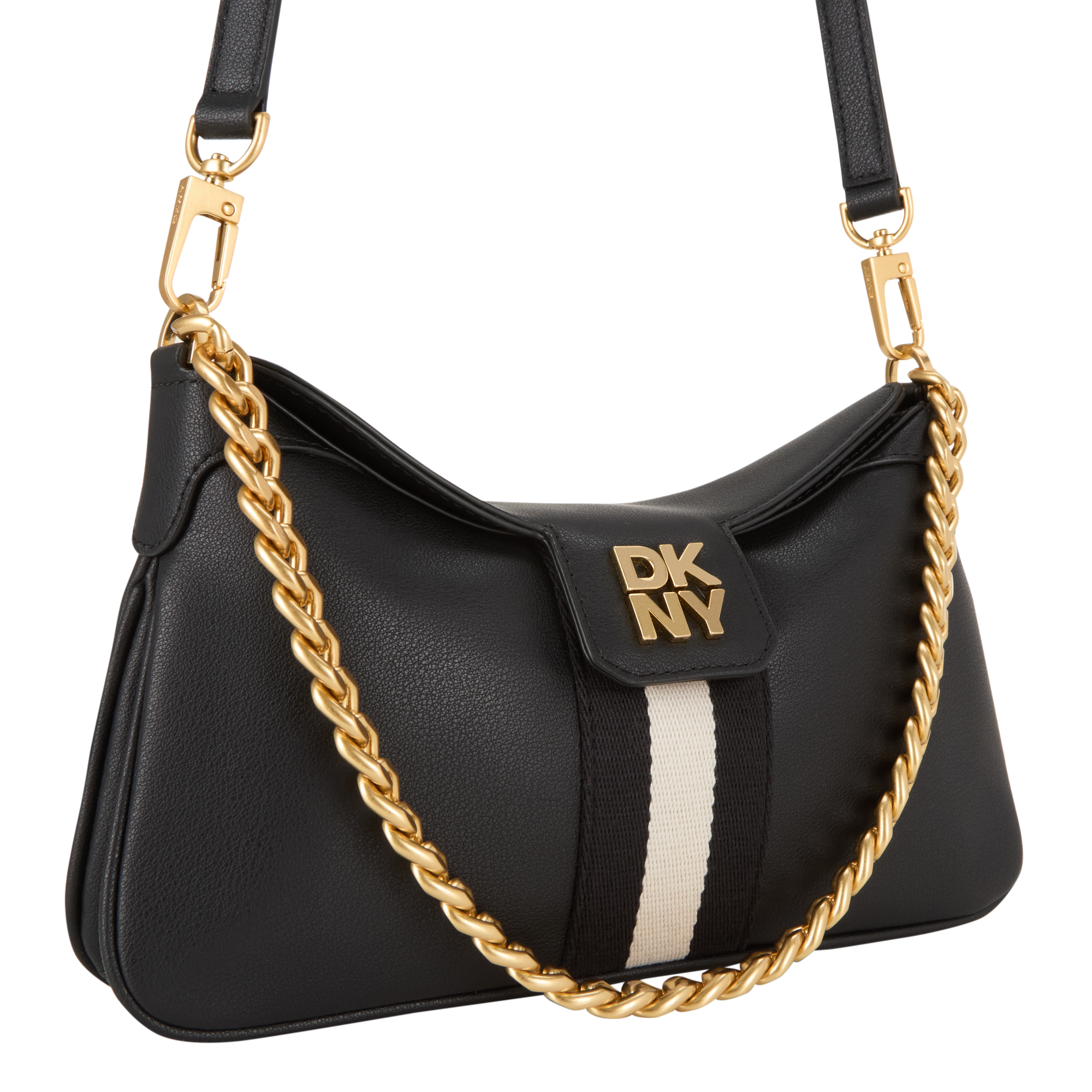 - Chain shoulder strap, detachable and adjustable crossbody strap, flap and magnetic button closure, webbed stripe detailing, gold-tone hardware, logo embellishment to the front