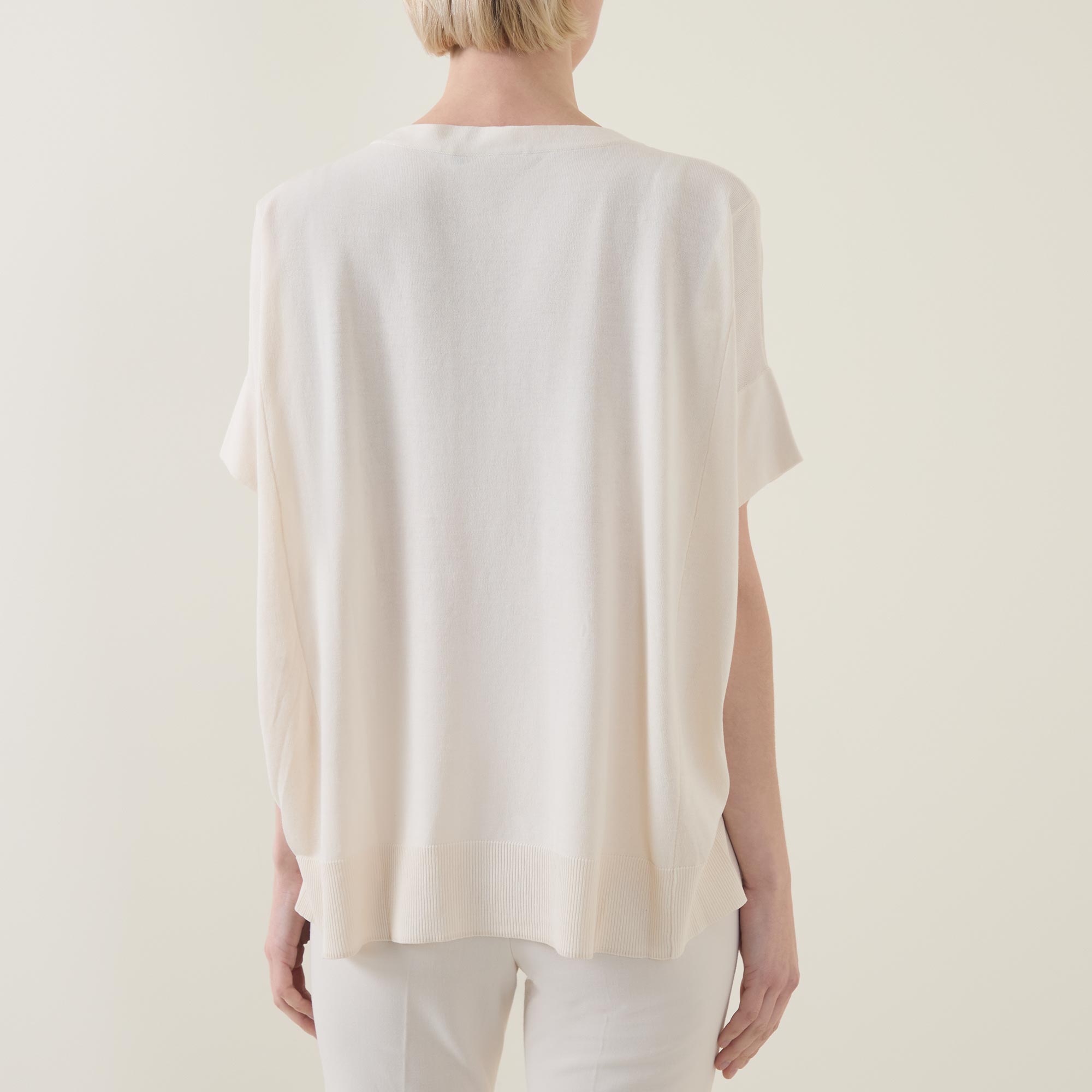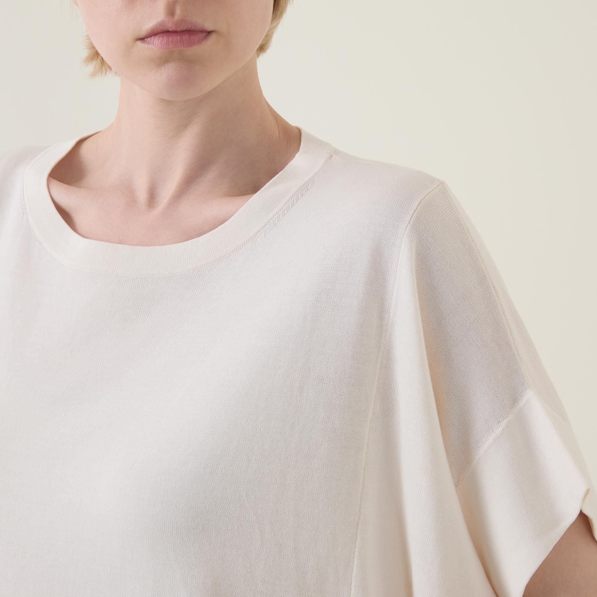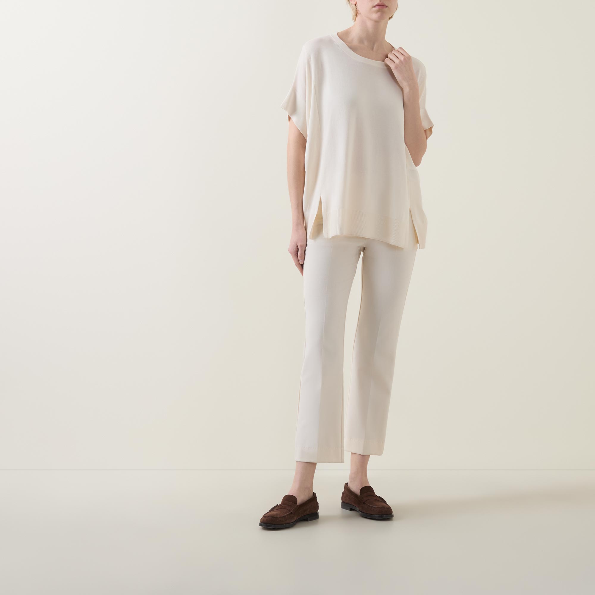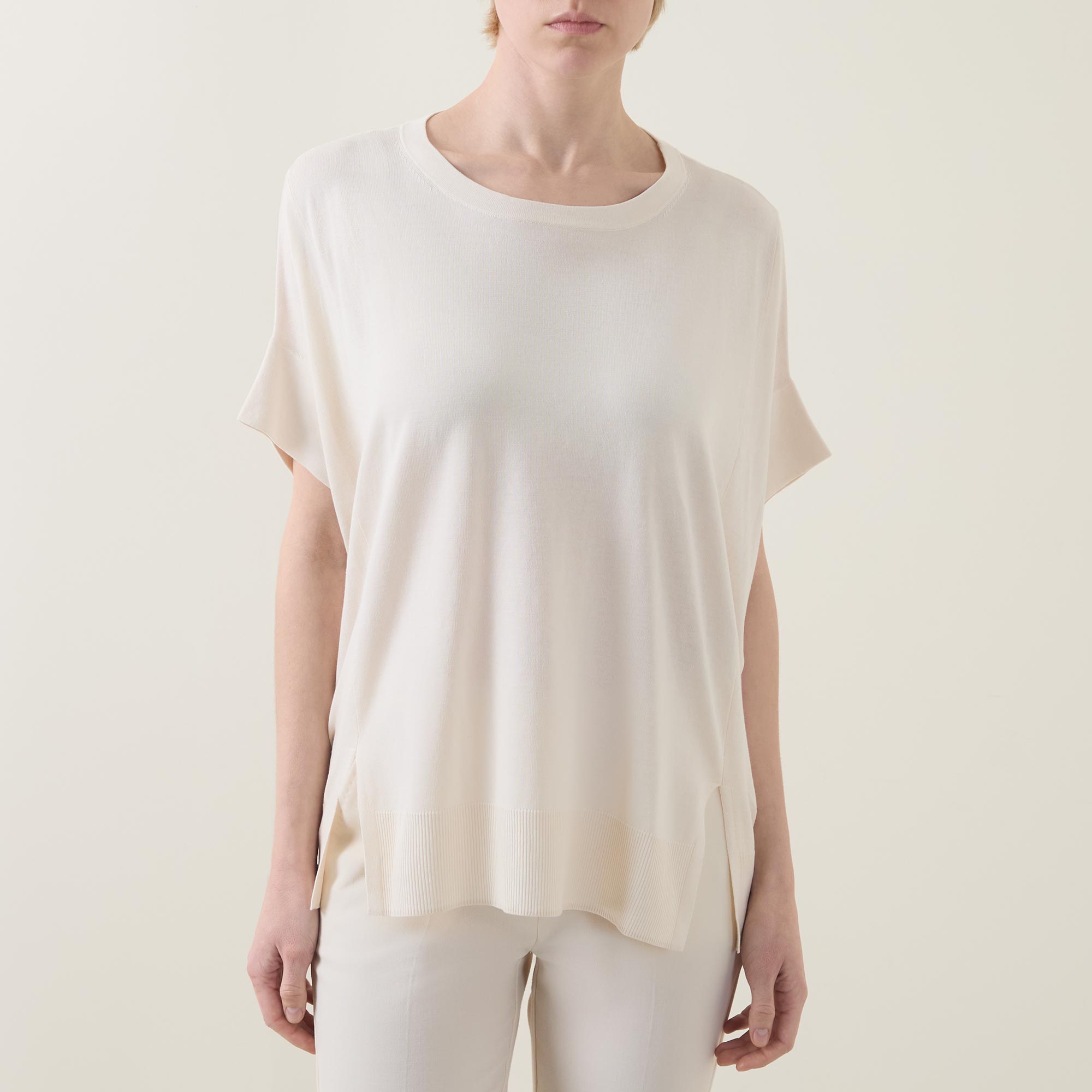 - Round neckline, relaxed short sleeves, split side seams, ribbed trims, fine knit structure