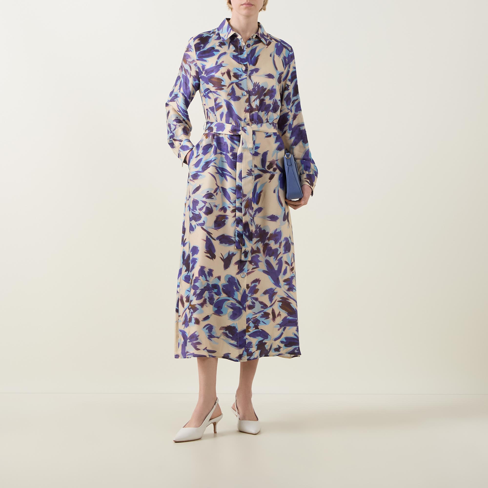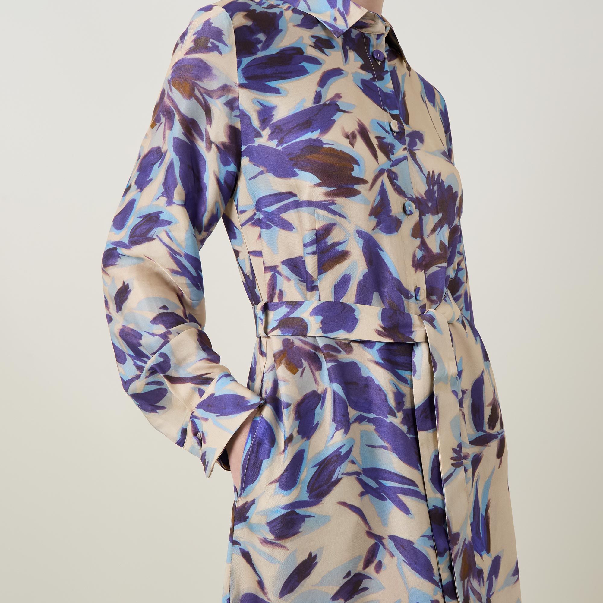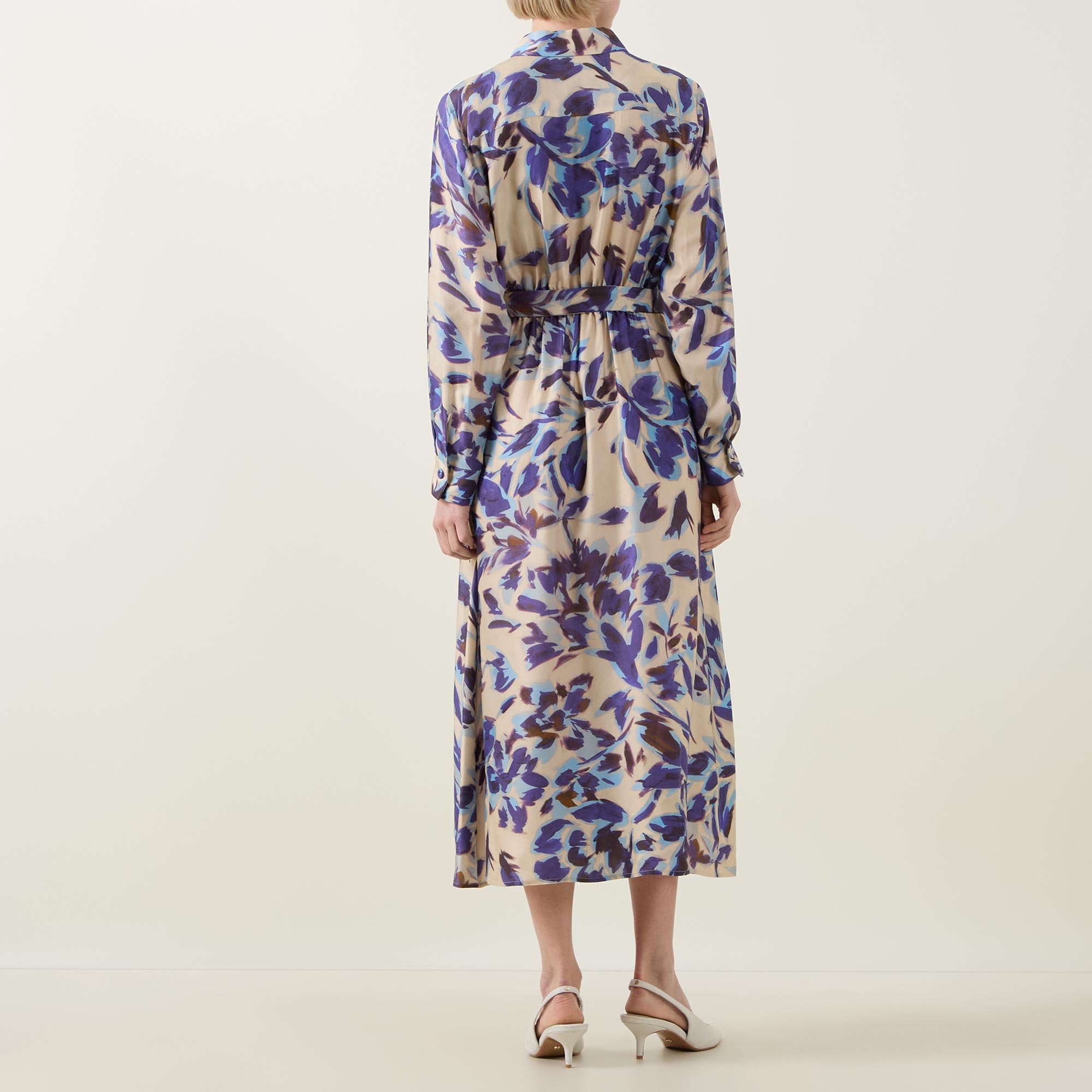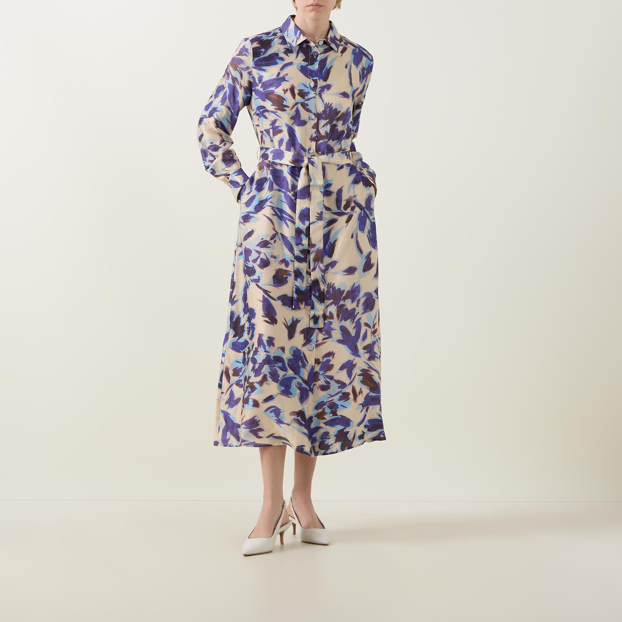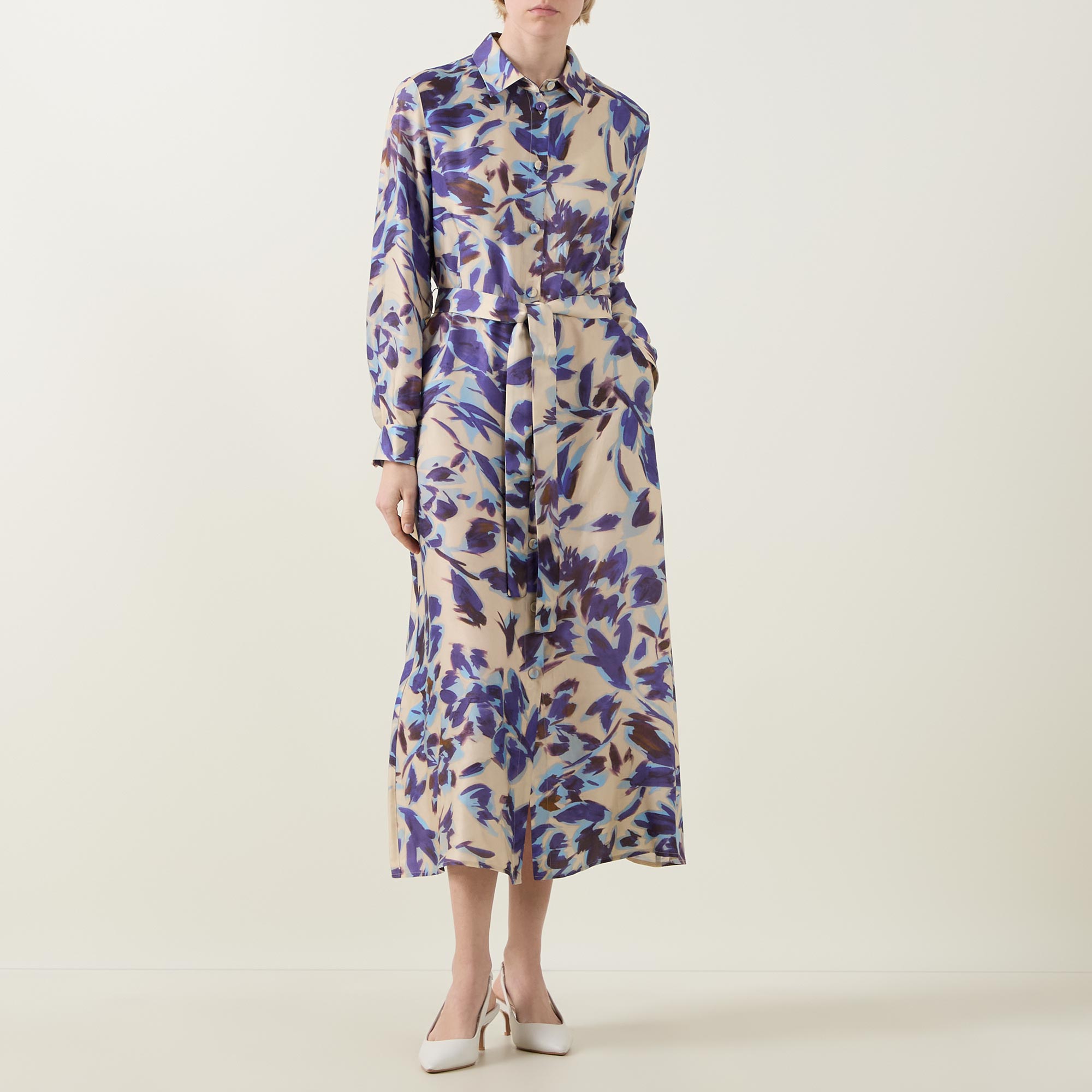 - Collared neckline, long blouson sleeves, full button fastening, midi length, self-tie belt, belt loops, side entry pockets, floral pattern