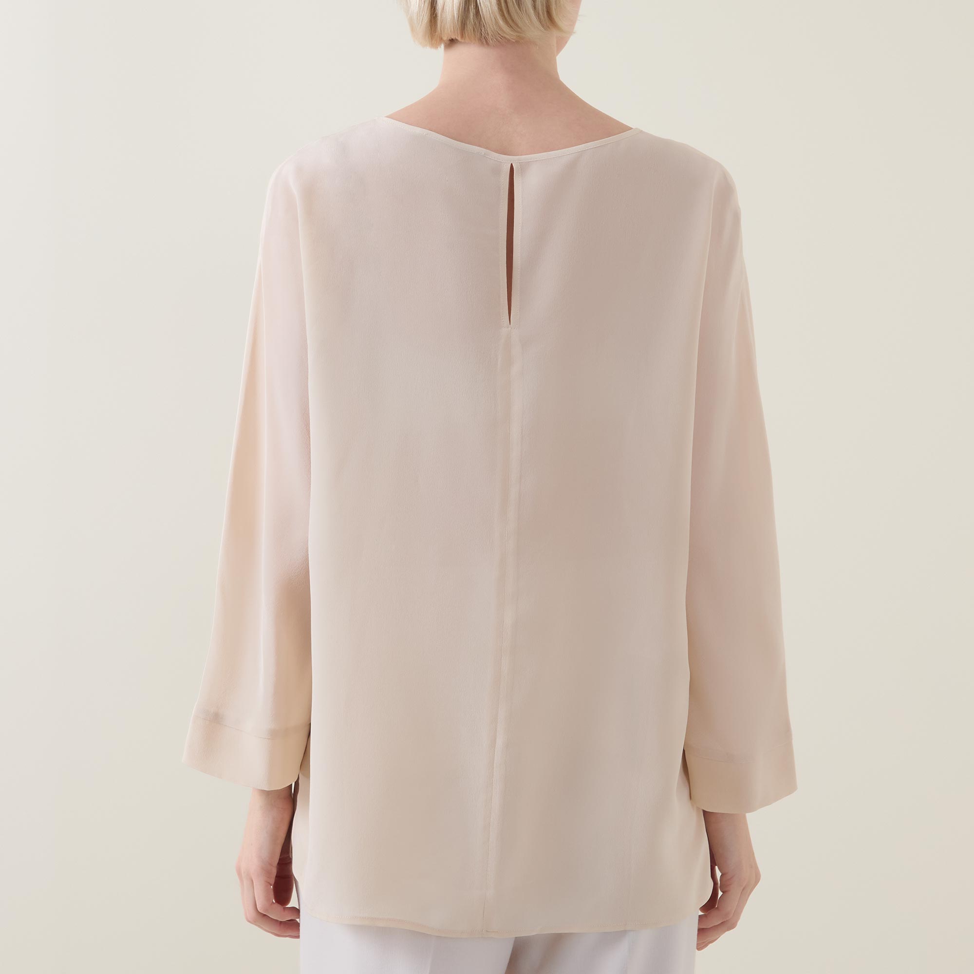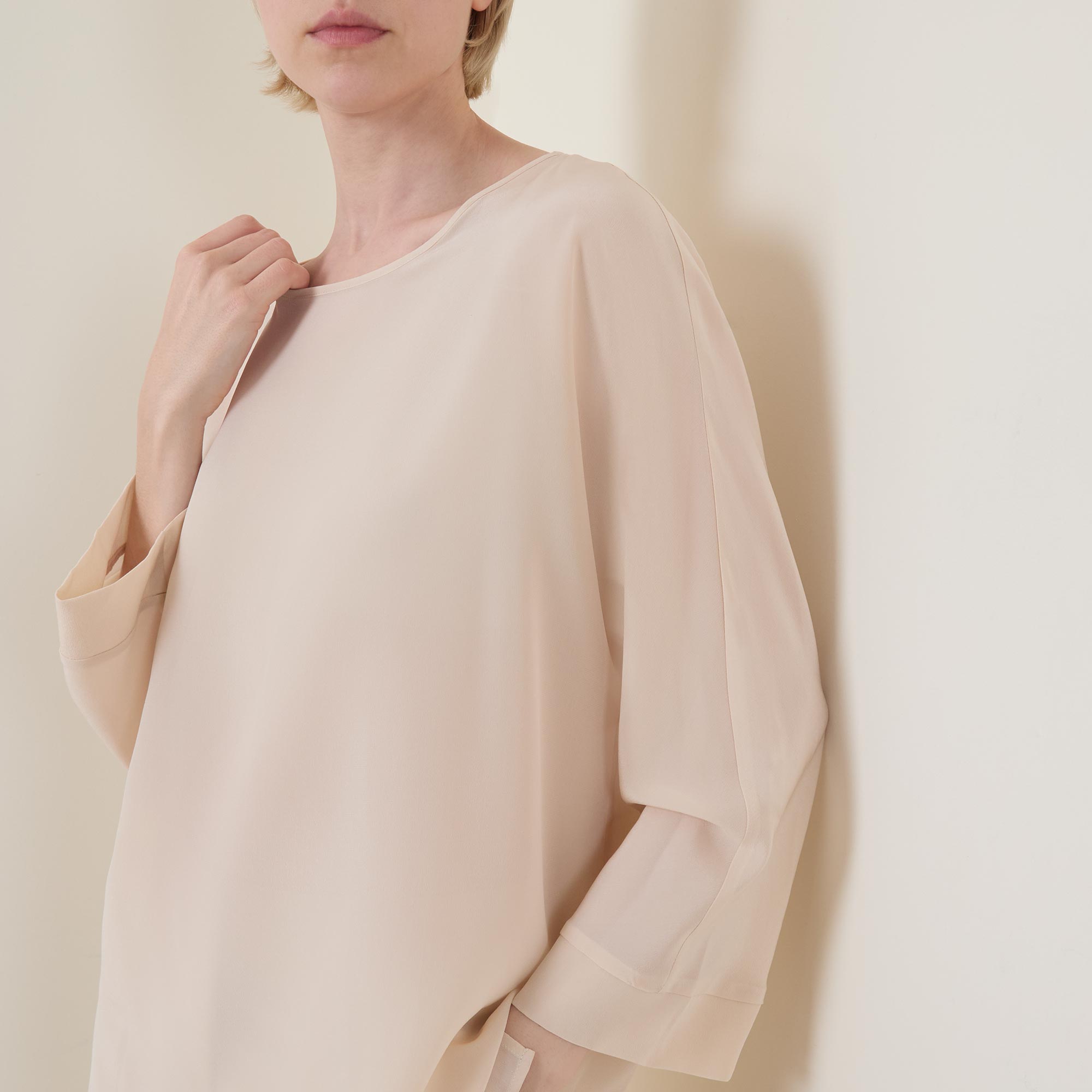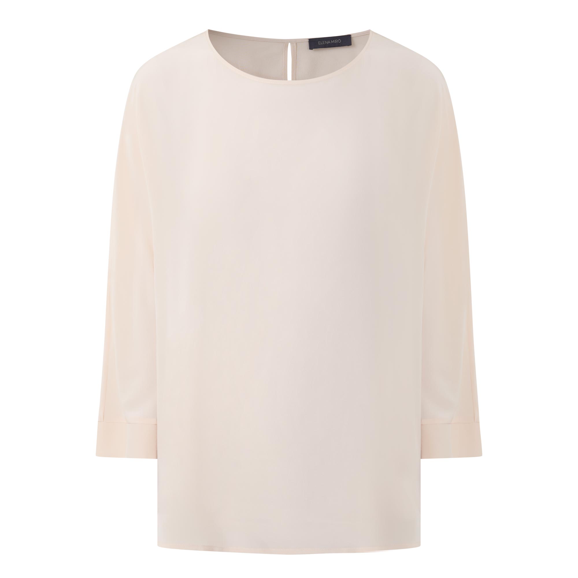 • Round neckline, button and loop fastening to the back, three-quarter-length sleeves, sheer finish, unlined, slightly dipped hemline