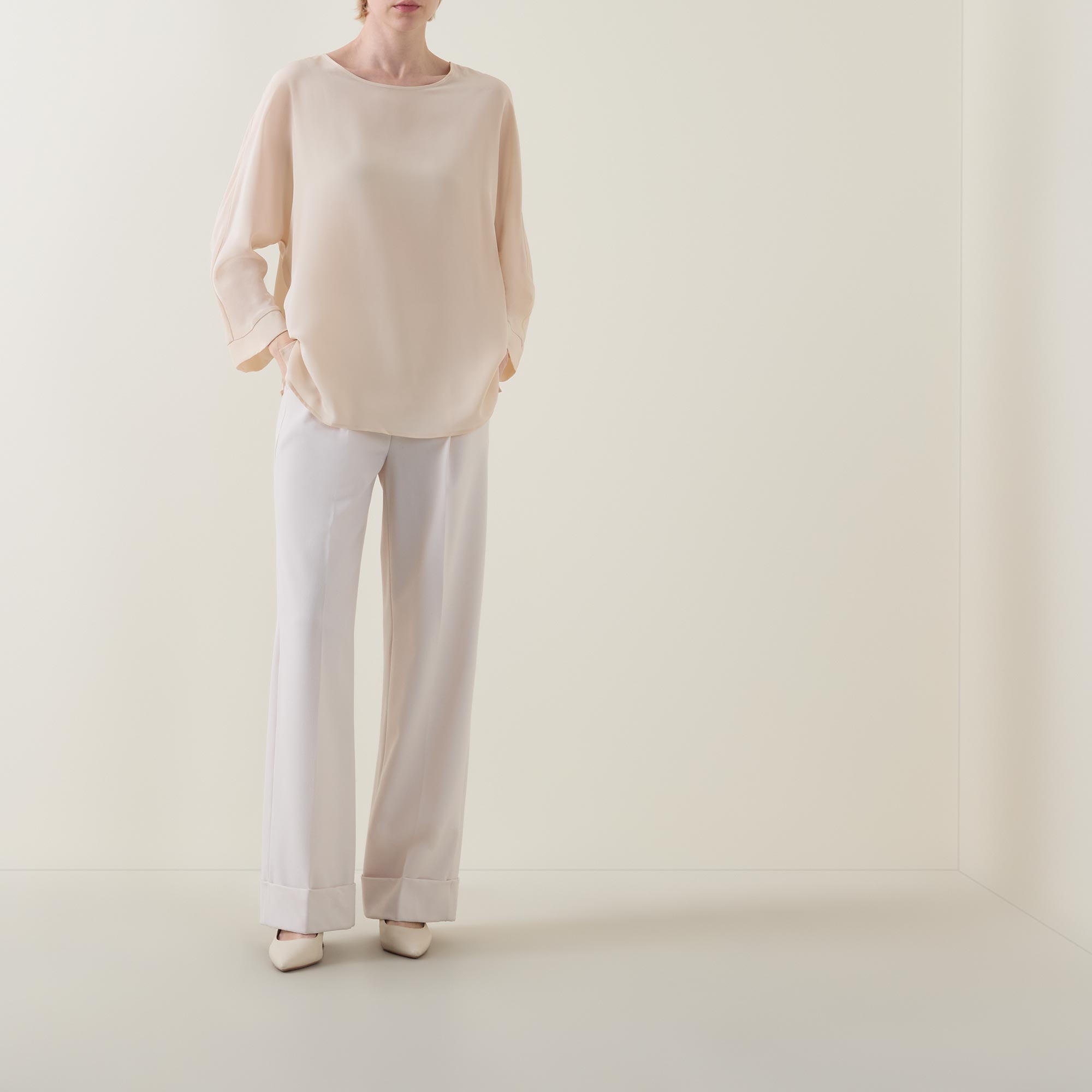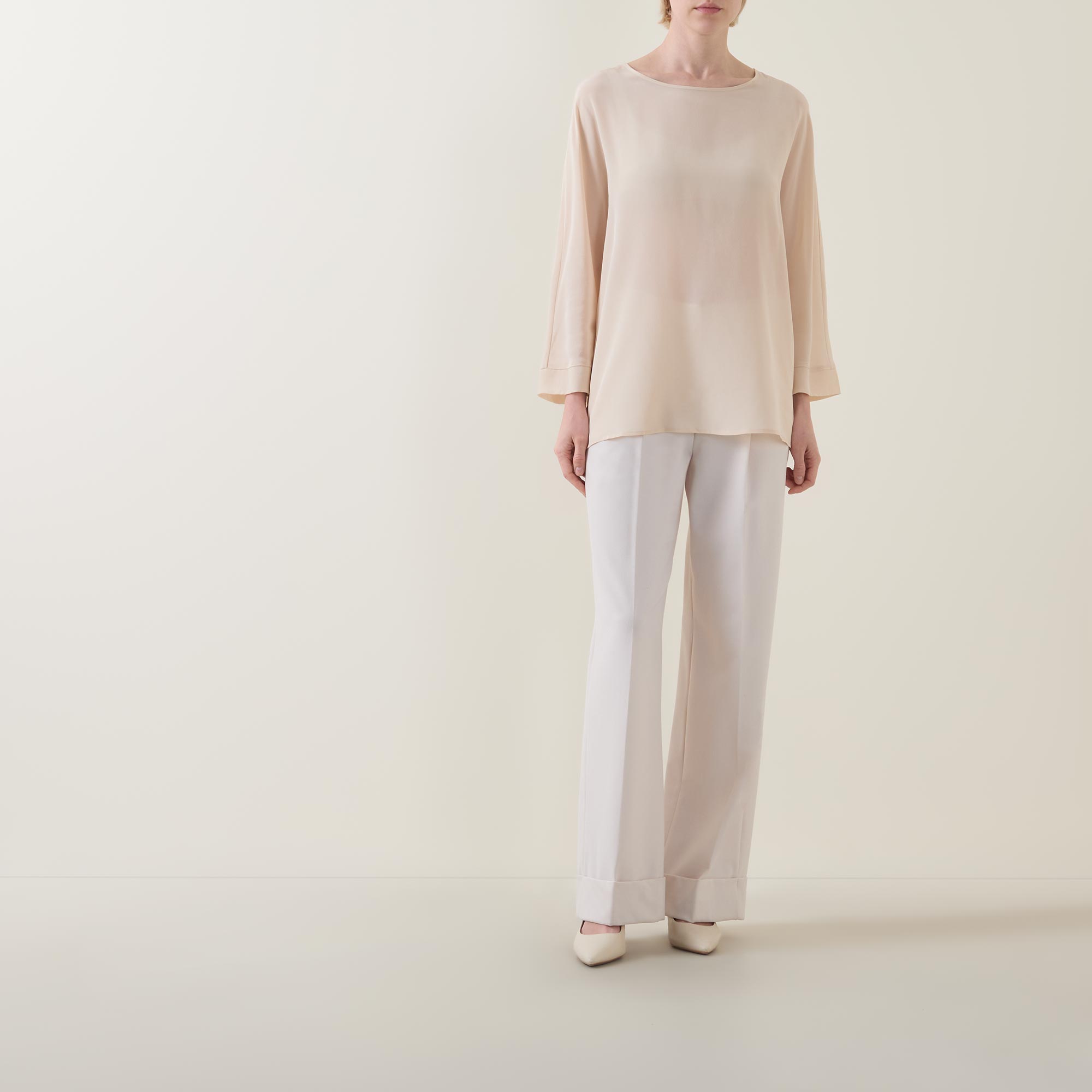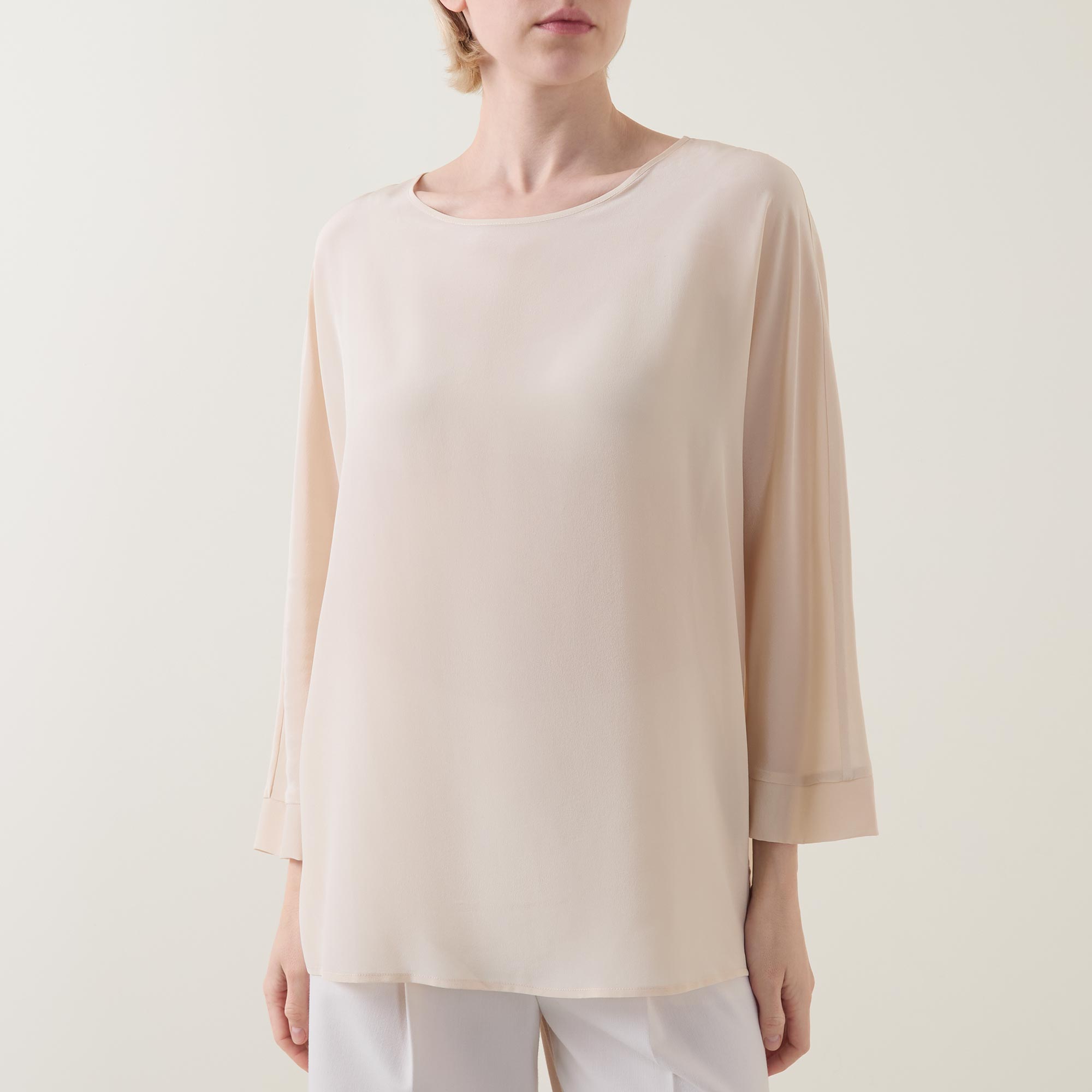 • Round neckline, button and loop fastening to the back, three-quarter-length sleeves, sheer finish, unlined, slightly dipped hemline
