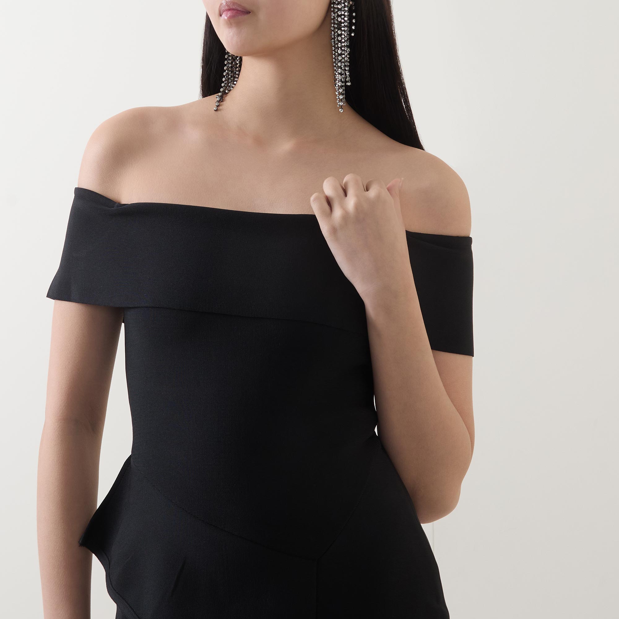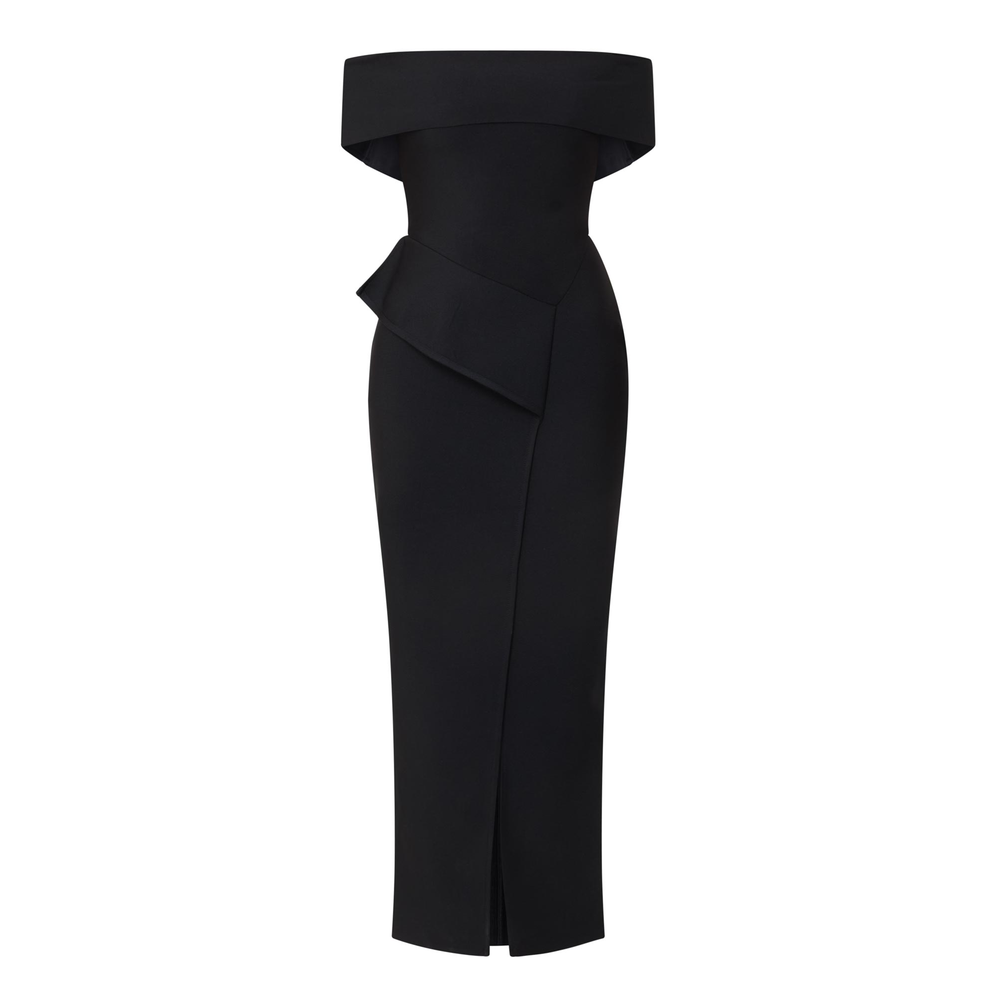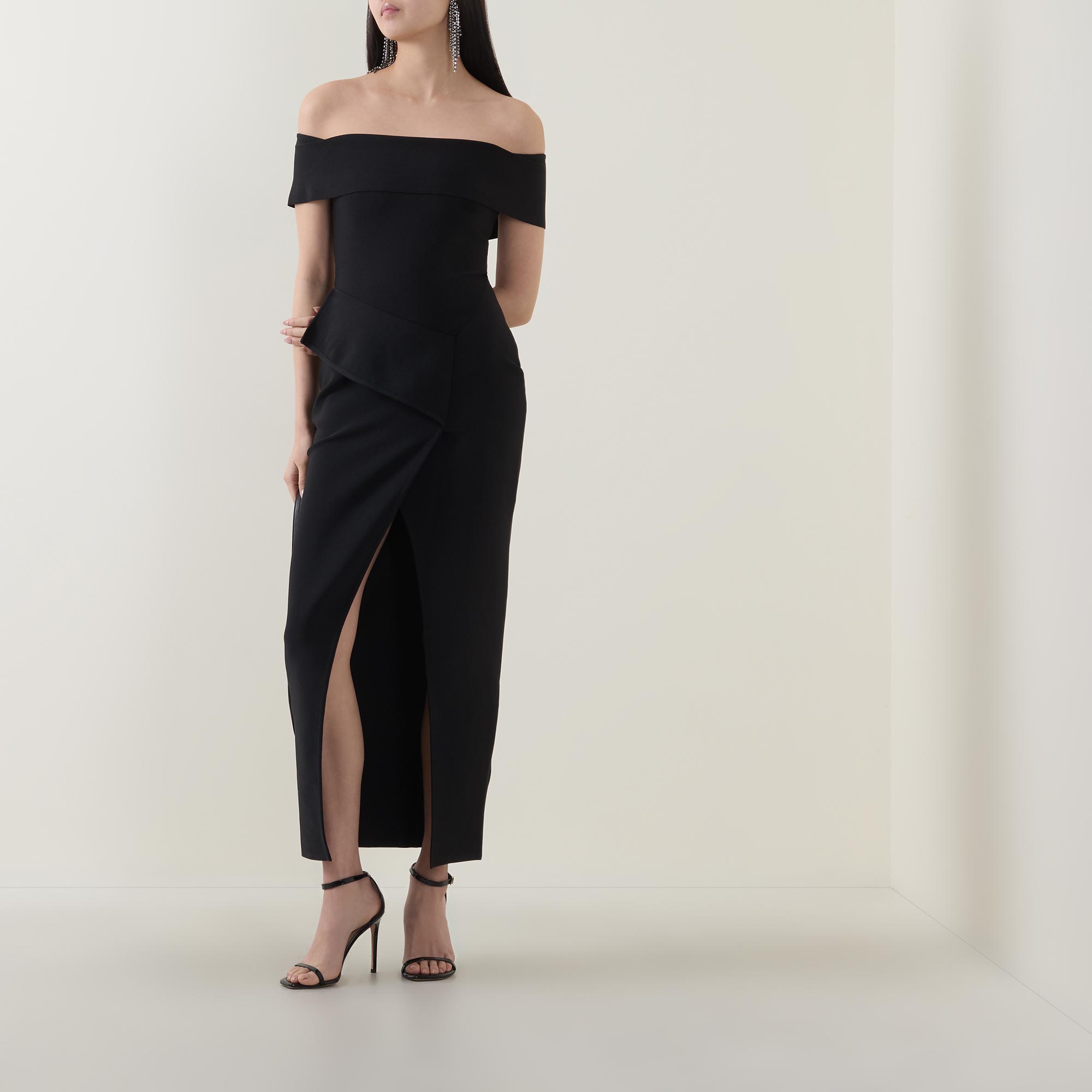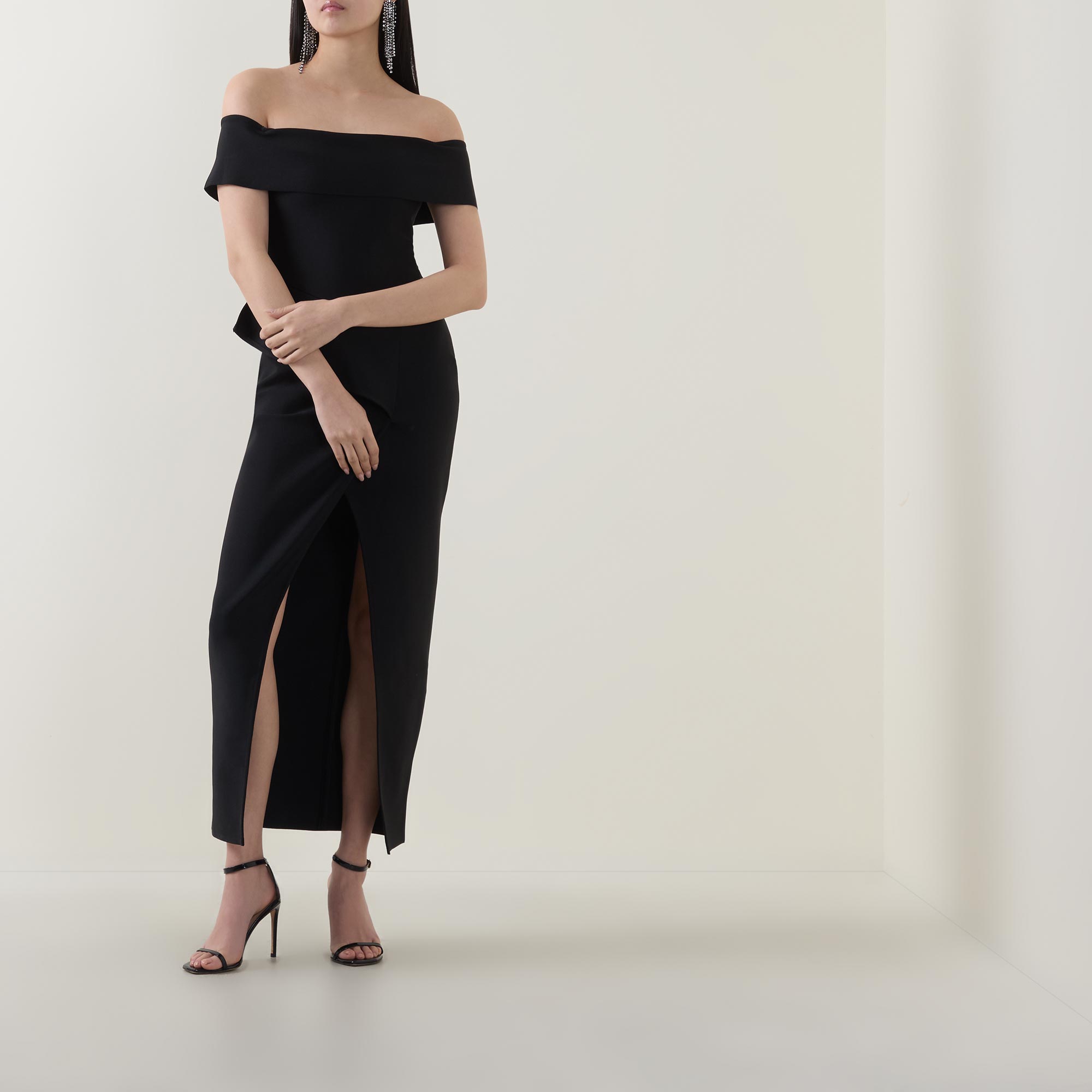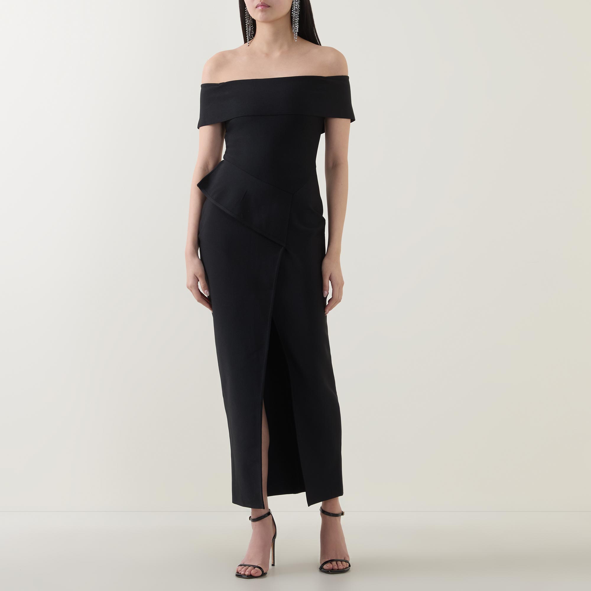 - Off-the-shoulder design, straight neckline, concealed rear zip fastening, fitted through the waist, half peplum hem, full wrap-style pencil skirt, front split, maxi length