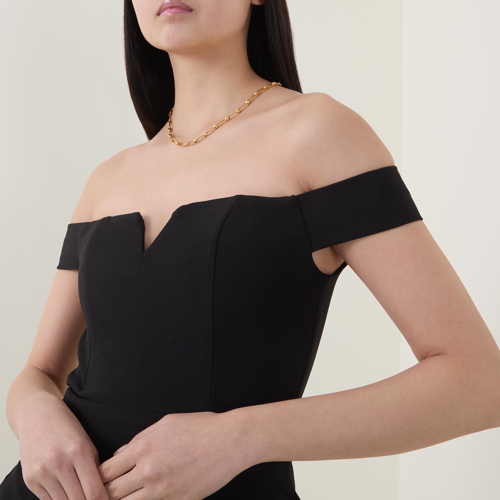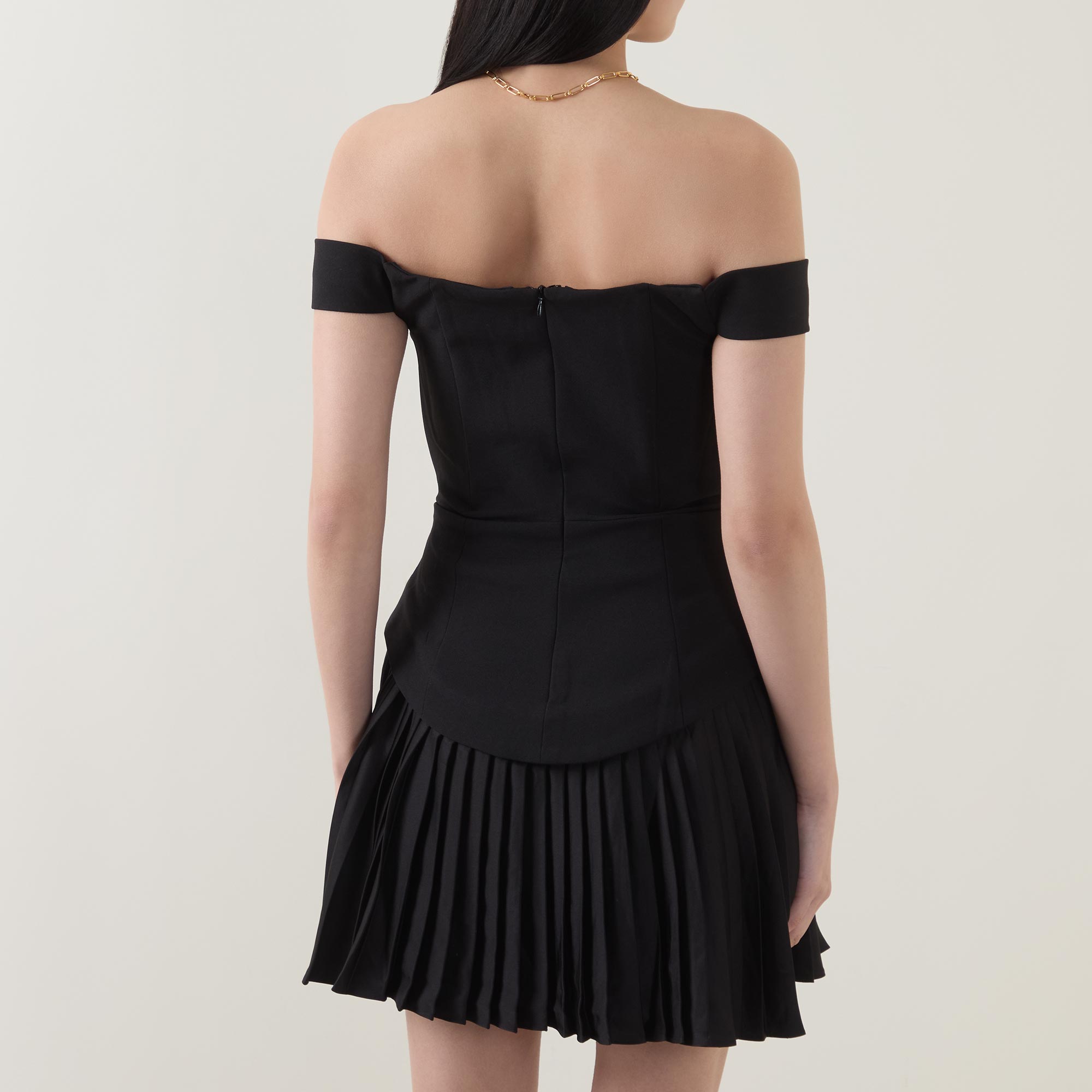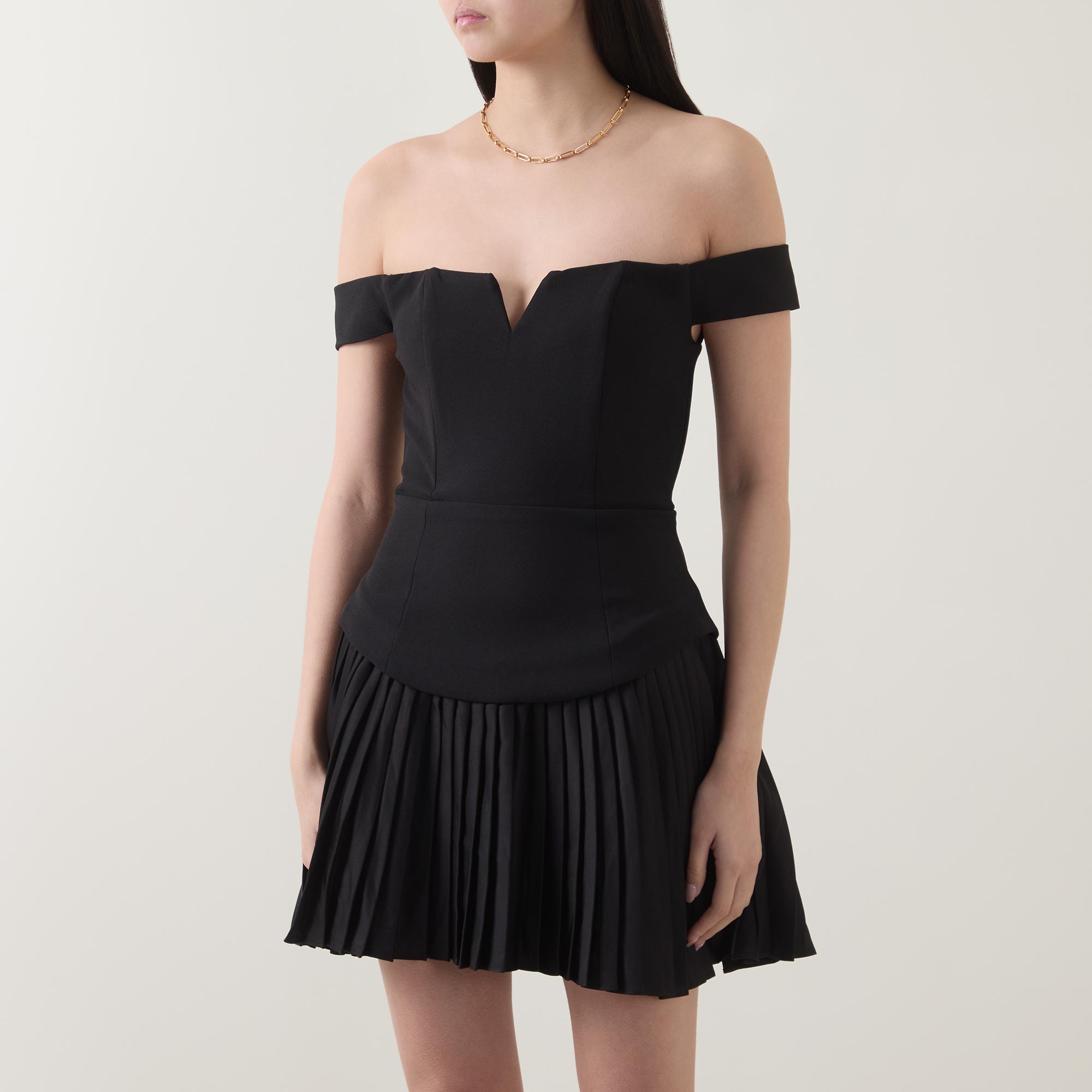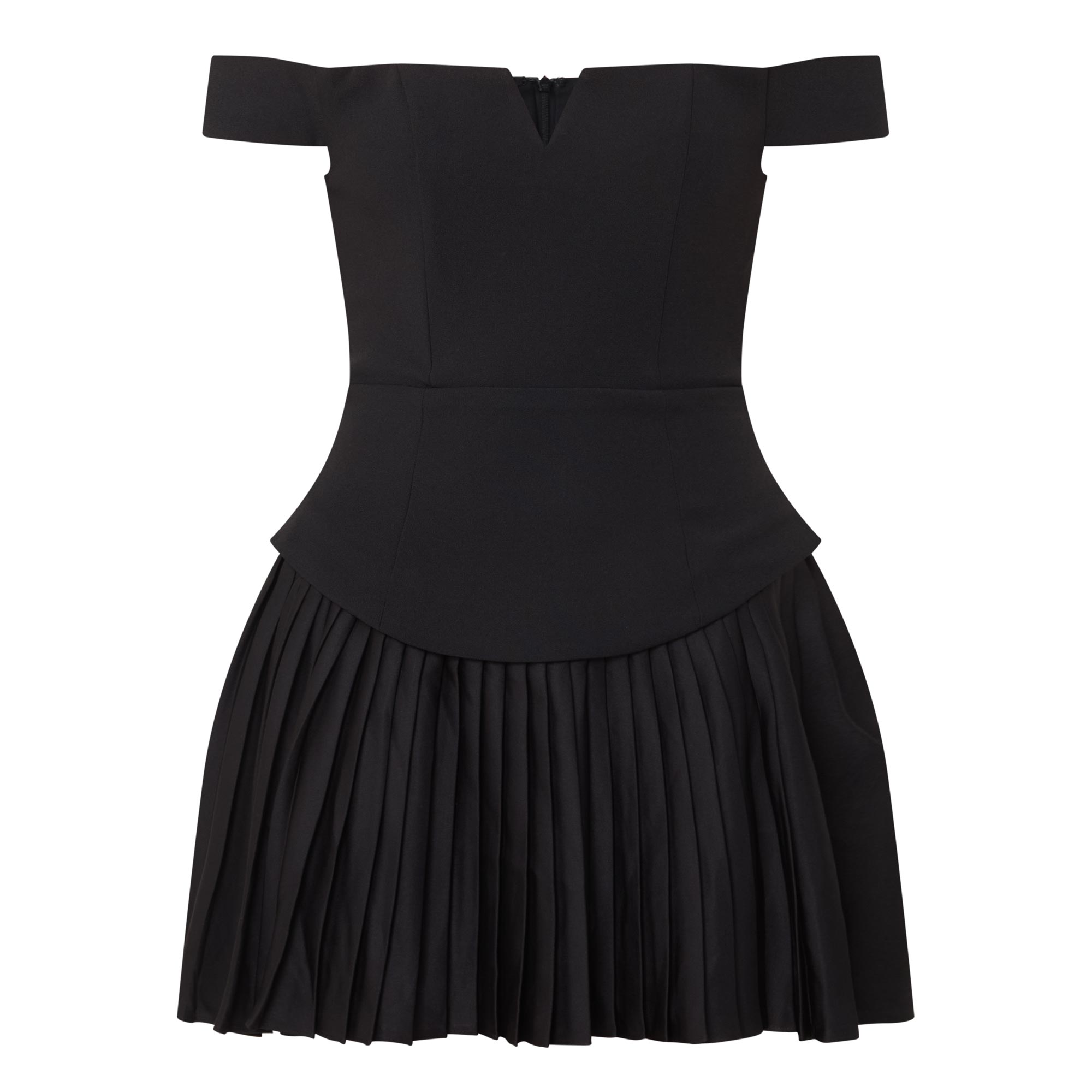 - Off-the-shoulder design, V-shaped insert, concealed rear zip fastening, dropped curved waistline, full pleated skirt, mini length, lined
