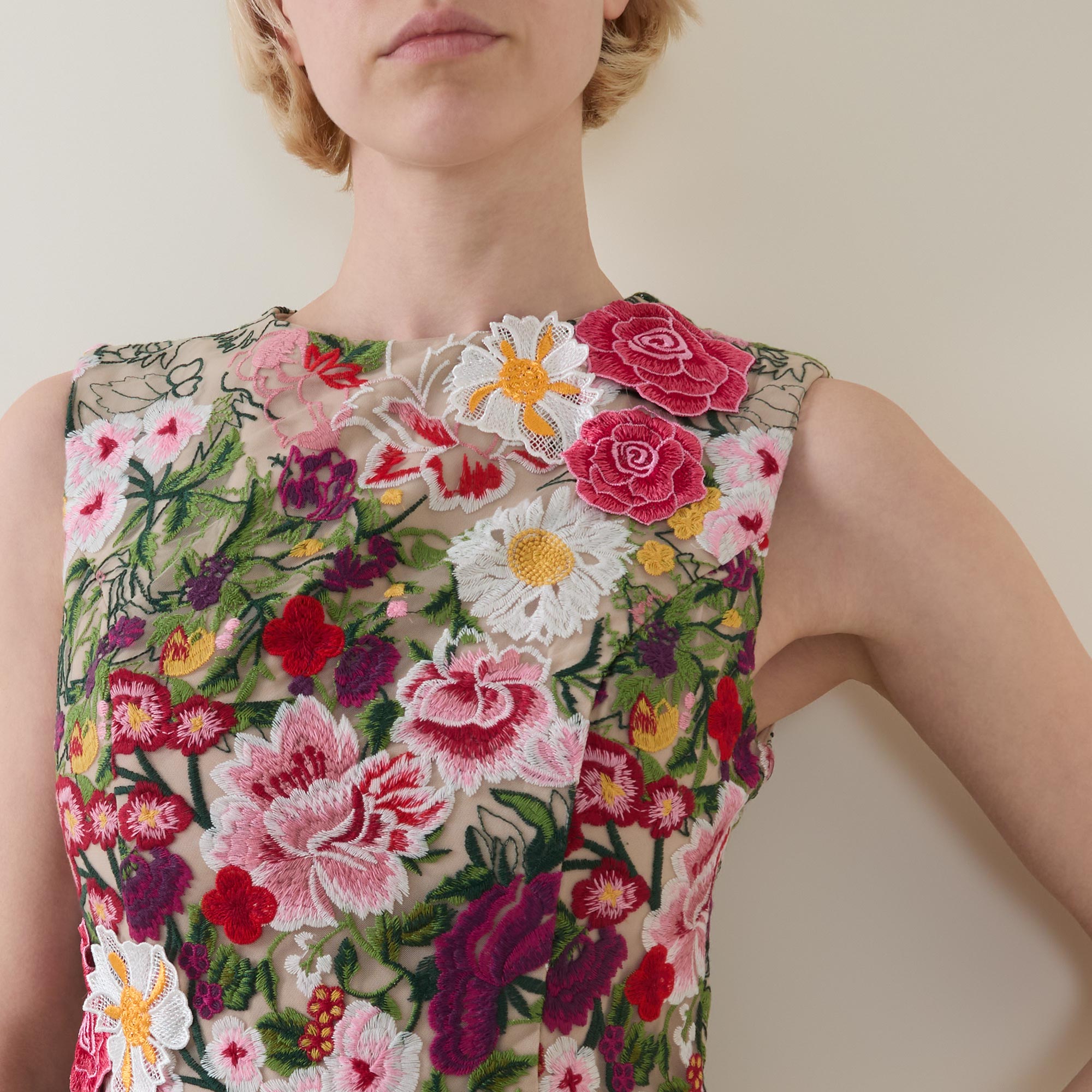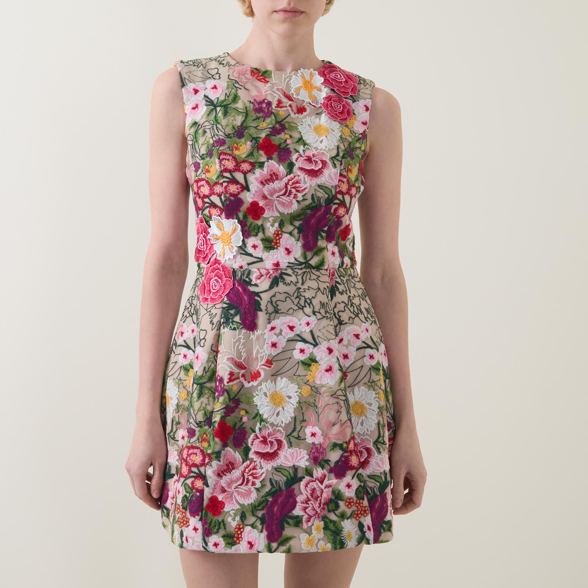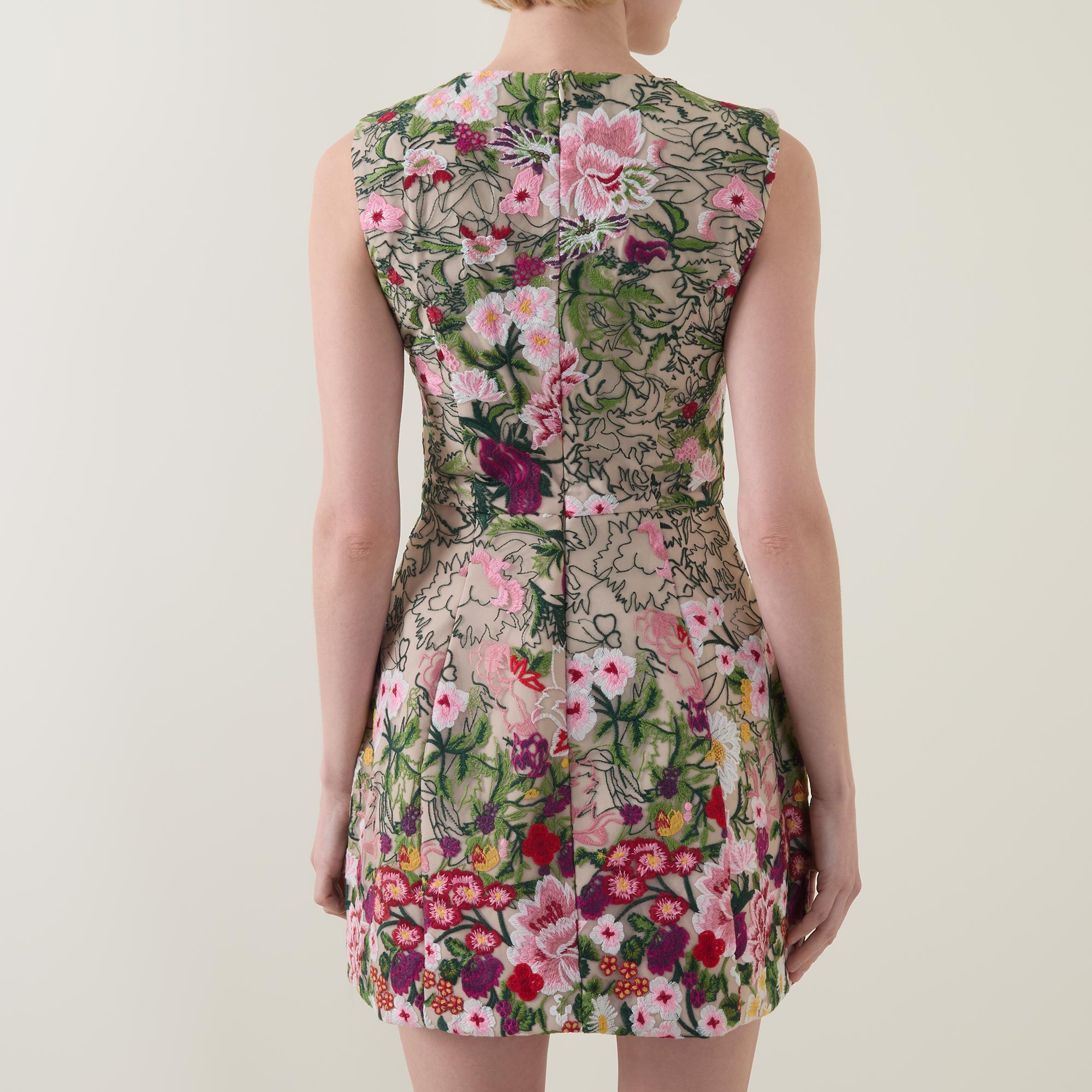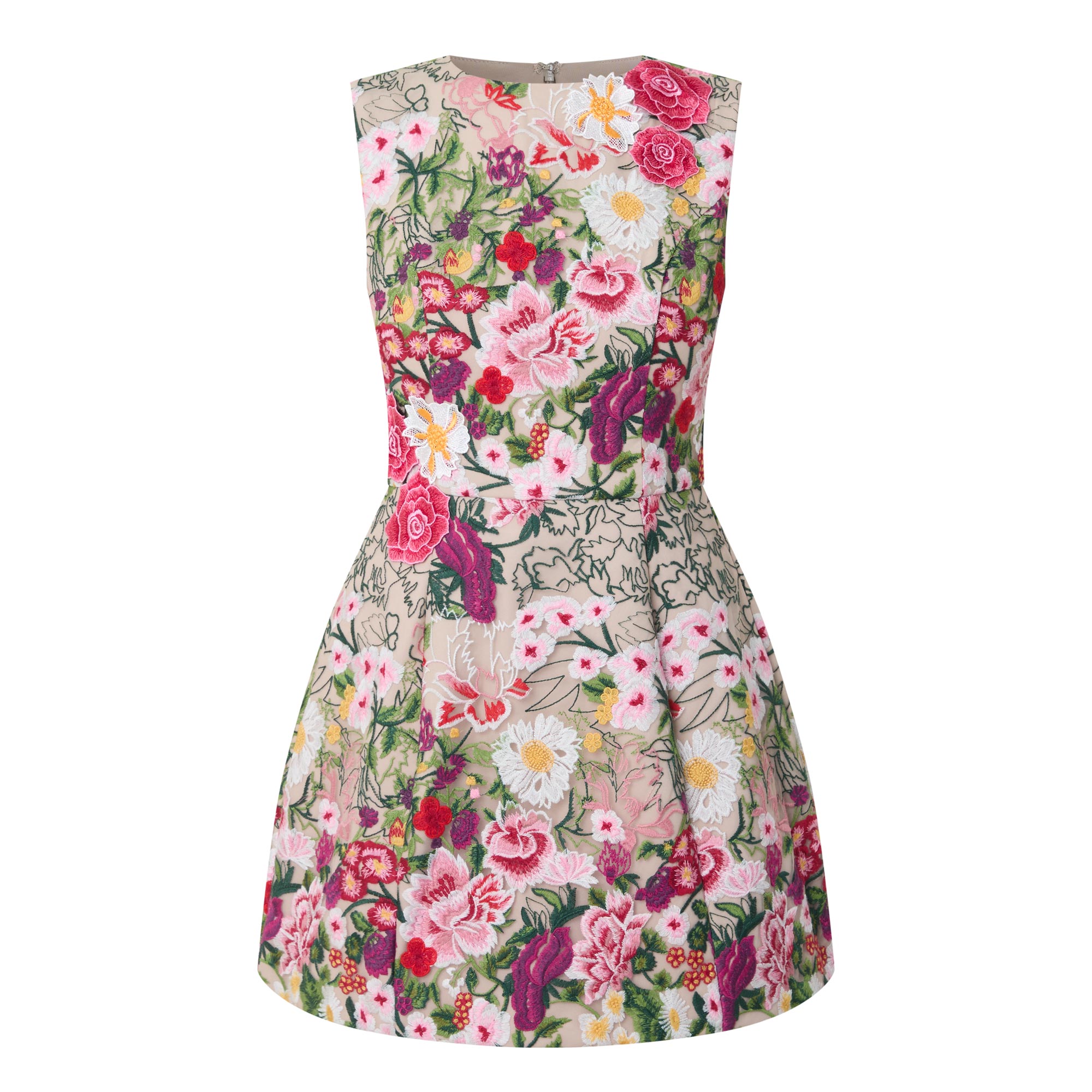 • Round neck, sleeveless design, rear concealed zip fastening, fitted through the waist, darting throughout, structured skirt, pleat detailing, straight hem, floral embroidered design, mini length