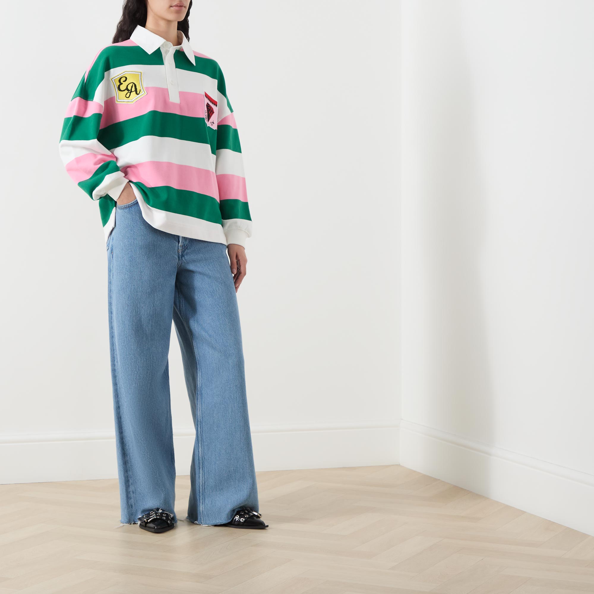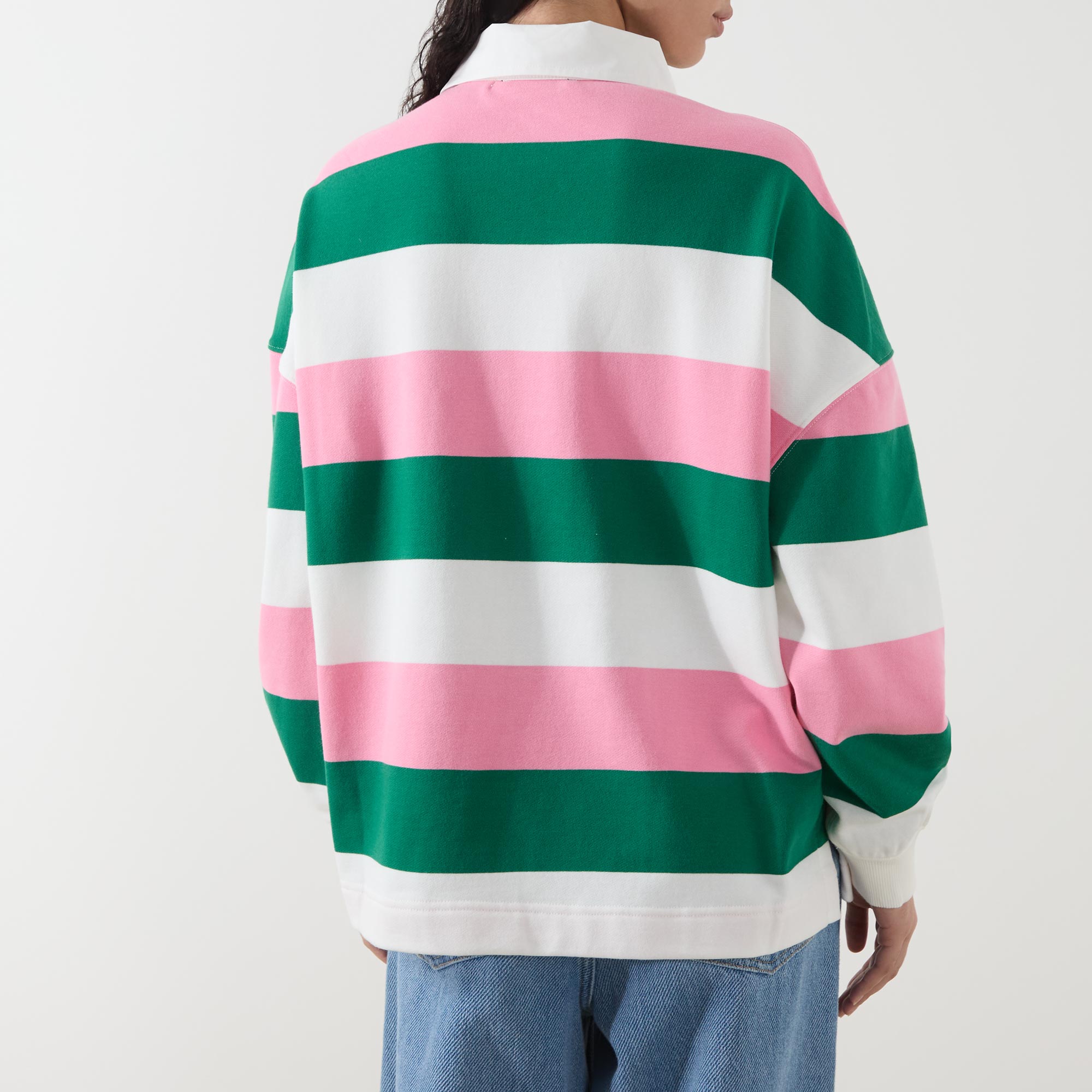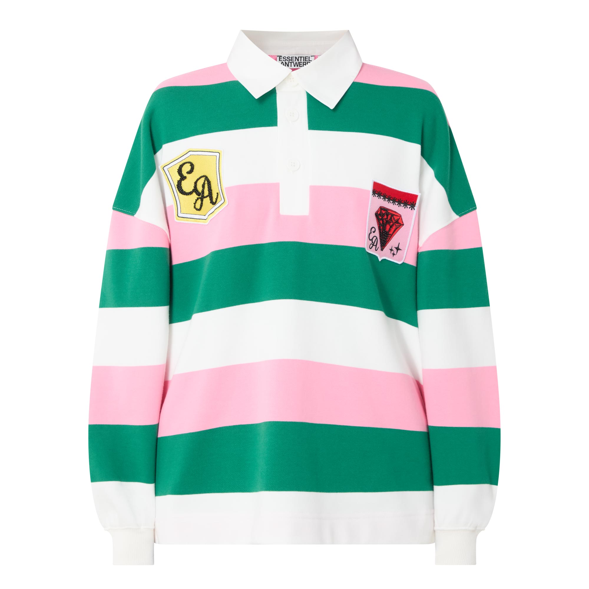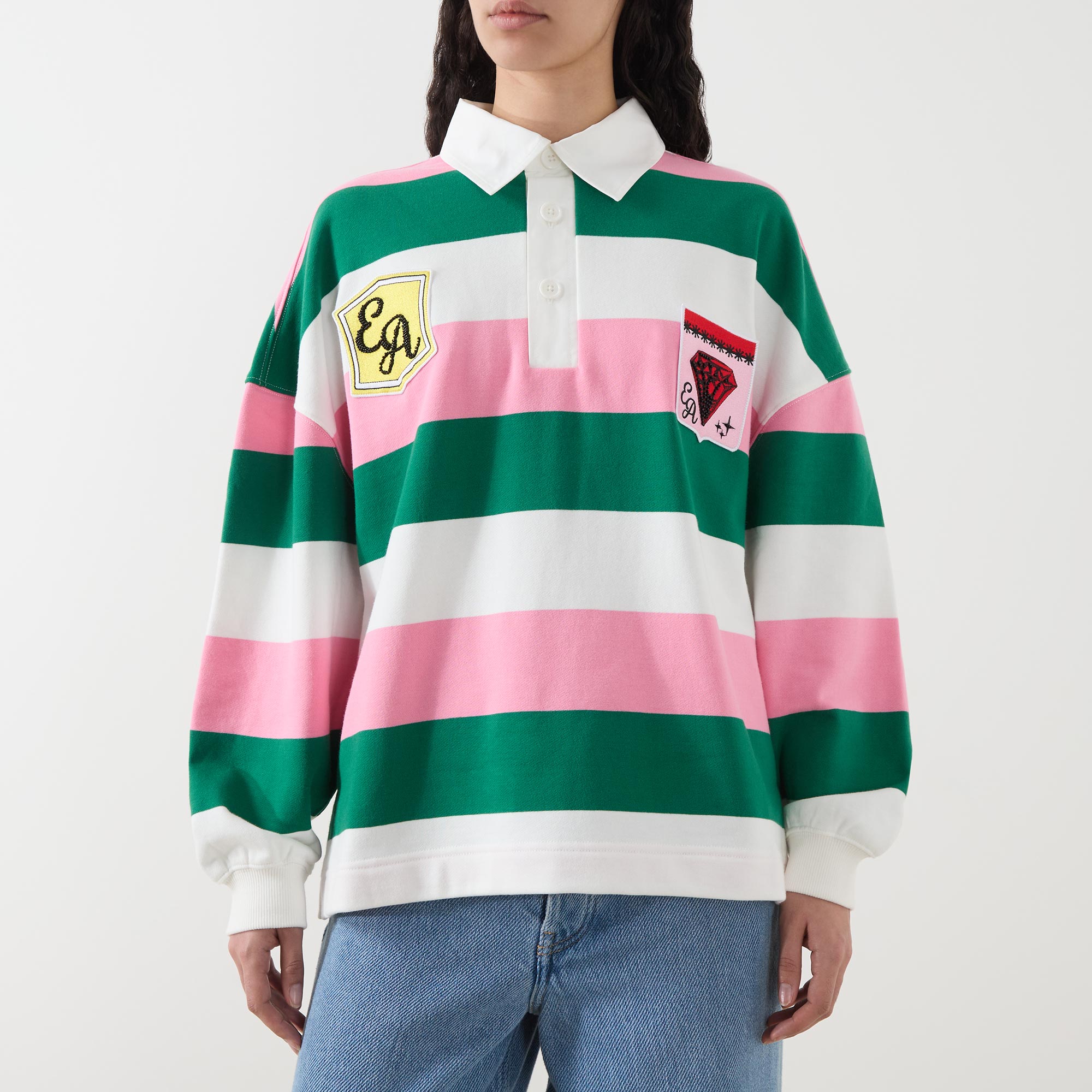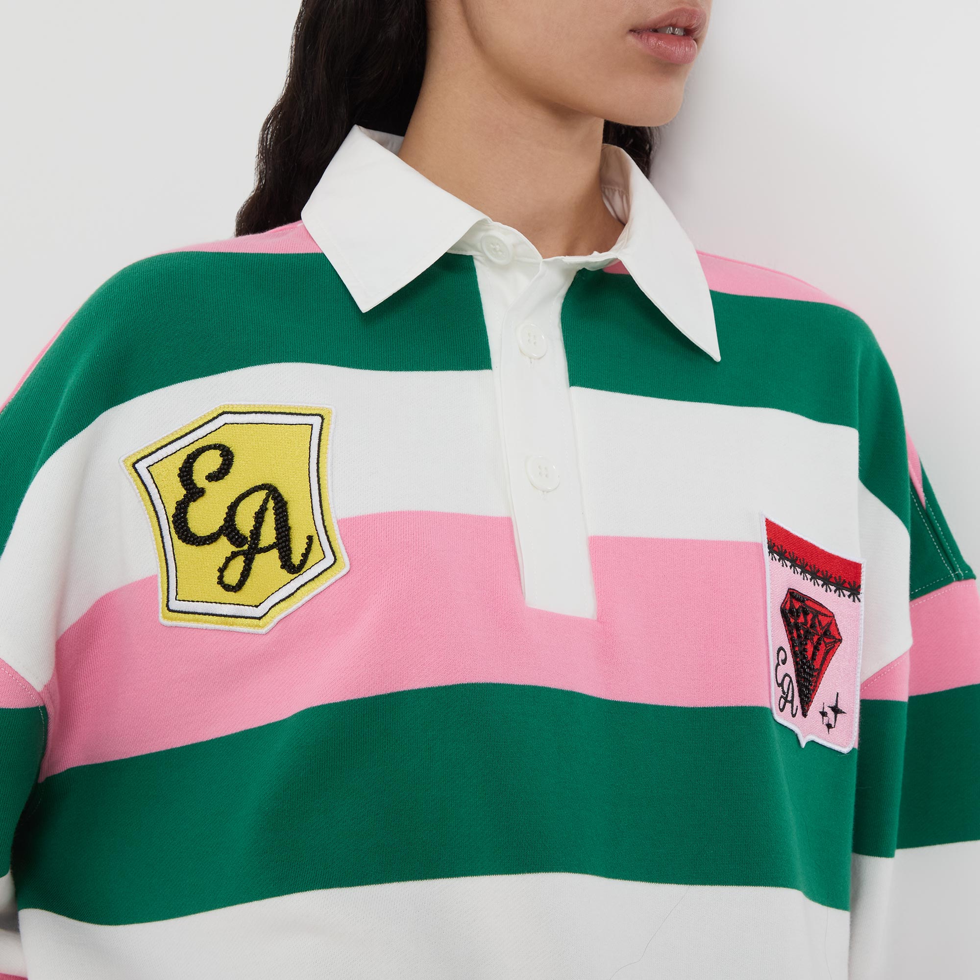• Polo collar, long sleeves, dropped shoulders, three-button placket, striped pattern, contrasting colours, varsity-style logo patches, stretch cuffs, smooth fabric