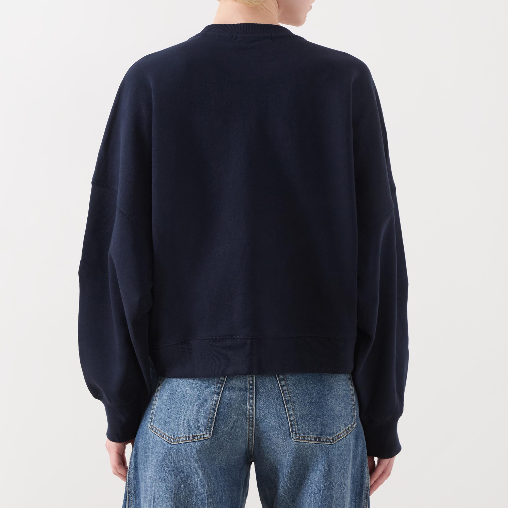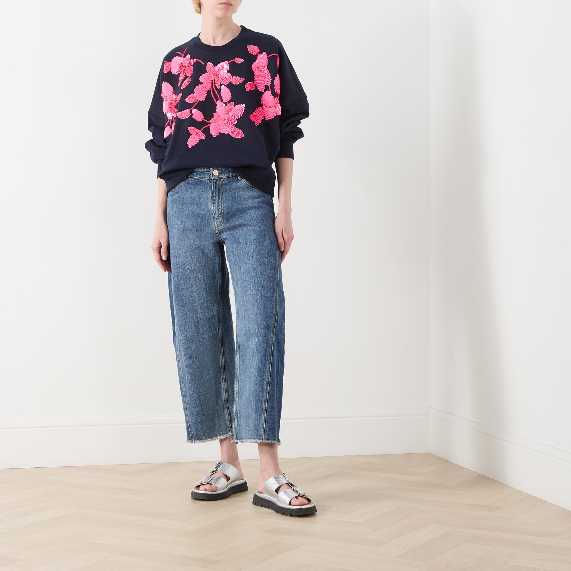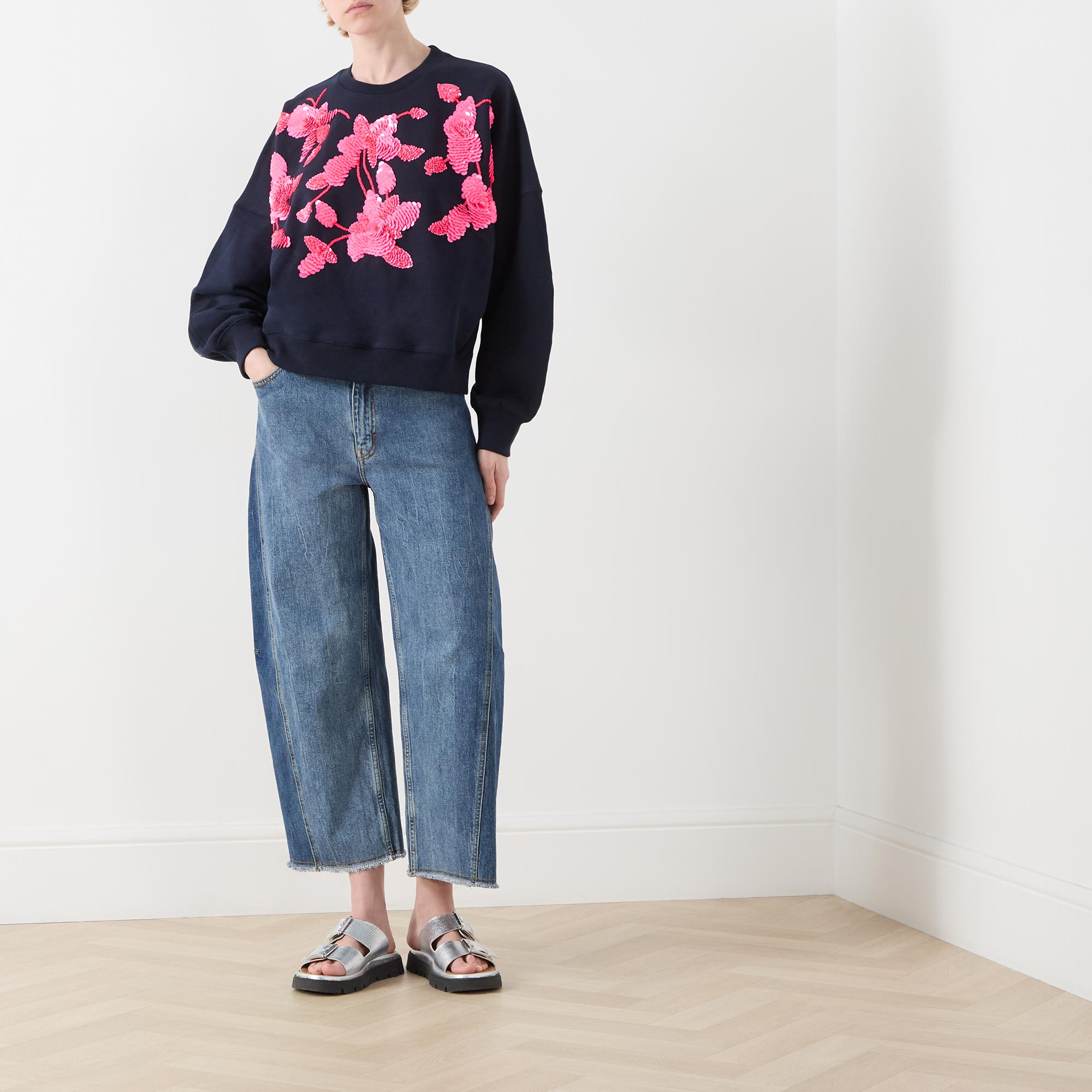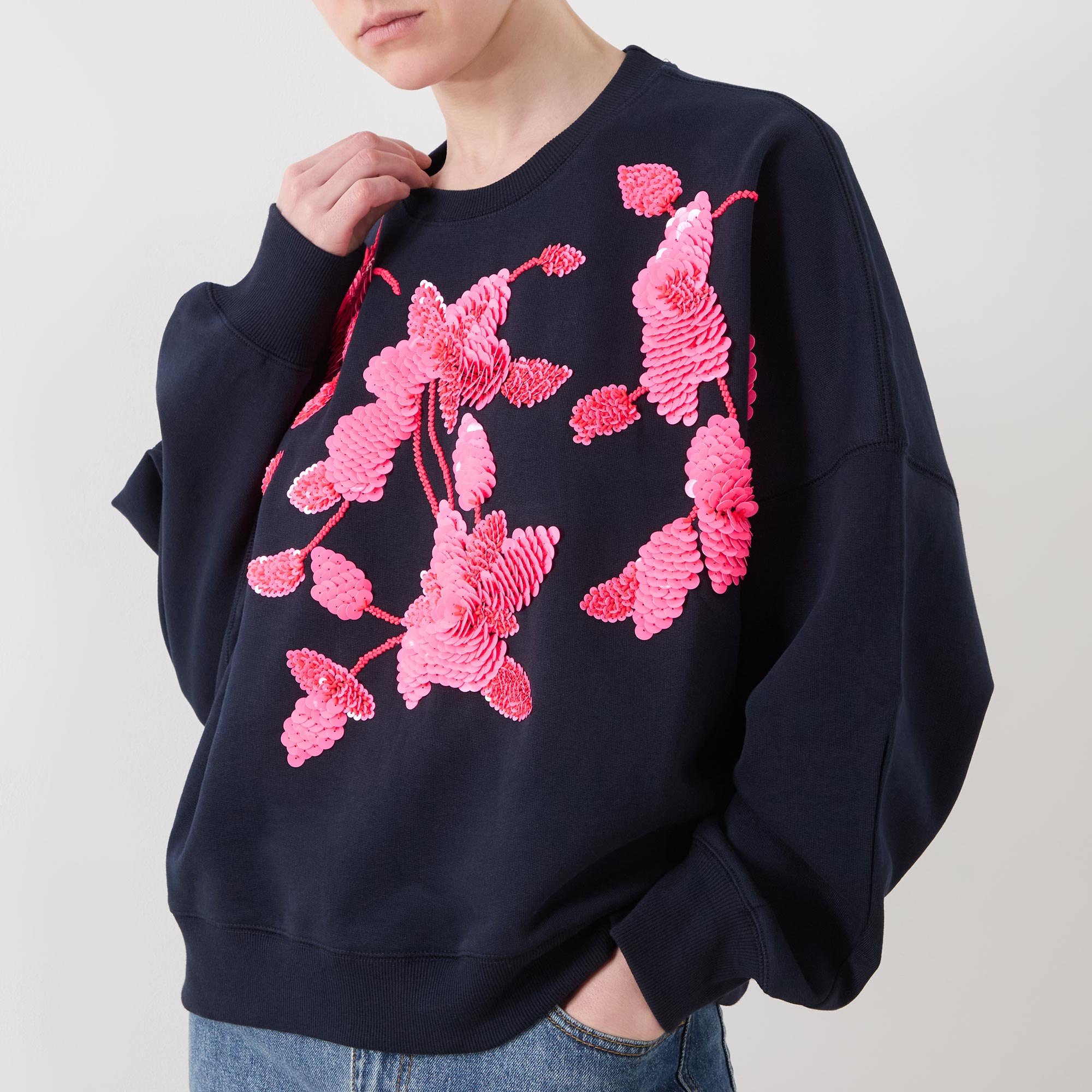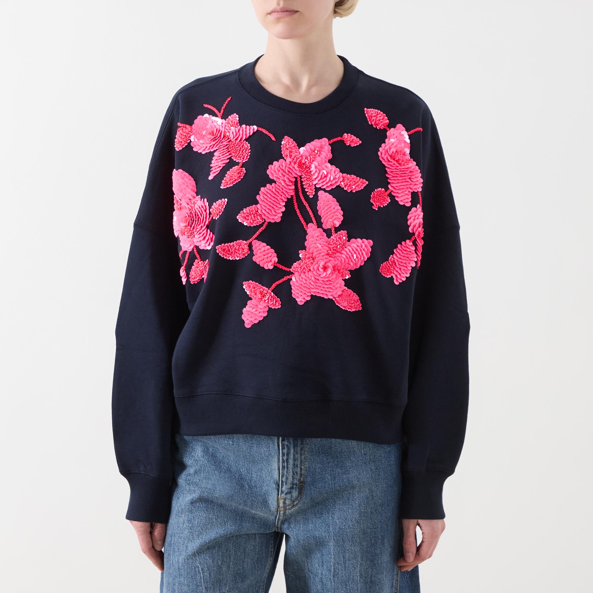 - Long sleeves, round neck, relaxed fit, dropped shoulders, double stitching, flower-shaped sequin embellishment, ribbed trims