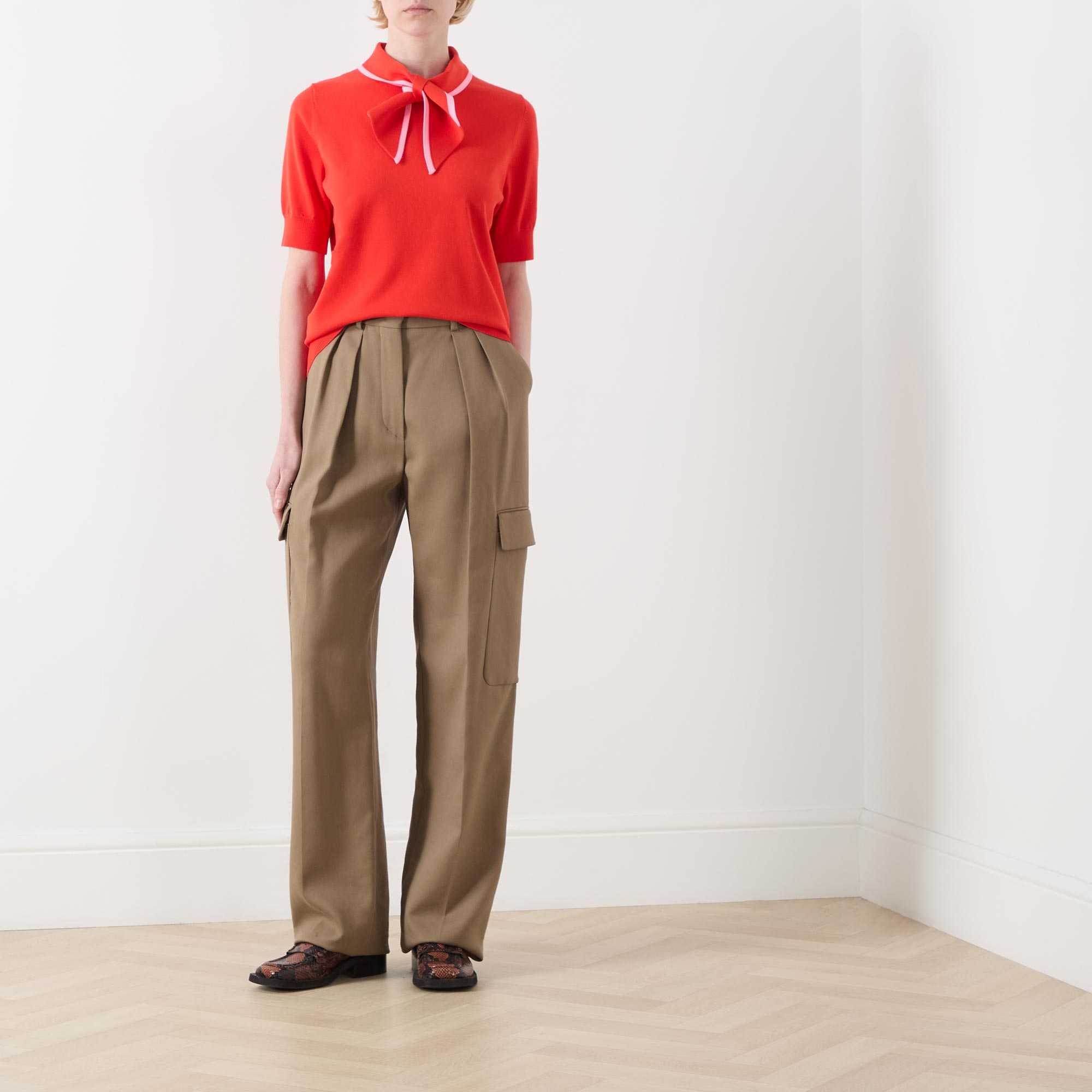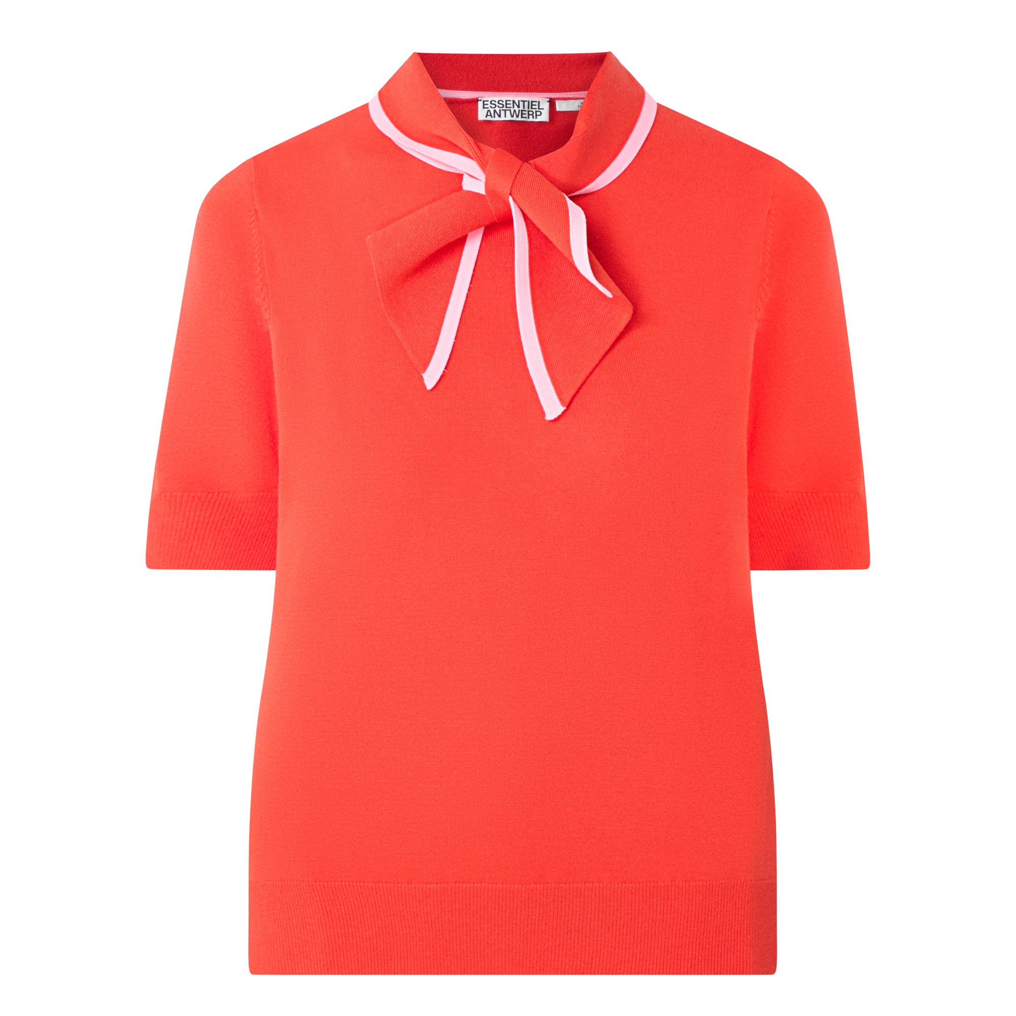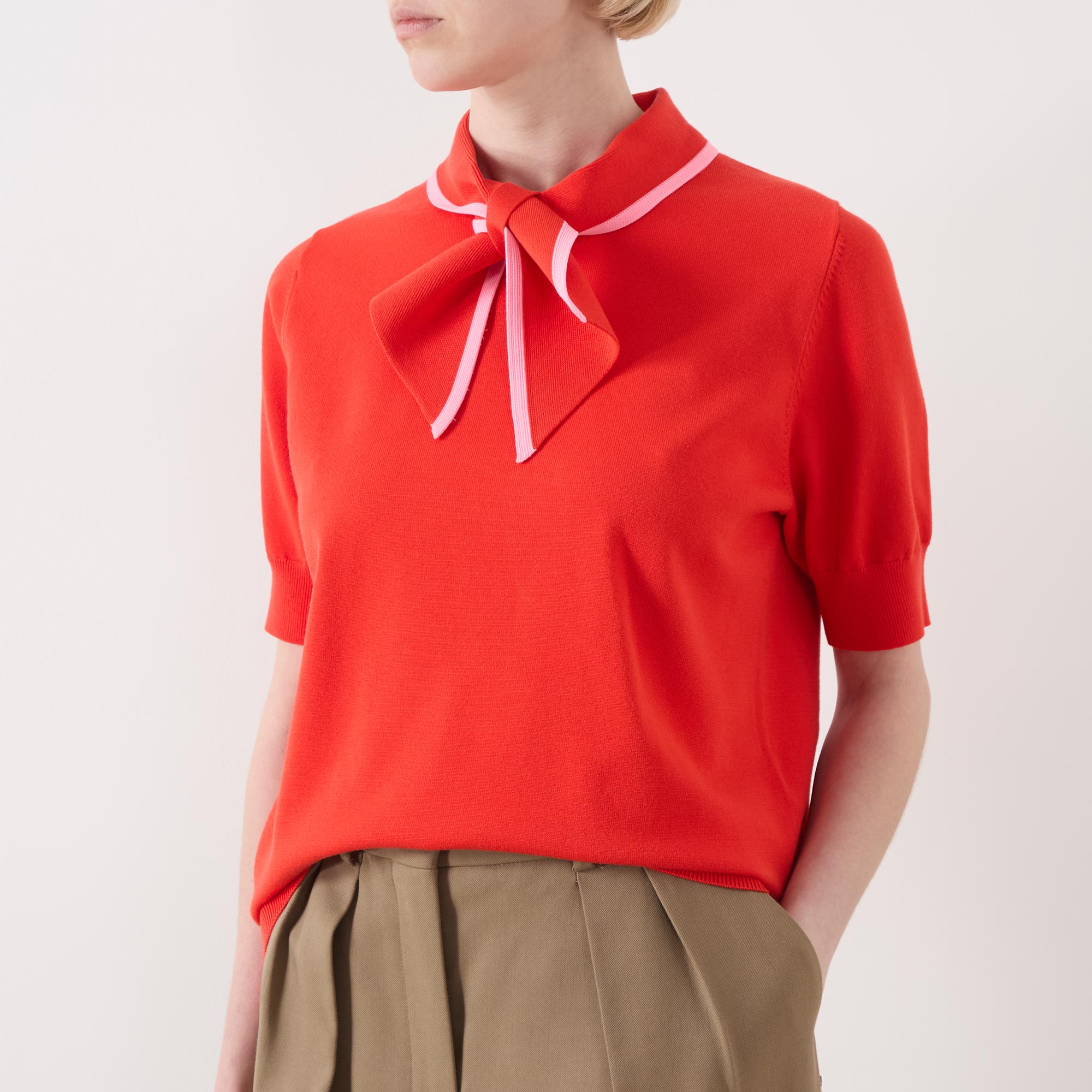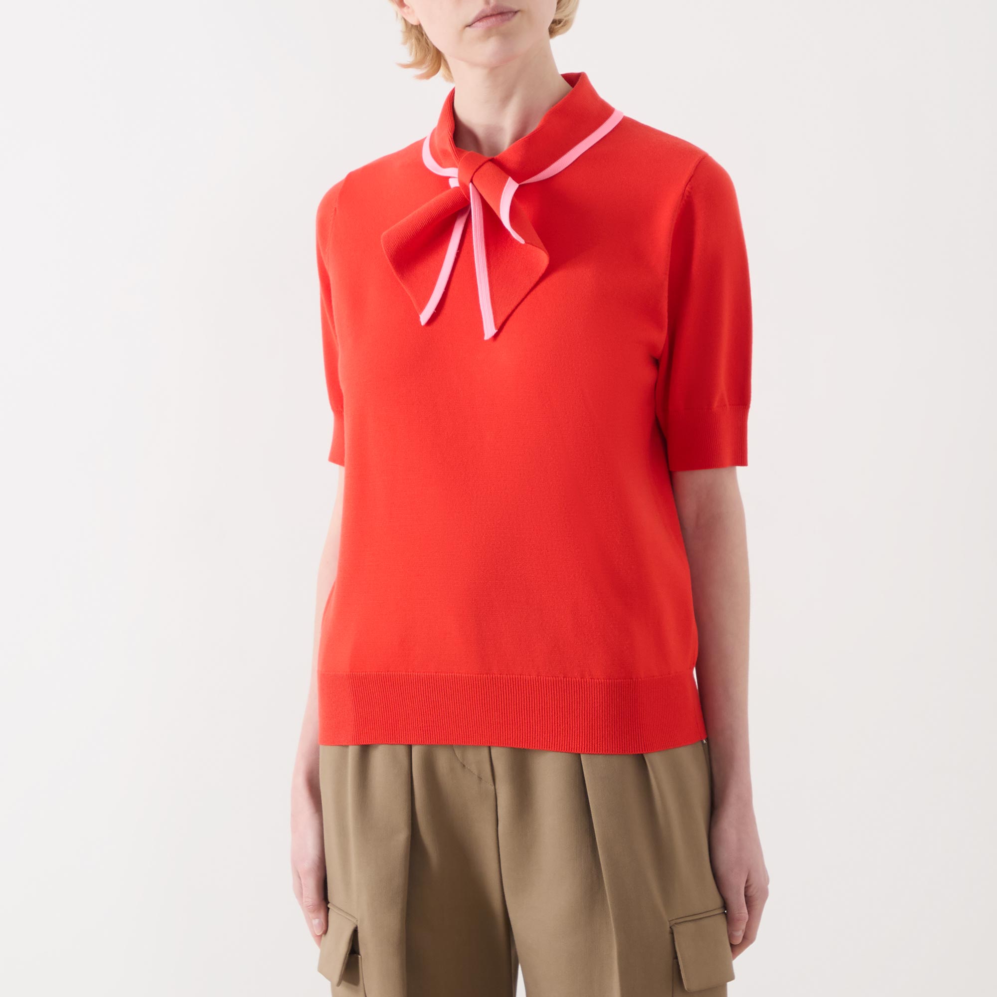 - Short sleeves, scarf neck collar, fine knit, relaxed fit