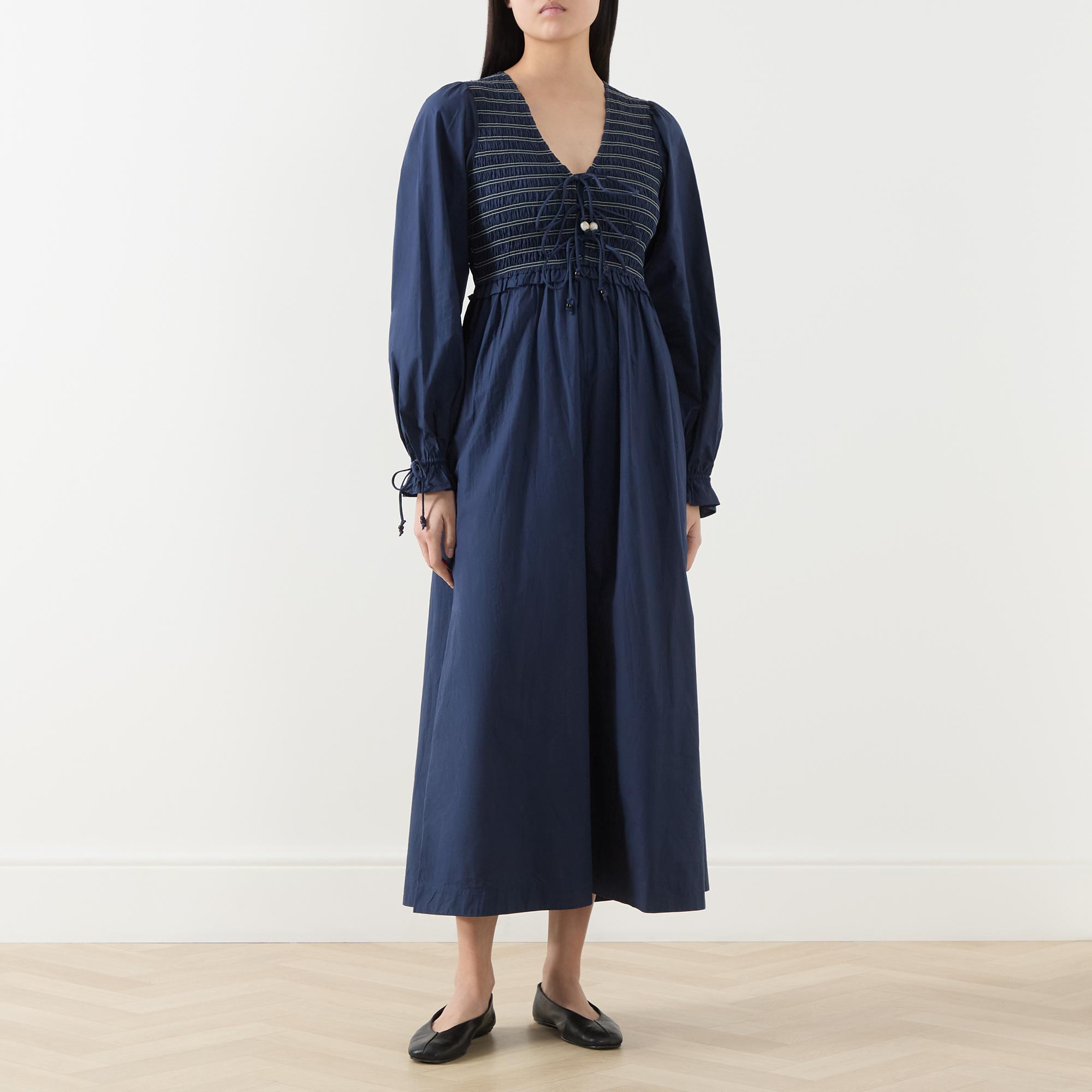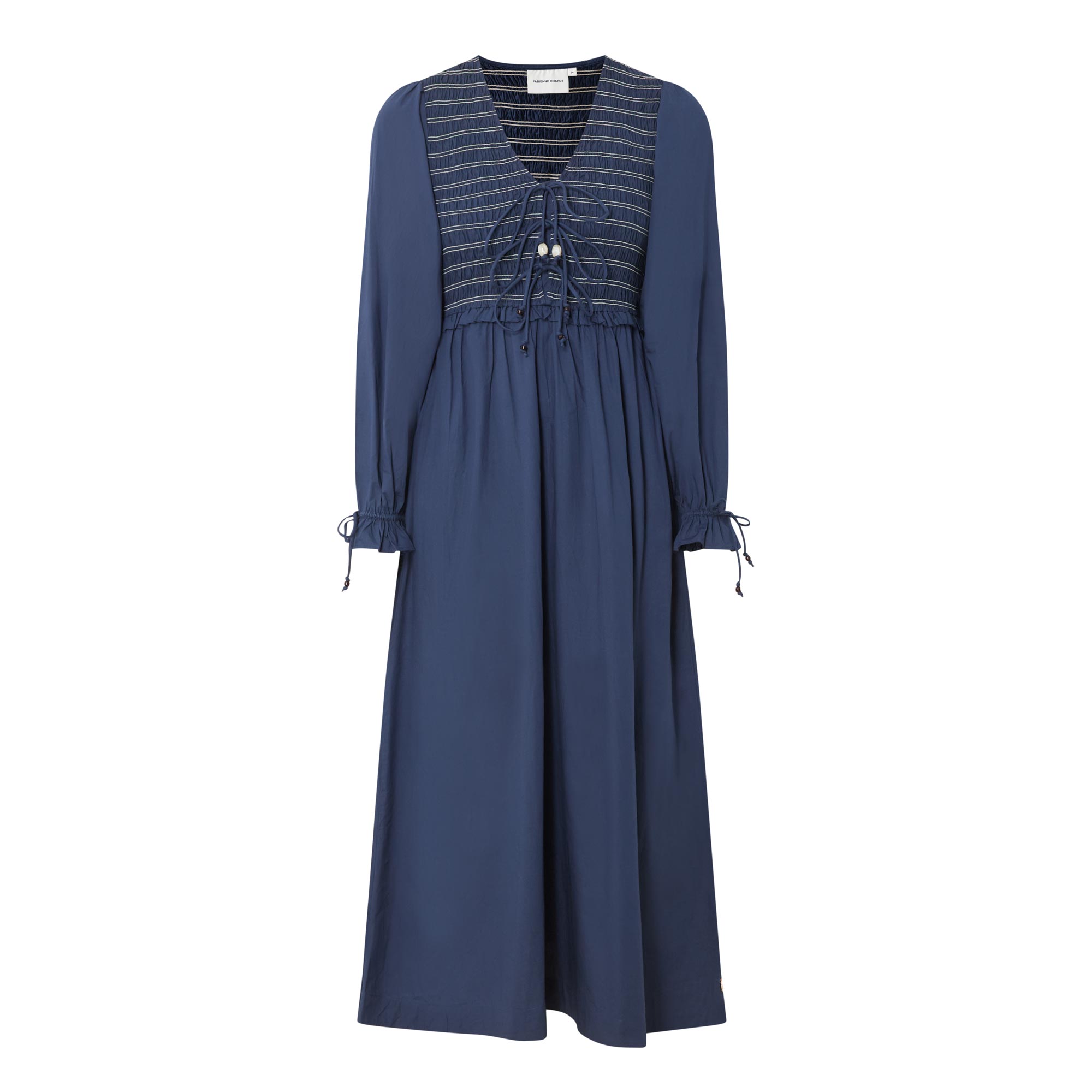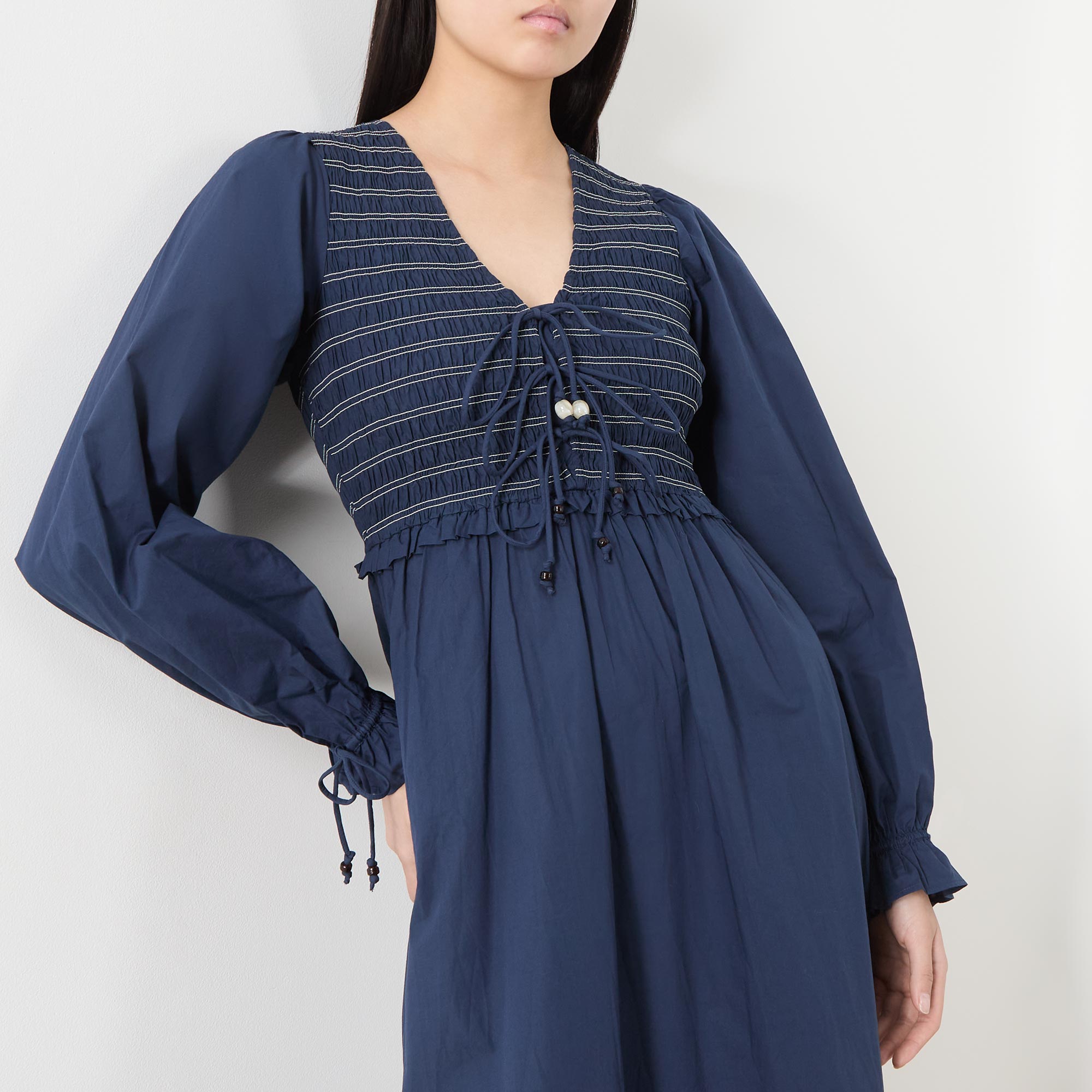 • V-neckline with tie details, shirred bodice, long sleeves with tie adjustable cuffs, midi length, frill and stripe details, flared hemline