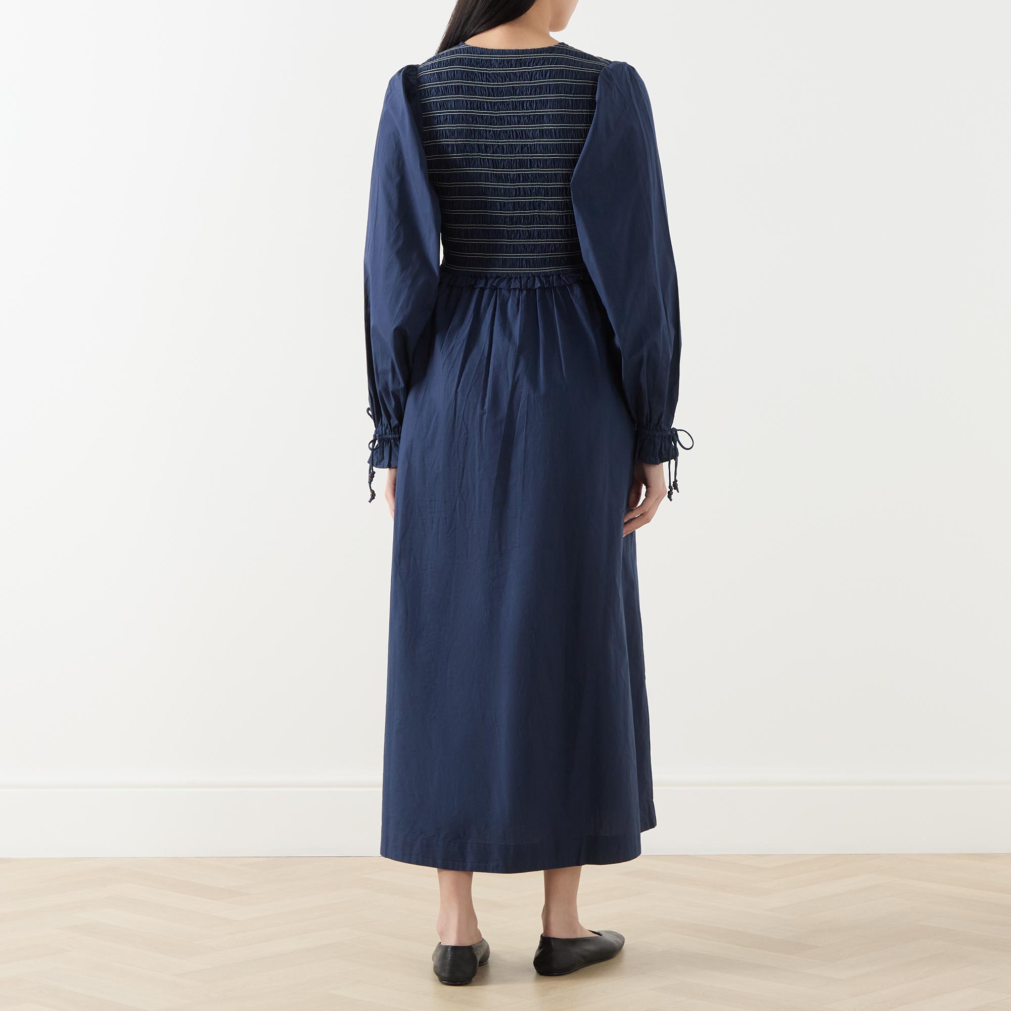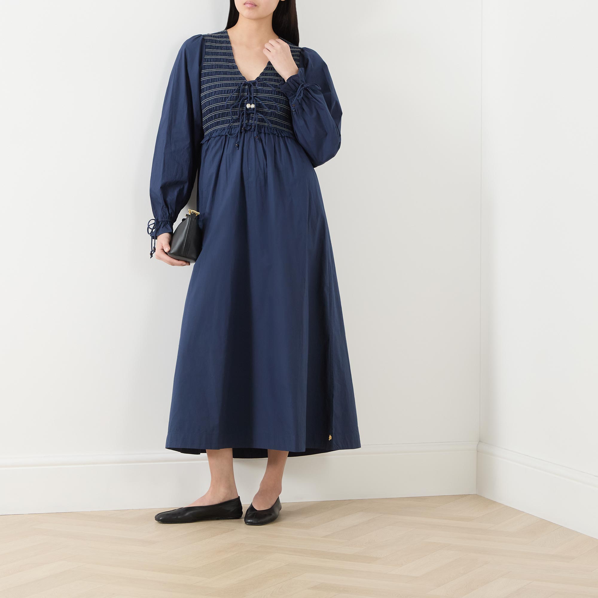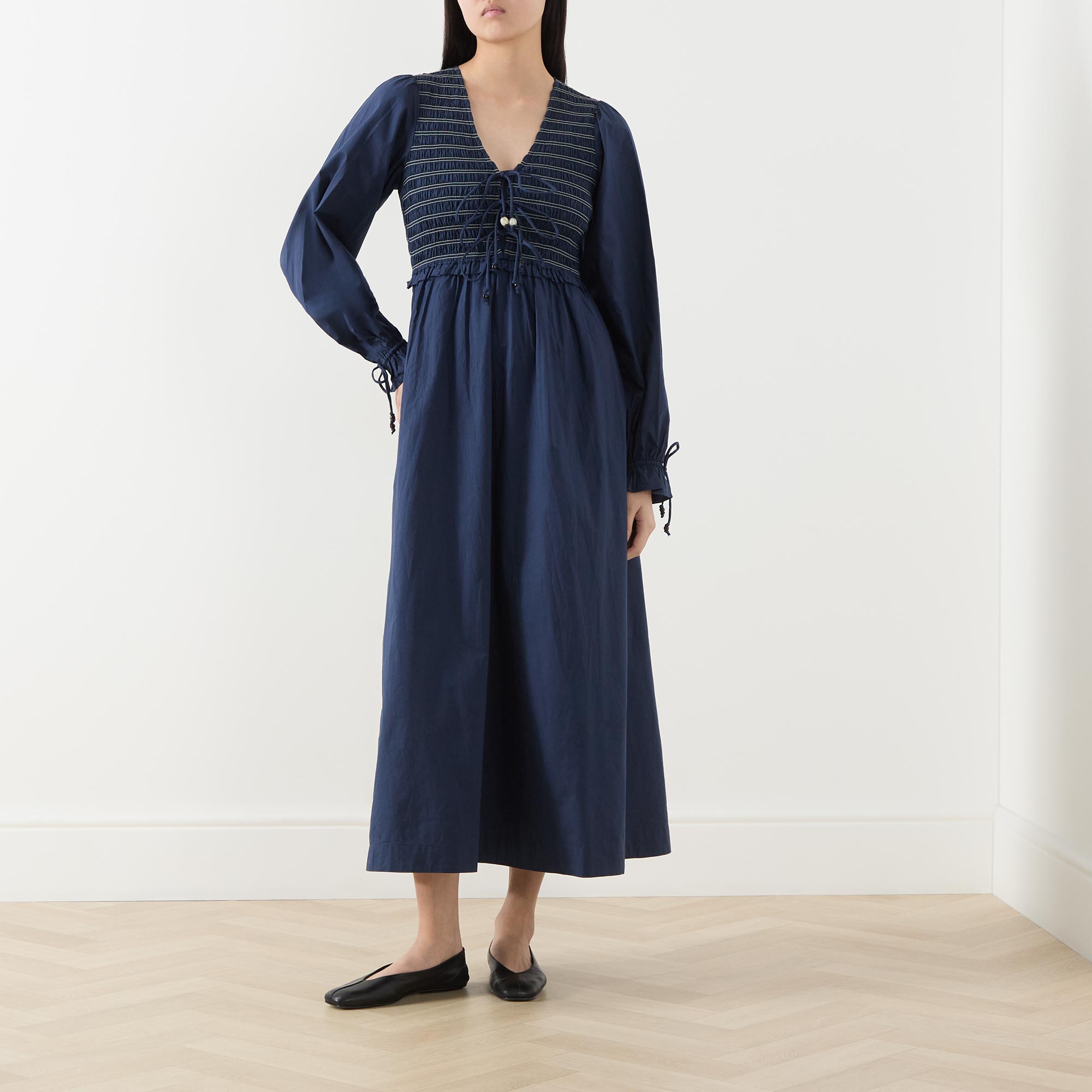 • V-neckline with tie details, shirred bodice, long sleeves with tie adjustable cuffs, midi length, frill and stripe details, flared hemline