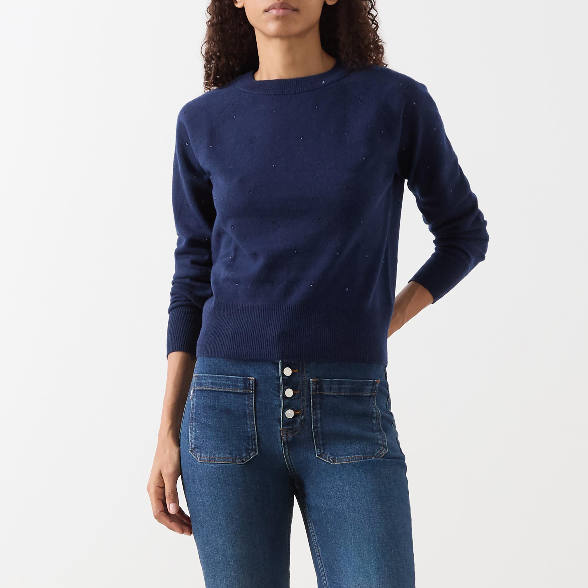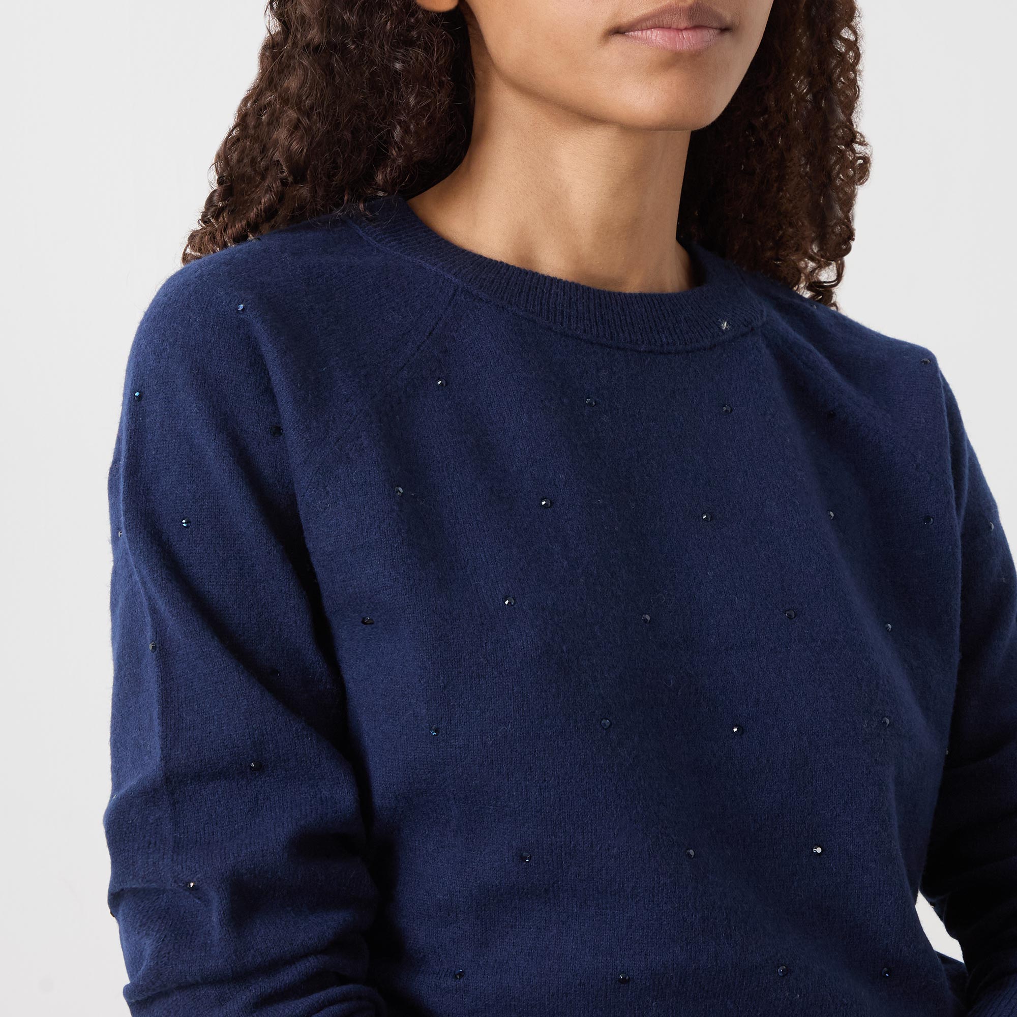 • Rhinestone detail, long sleeves, crew neckline, straight hemline