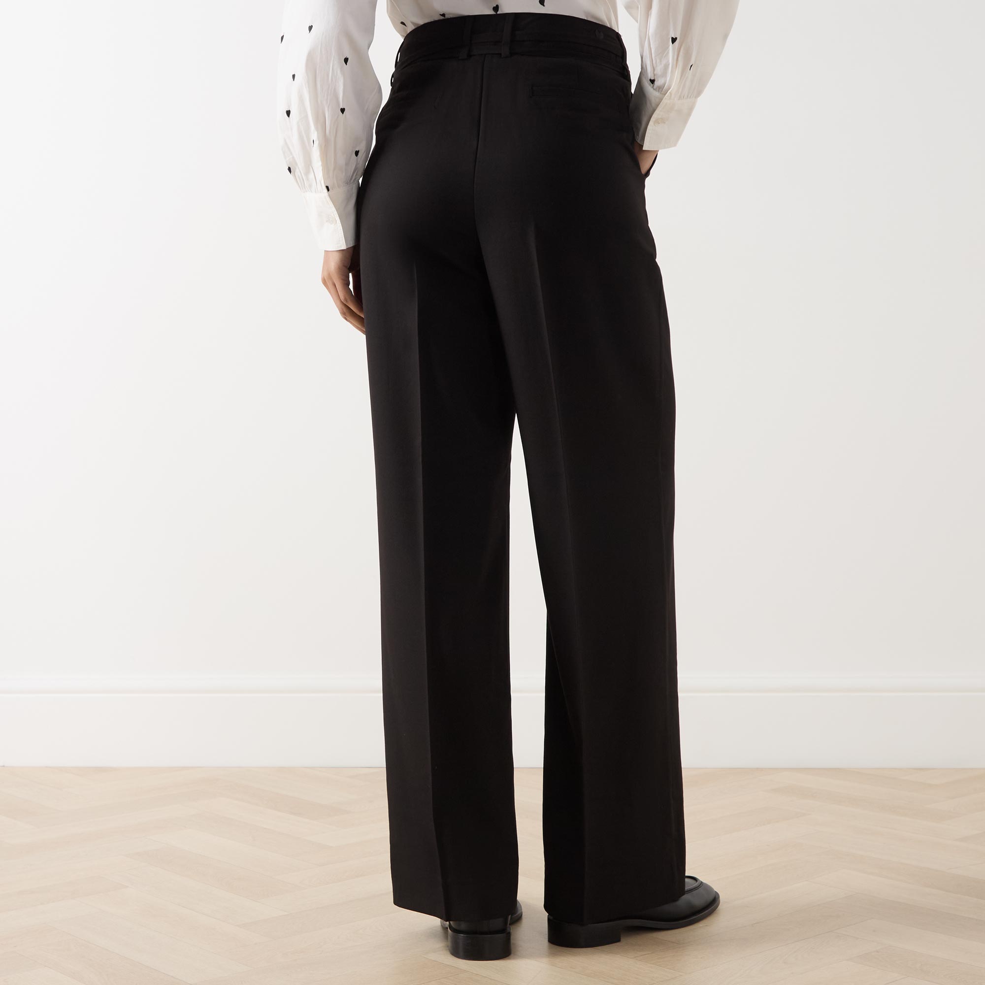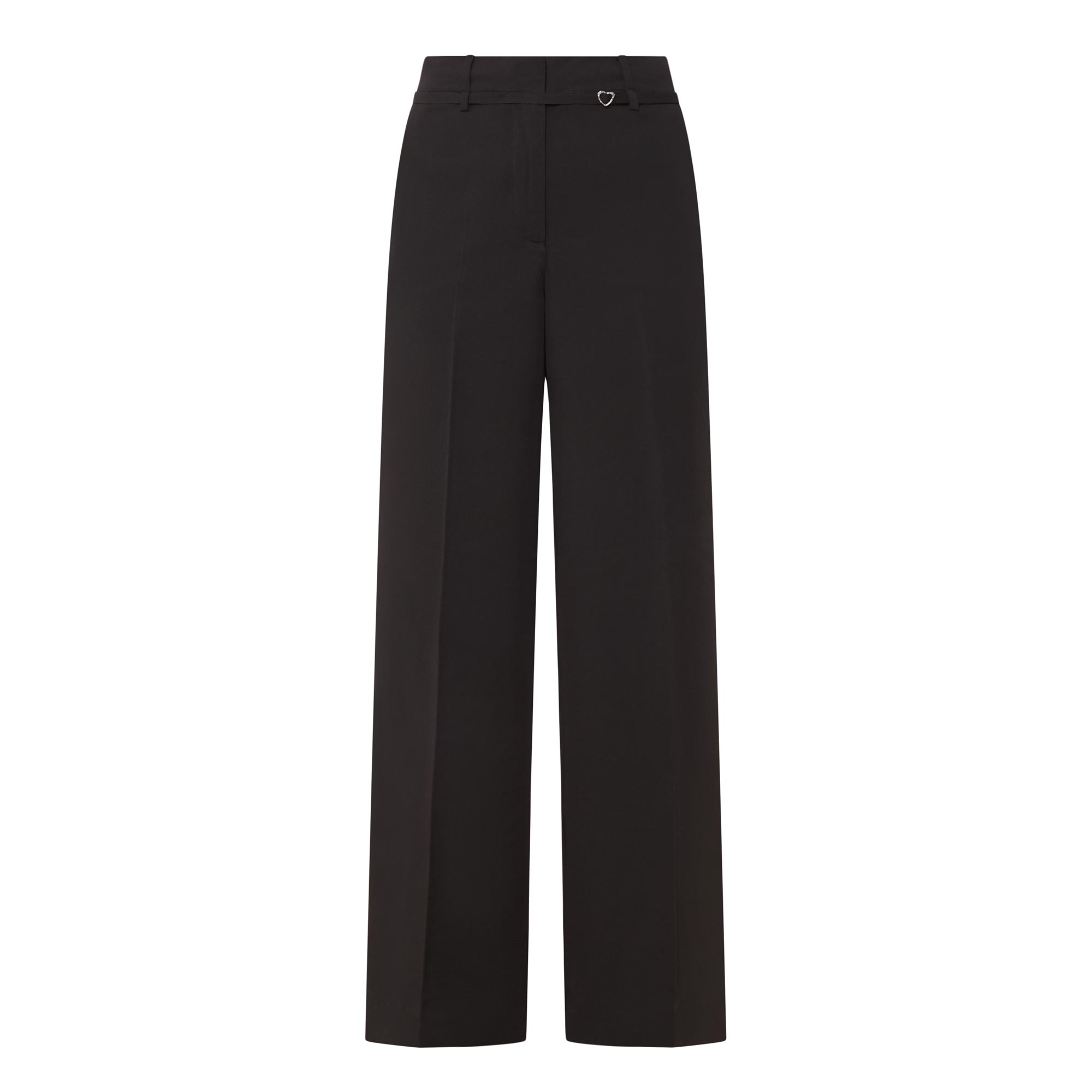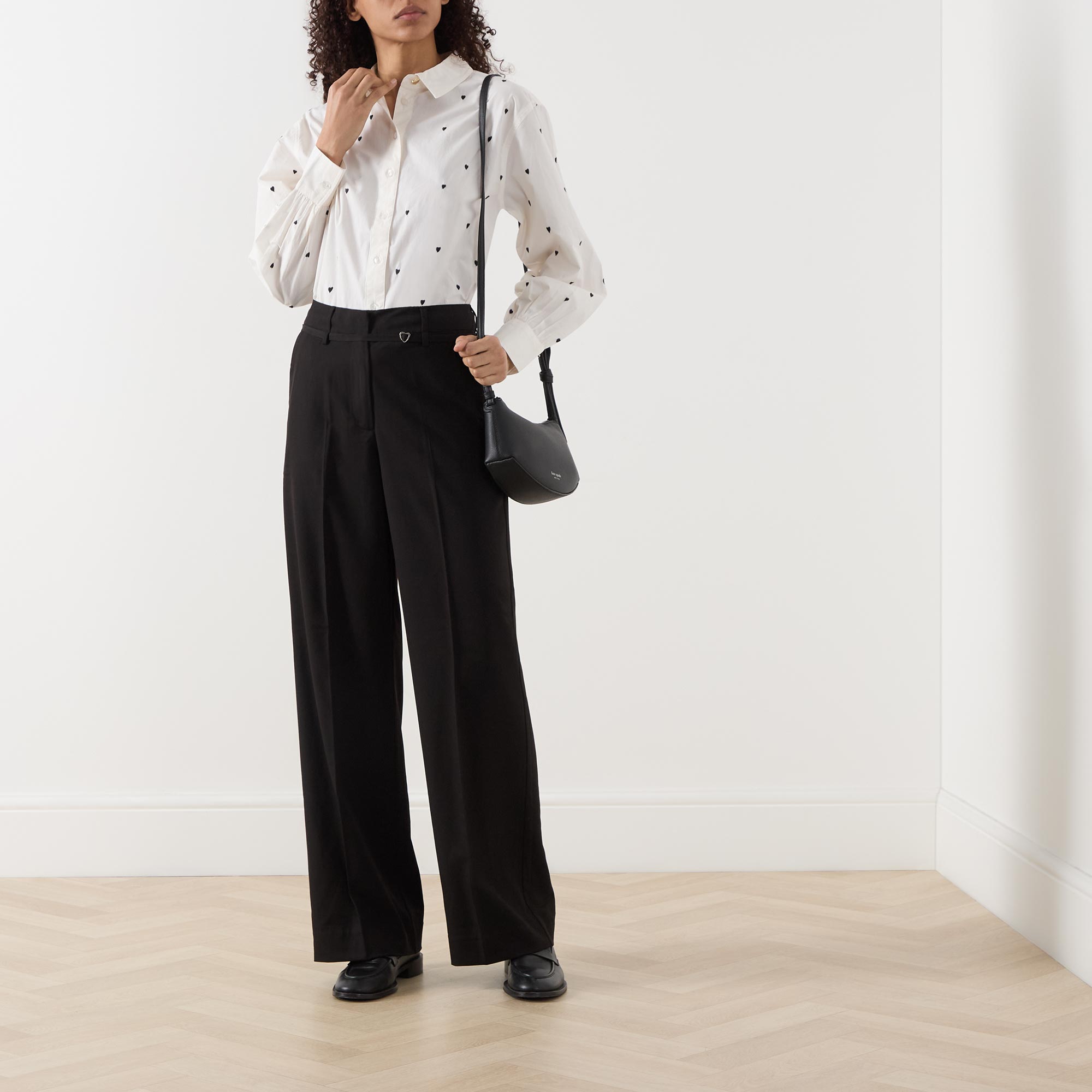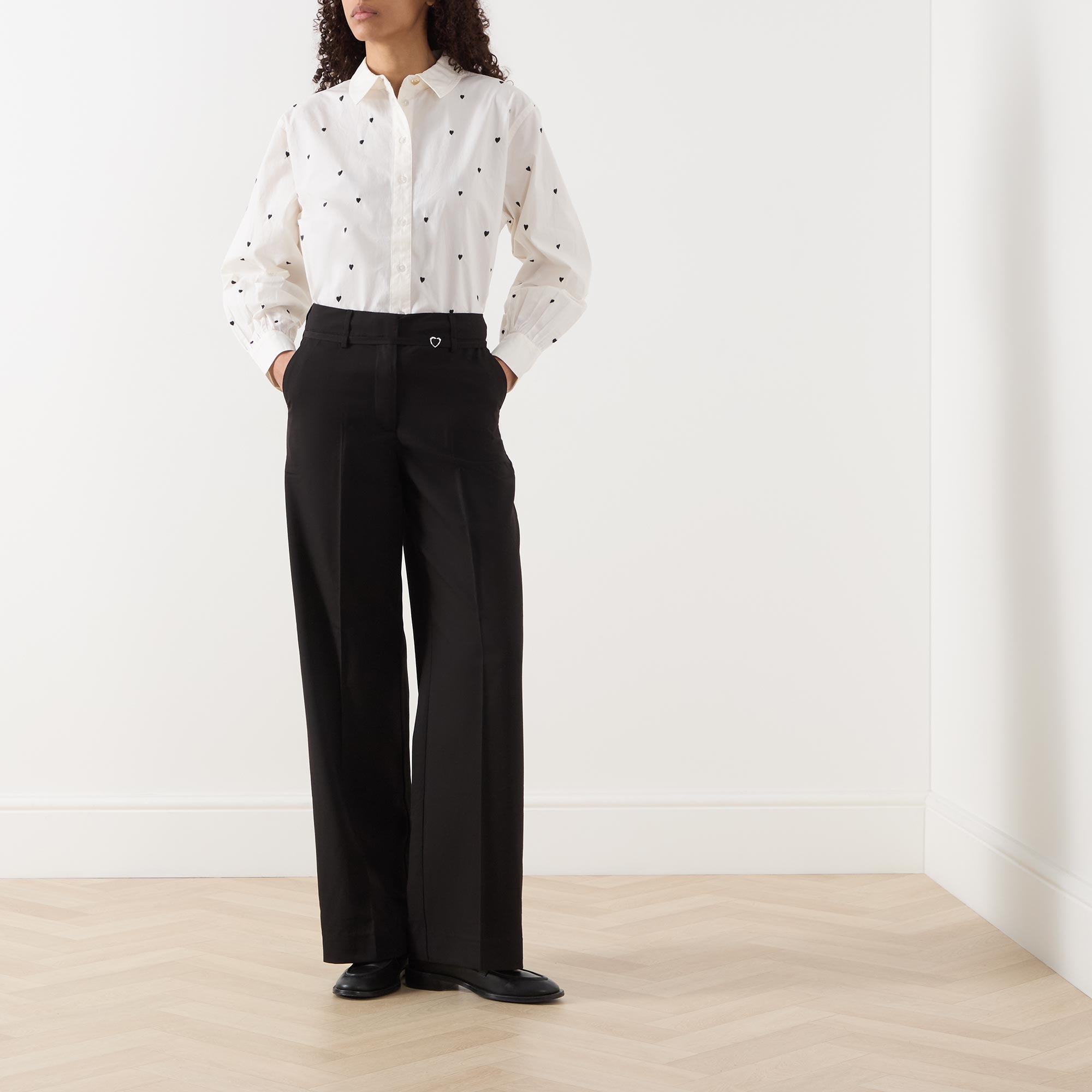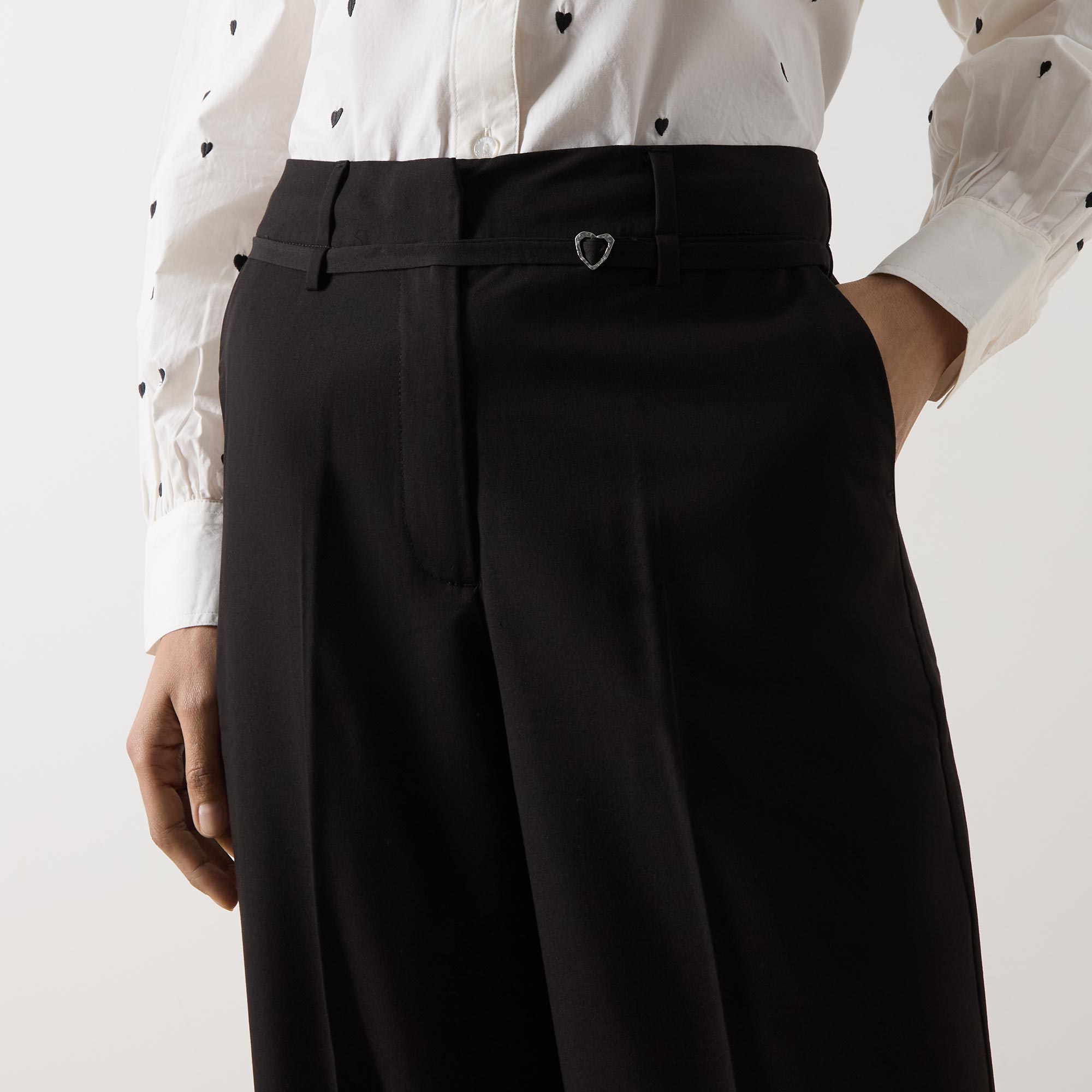 • High rise, straight leg, concealed fly with hook and bar fastening, narrow tonal belt with small heart-shaped hardware, two side entry pockets, two rear welt pockets, clean hems, pressed creases, smooth finish