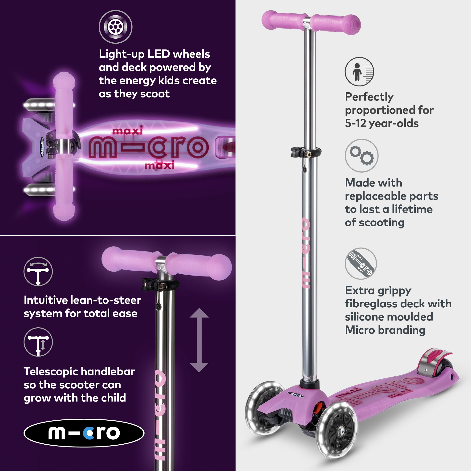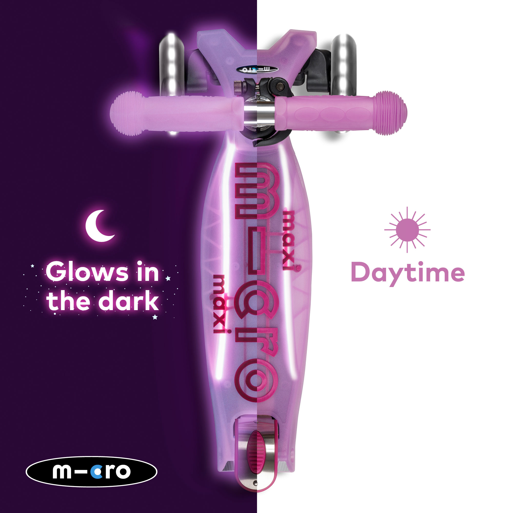 - Glow-in-the-dark deck, grips and brake, LED wheels, glow-in the dark micro stem logo, powered by sunlight, height adjustable handlebars, anti-slip deck, patented steering system, scooter, allen keys, manual