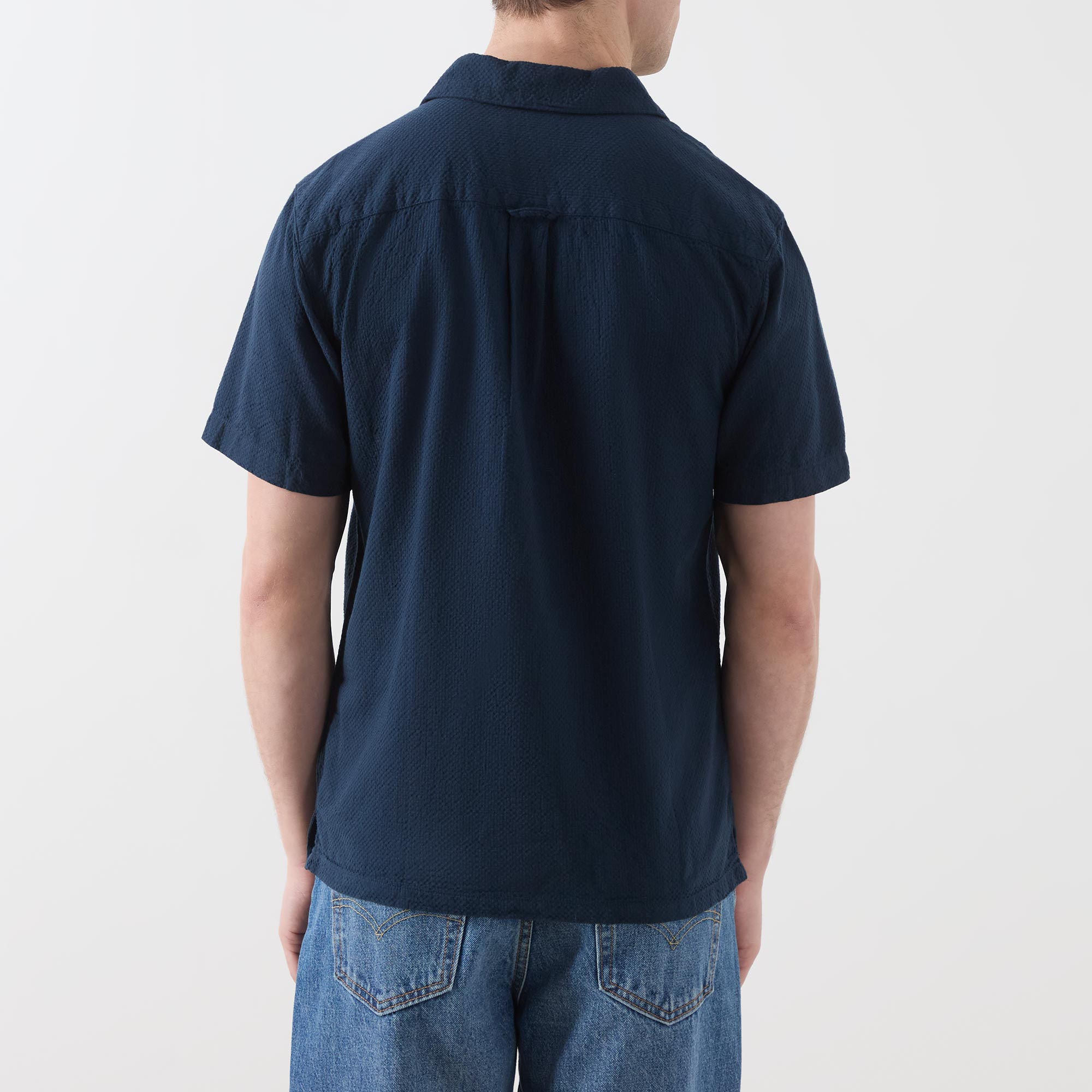 - Pointed collar, short sleeves, logo detail, curved hemline, button fastenings