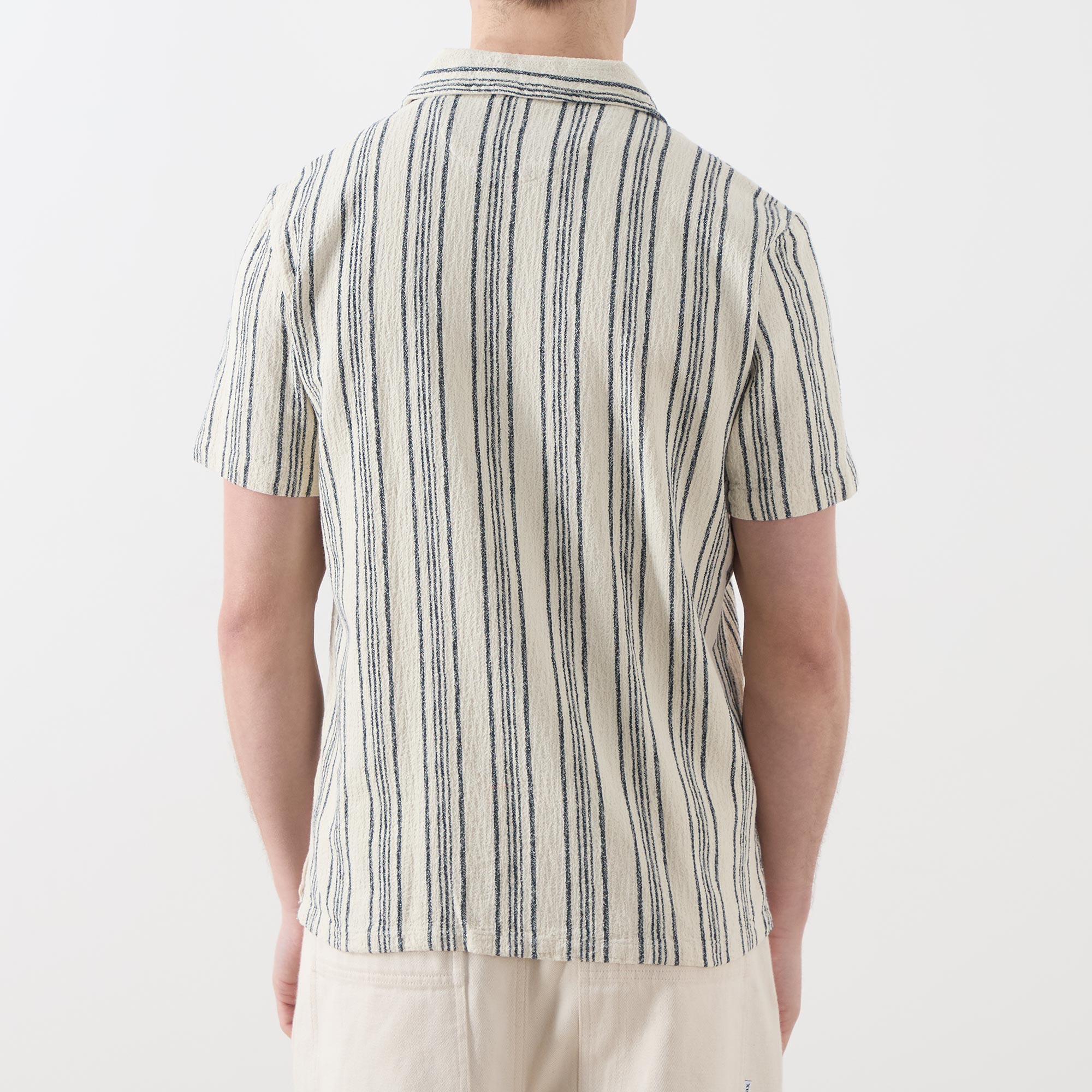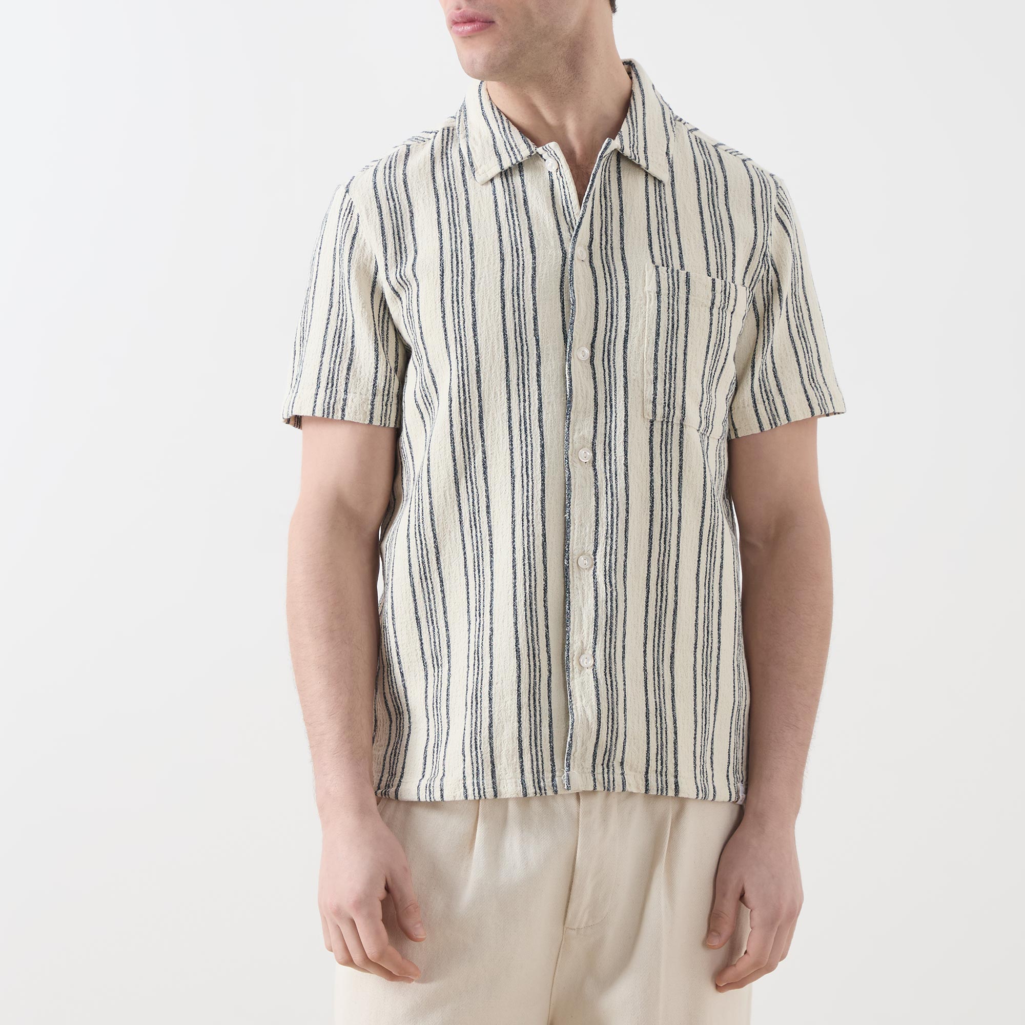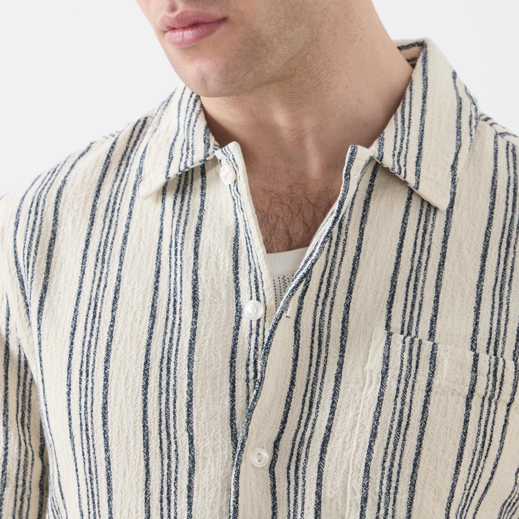 - Pointed collar, striped, button fastenings, chest pocket, straight hemline