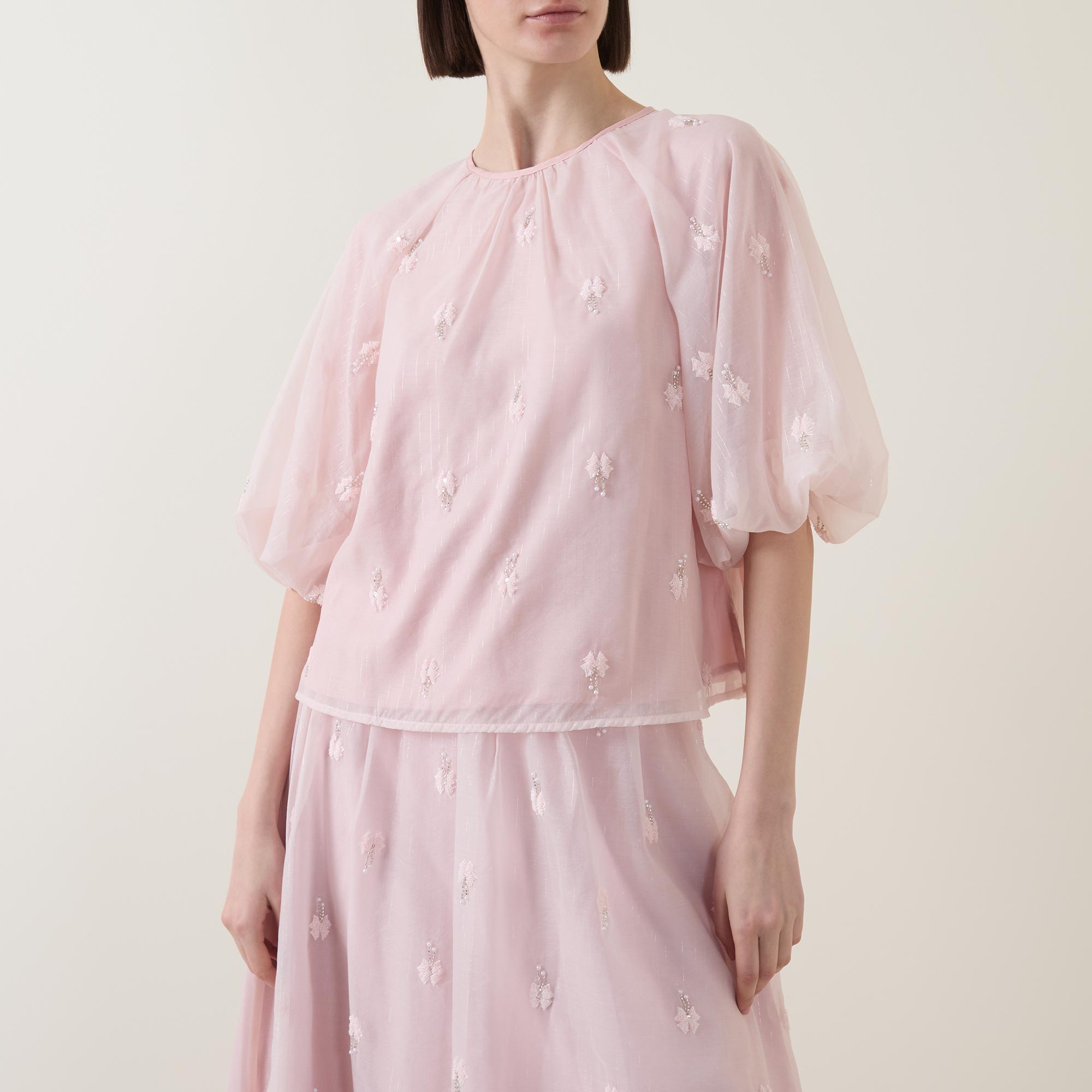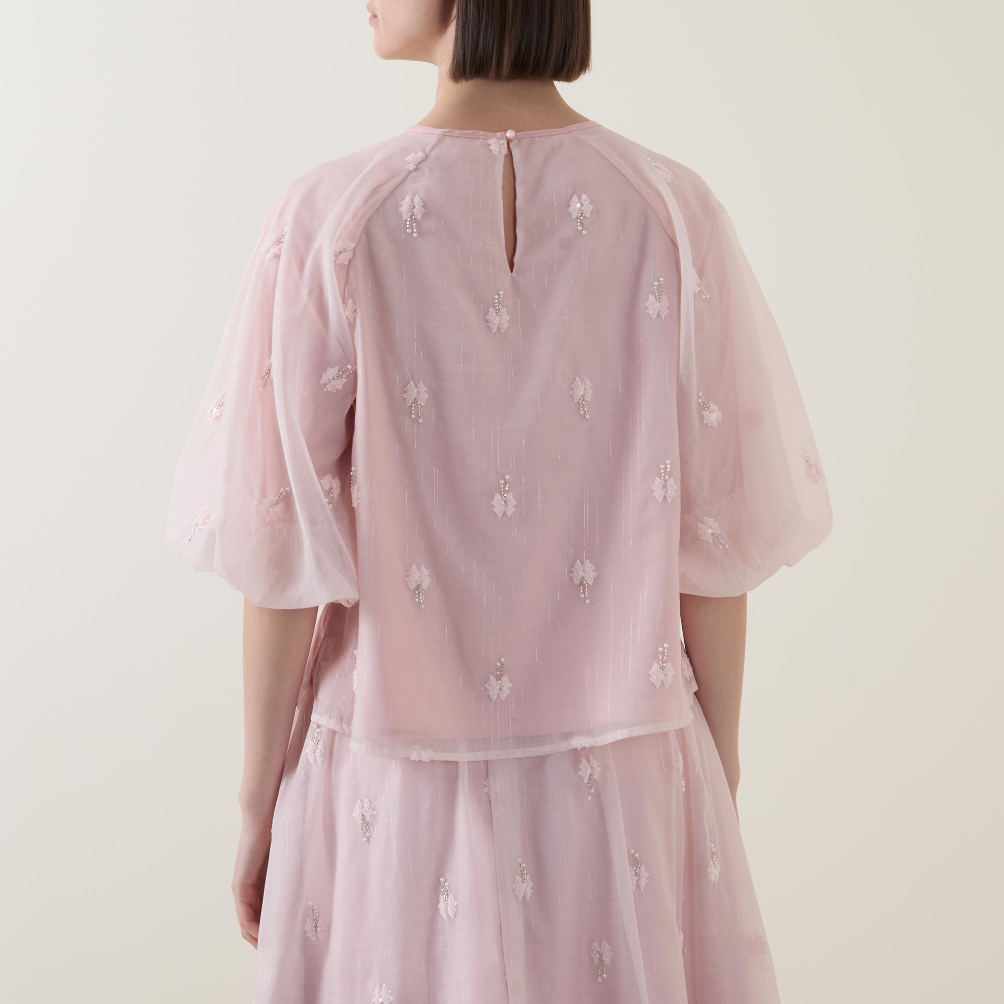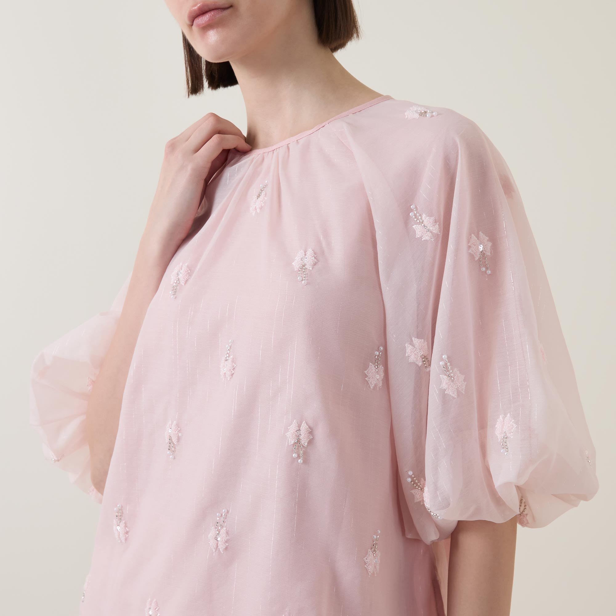 - Round pleated neckline, rear keyhole and button fastening, half length sleeves, elasticated cuffs, slightly flared hem, embellished detailing throughout, semi-sheer overlay, lined