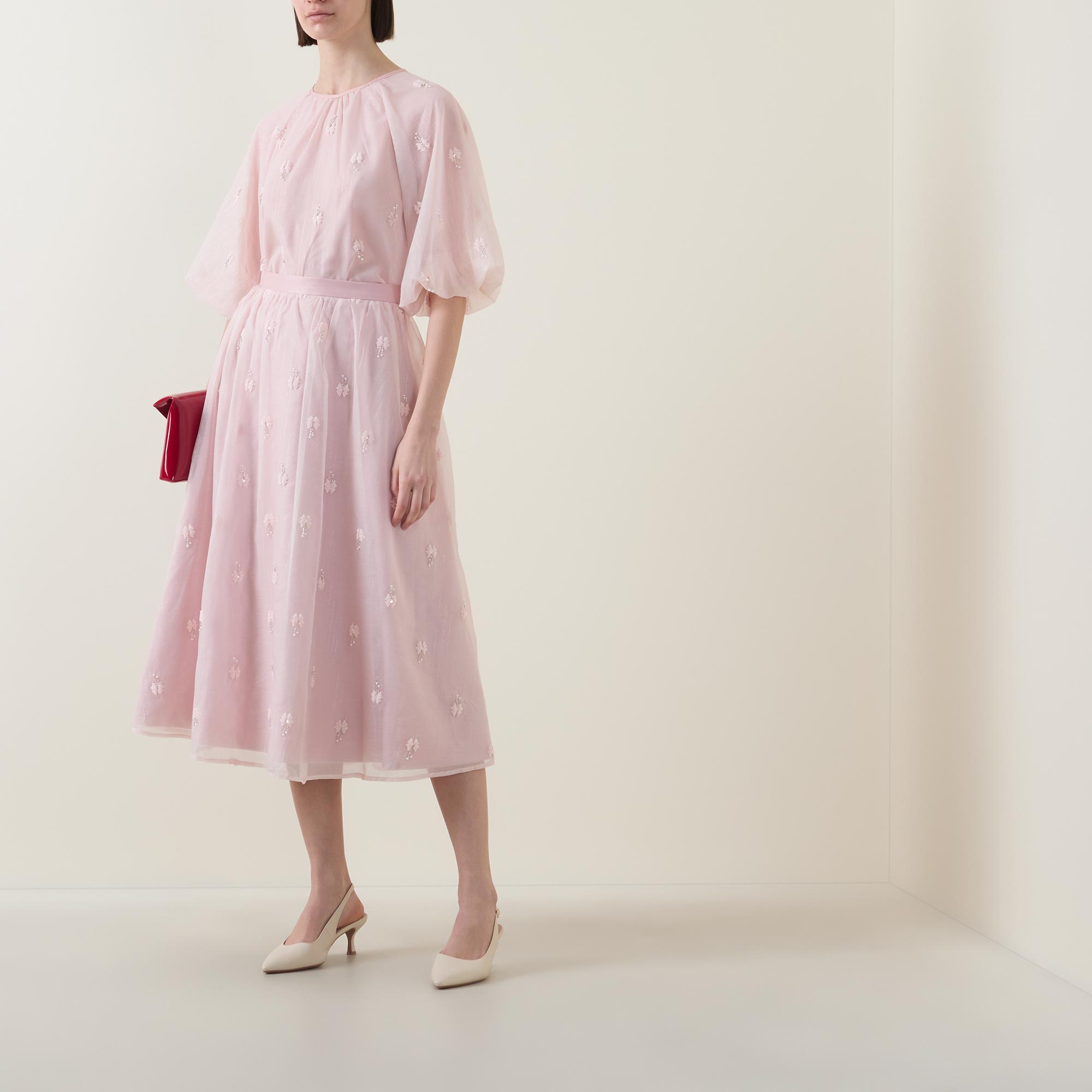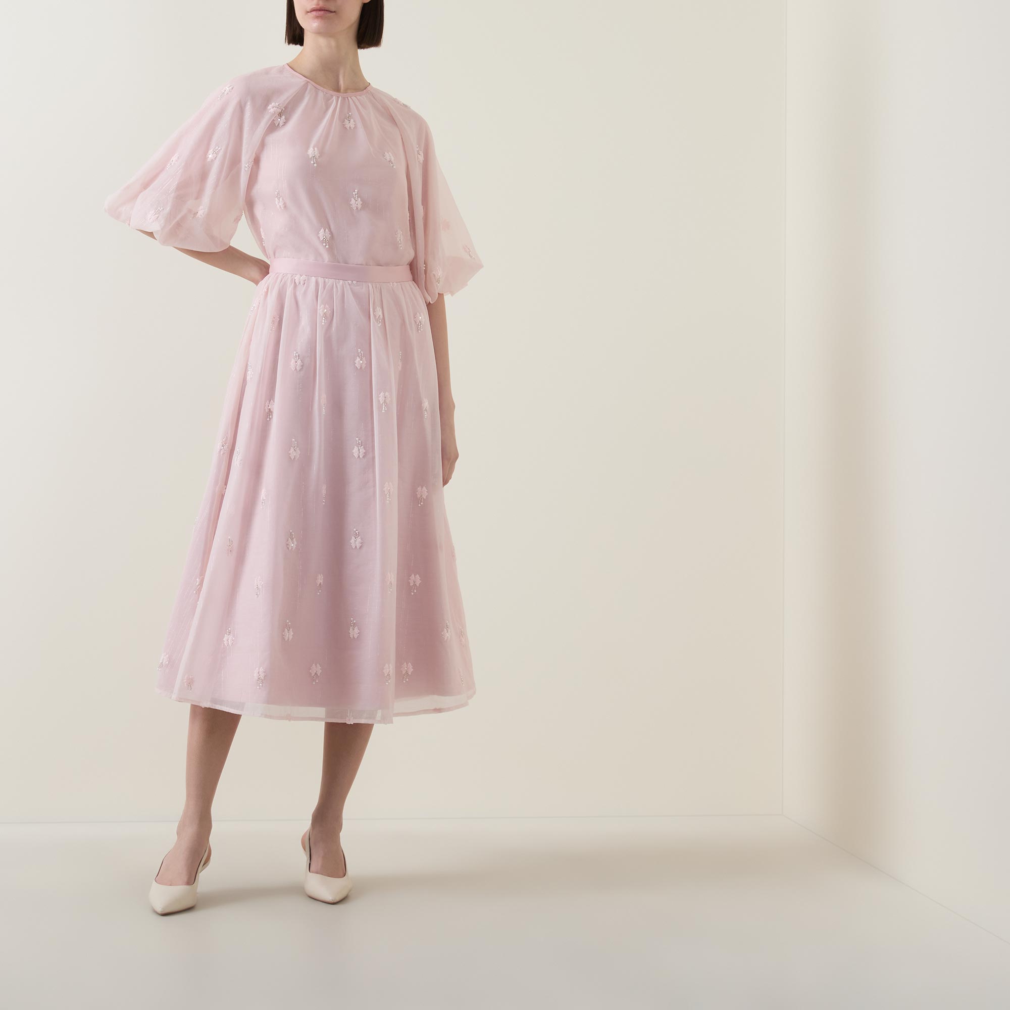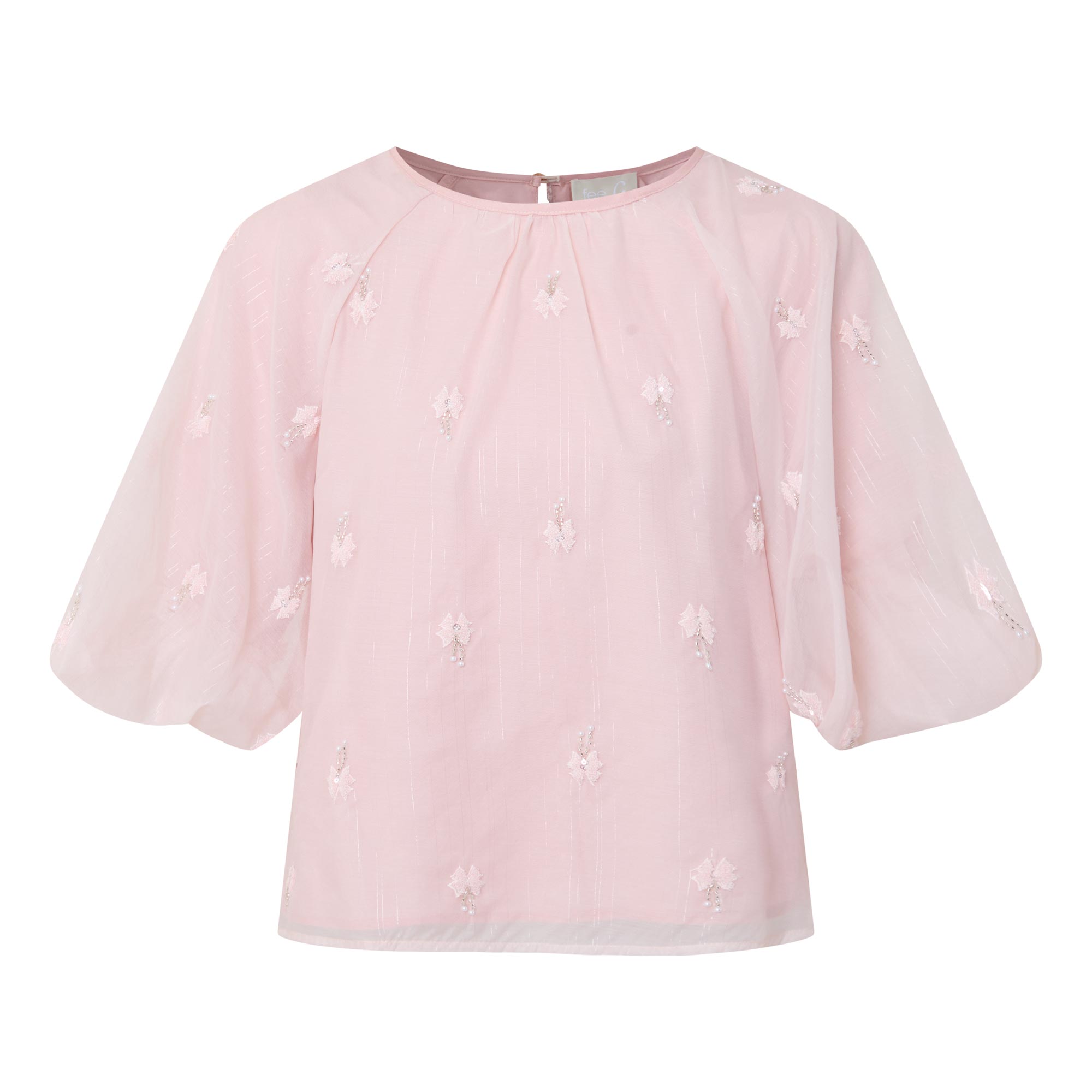 - Round pleated neckline, rear keyhole and button fastening, half length sleeves, elasticated cuffs, slightly flared hem, embellished detailing throughout, semi-sheer overlay, lined