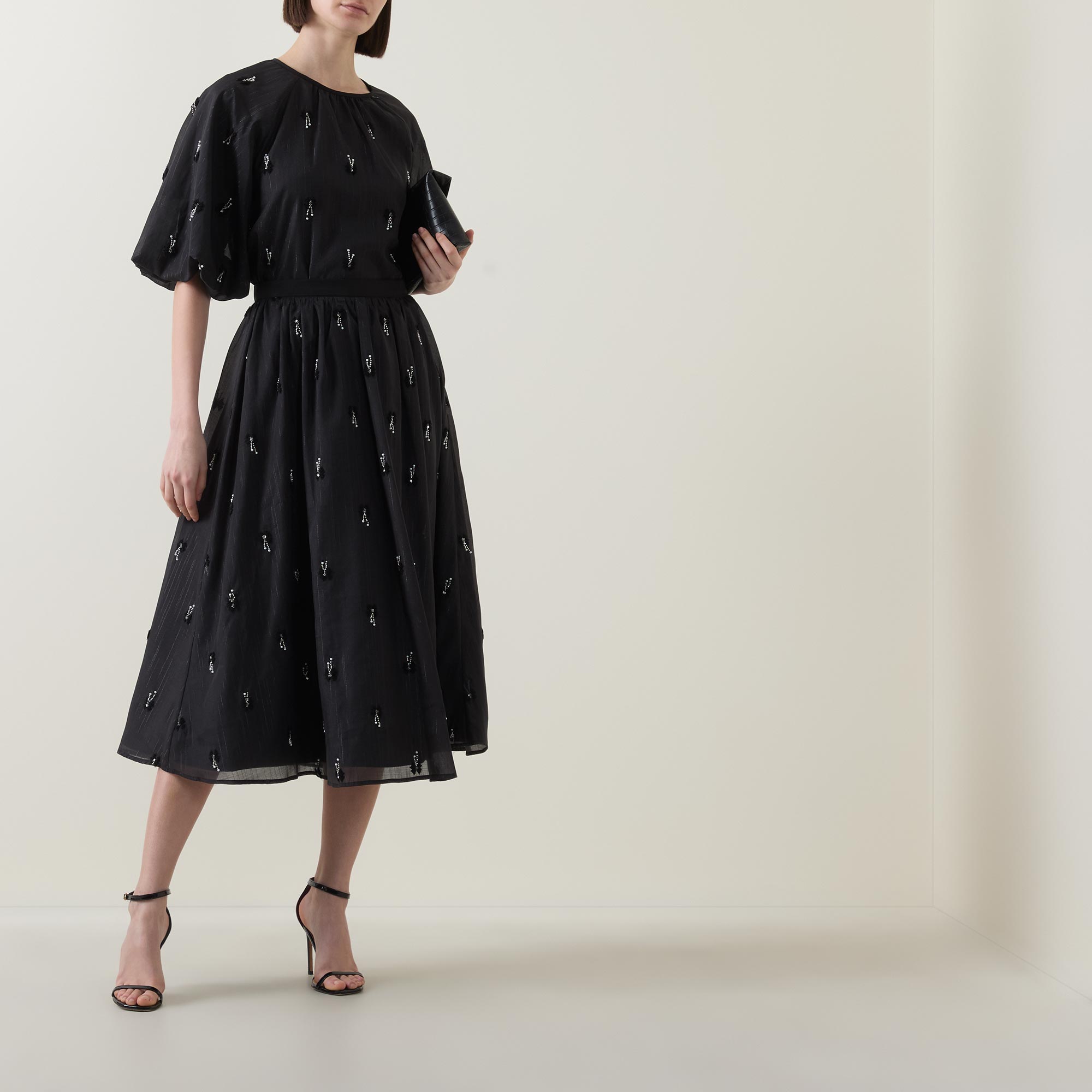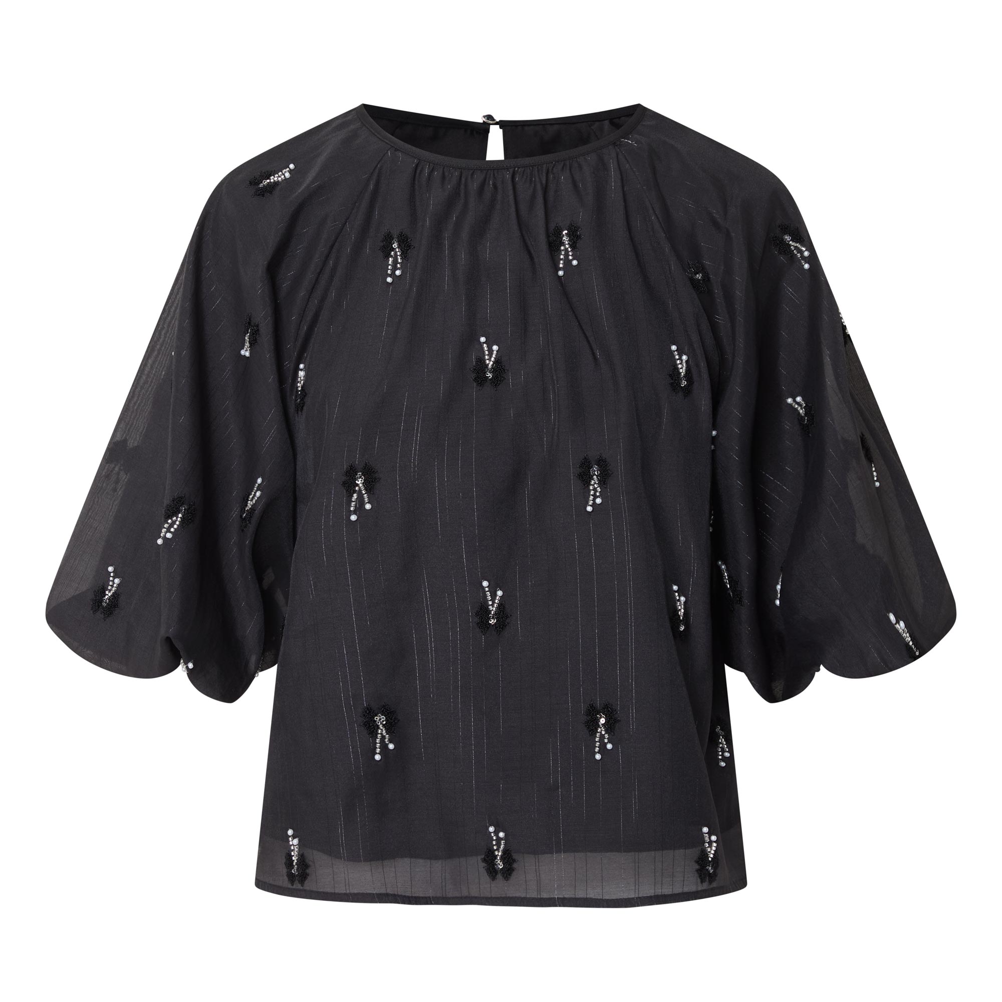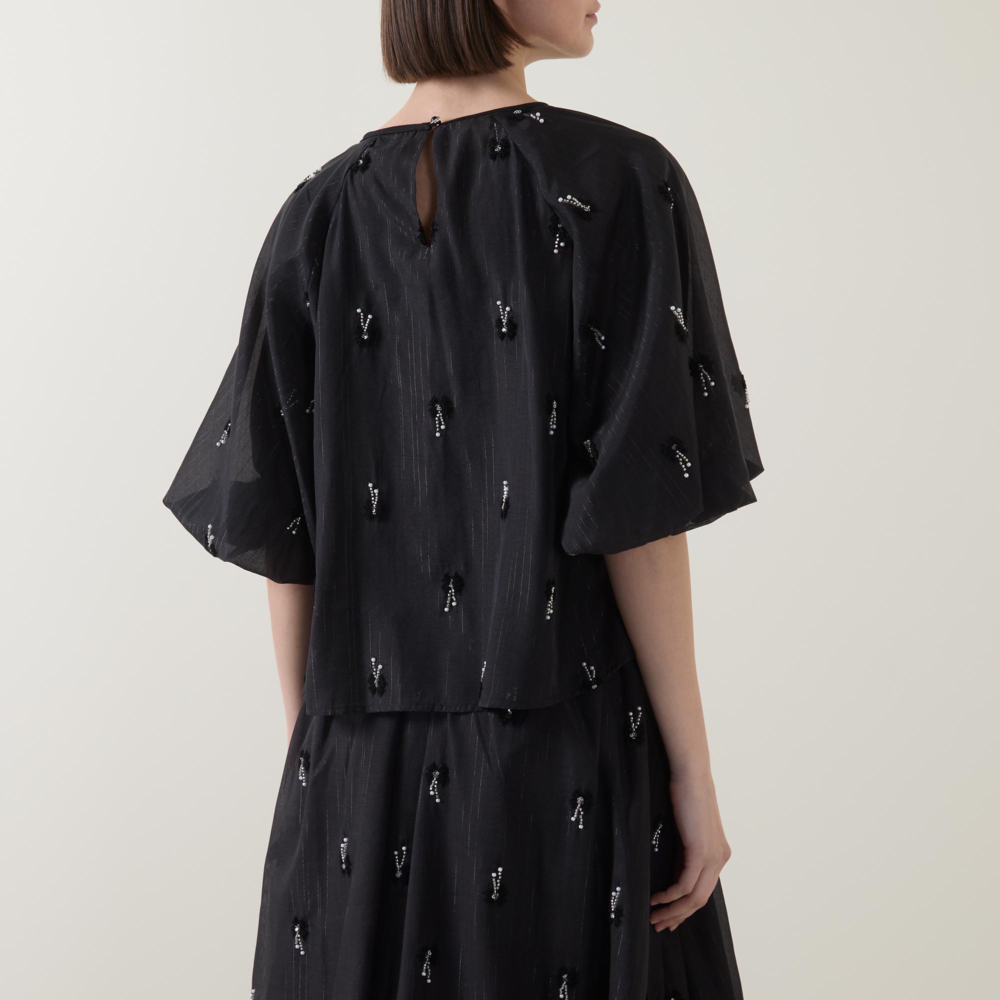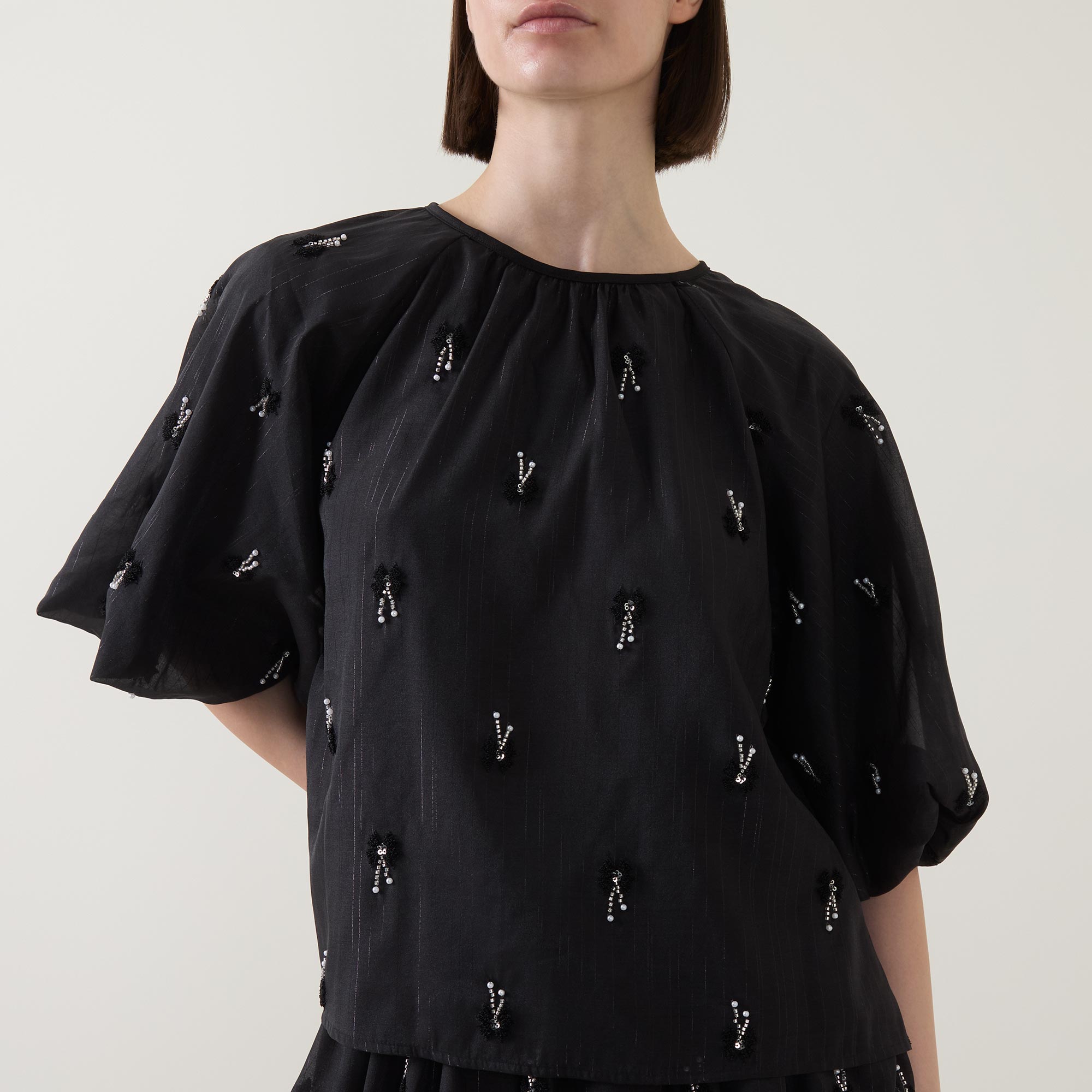 - Round pleated neckline, rear keyhole and button fastening, half length sleeves, elasticated cuffs, slightly flared hem, embellished detailing throughout, semi-sheer overlay, lined