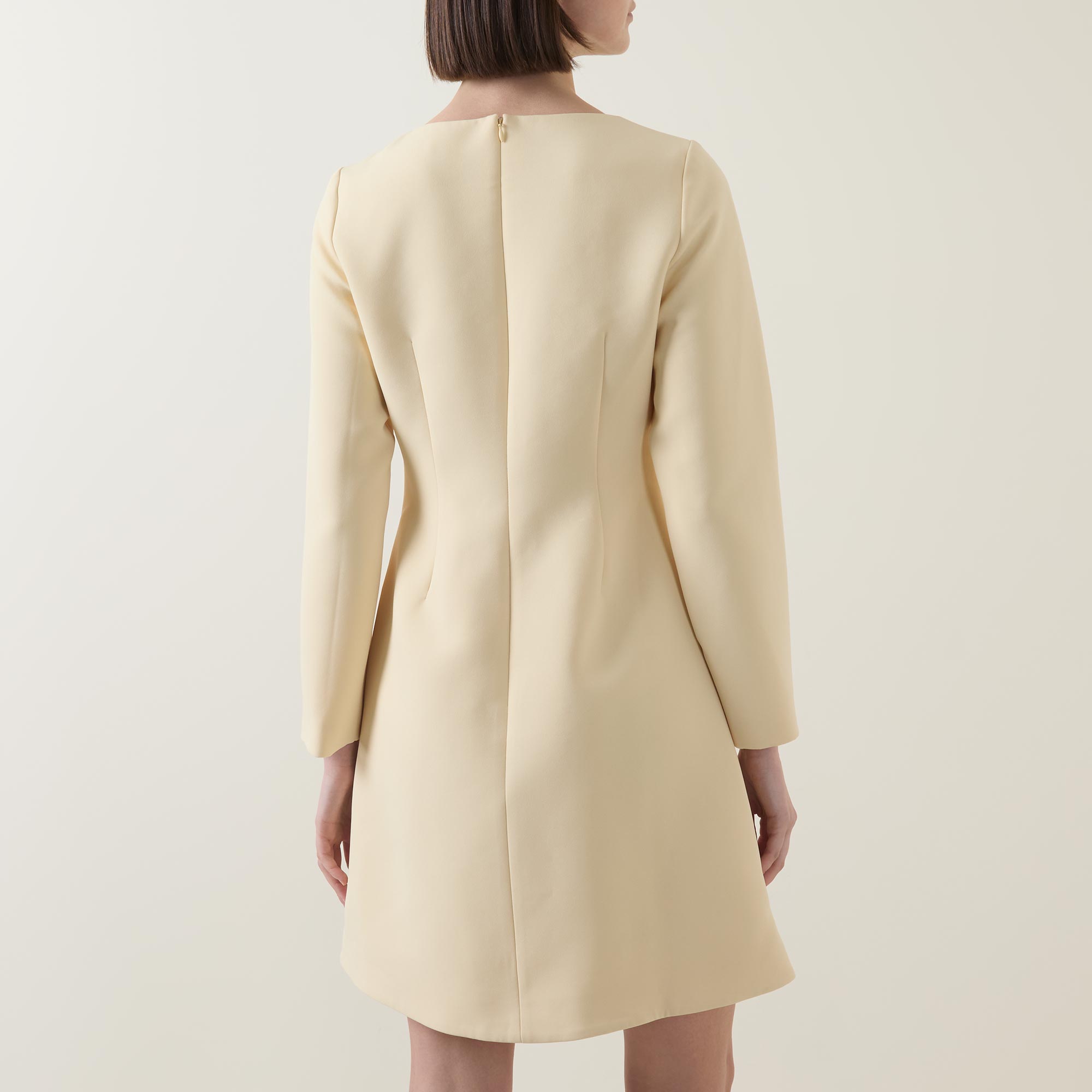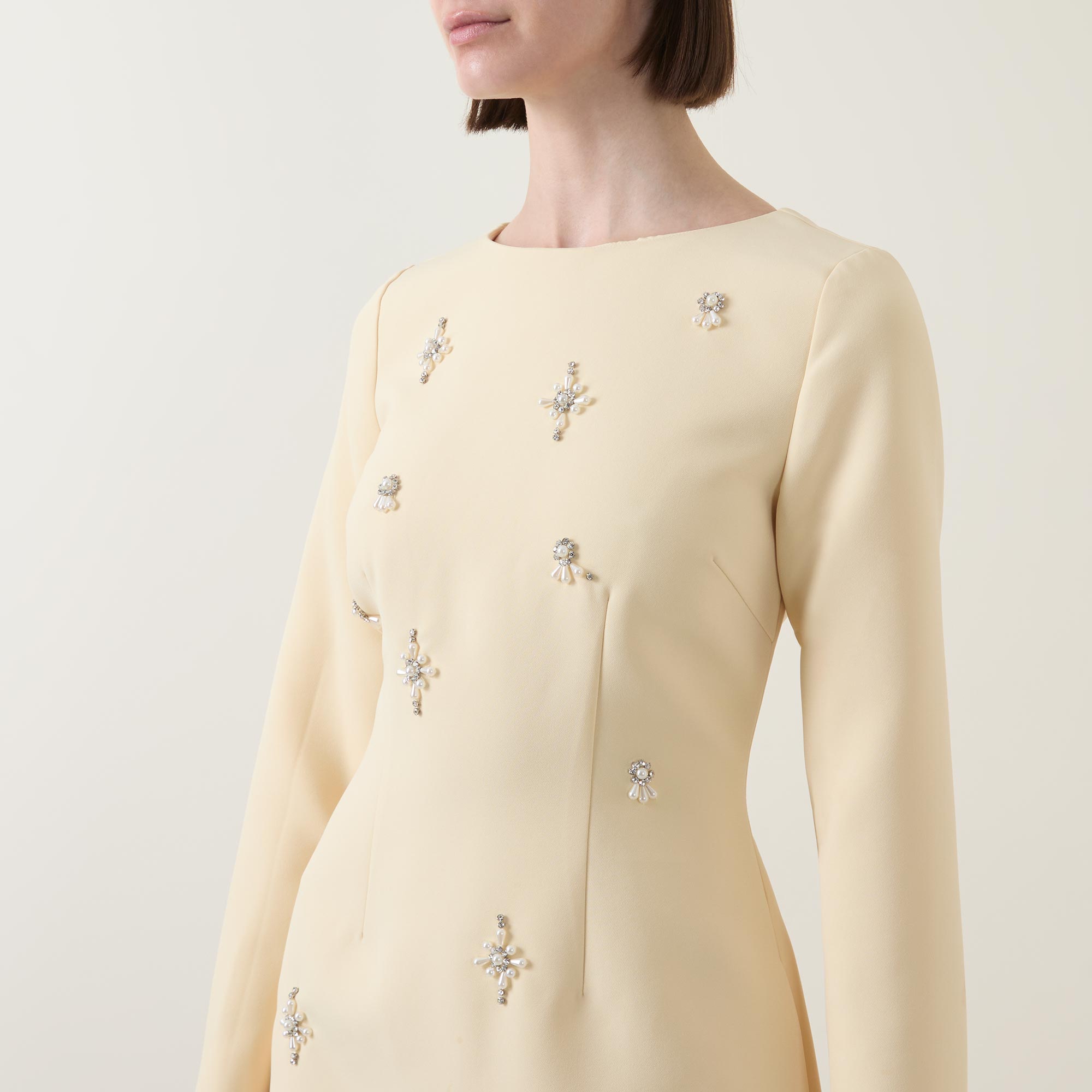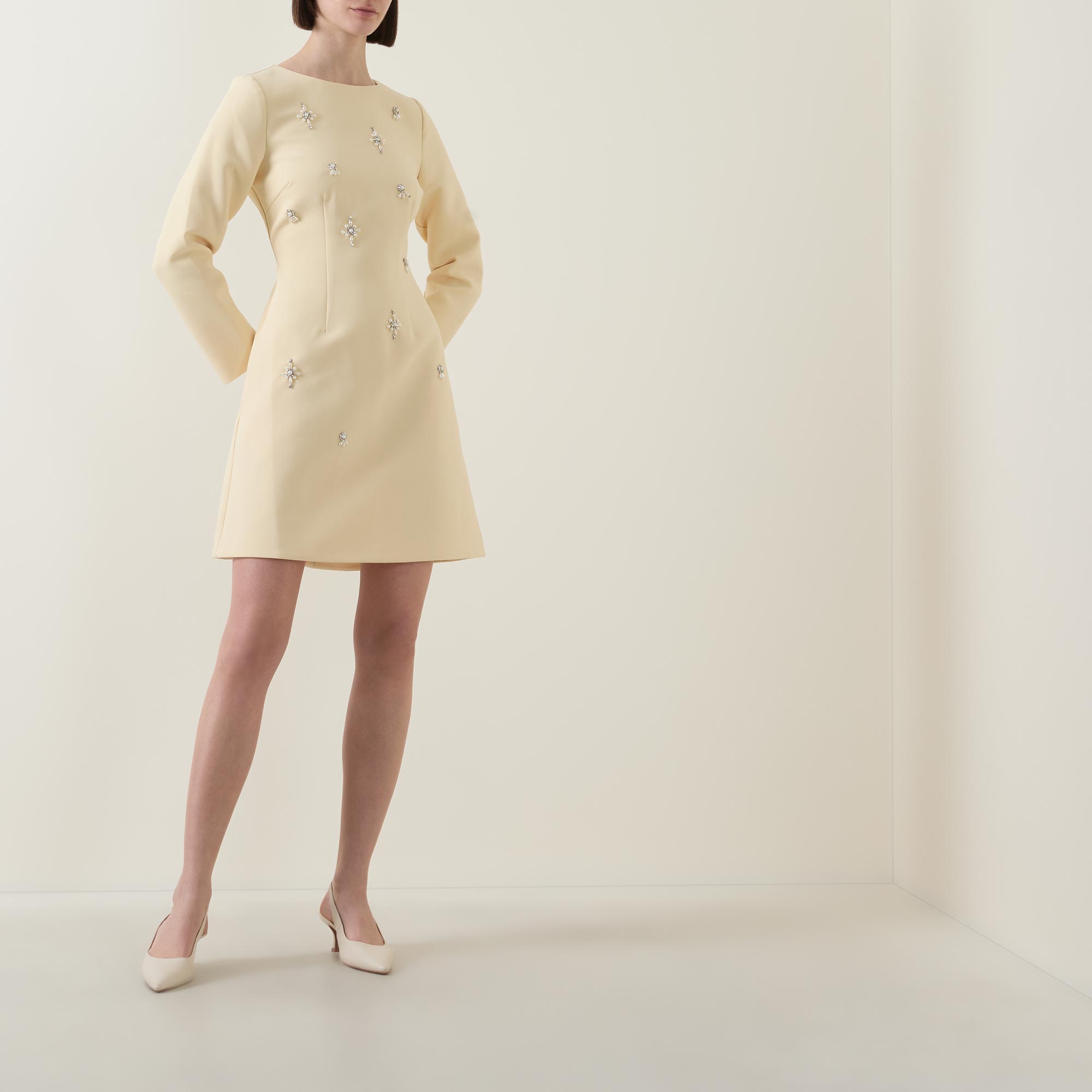 - Round neckline, long sleeves, rear zip fastening, fitted through the waist, slightly flared skirt, straight hem, embellished detailing, mini length, lined